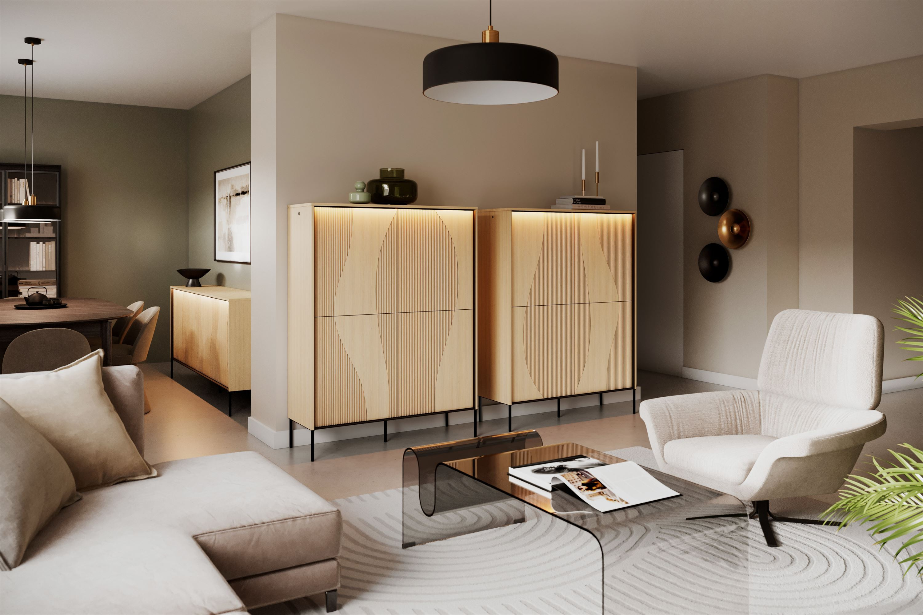 Odkryj subtelną elegancję i funkcjonalność z komodą FLOW FW-02, która stanie się centralnym punktem Twojego wnętrza. Wykończenie w dębie Vincenza oraz nowoczesne detale czarnego matu nadają meblowi wyjątkowy charakter, idealnie wpasowujący się zarówno w przestrzenie klasyczne, jak i nowoczesne. Dzięki oświetleniu, które wydobywa piękno drewnianych frontów, stworzysz niepowtarzalny klimat w swoim salonie lub sypialni, podkreślając styl i osobowość swojego domu.