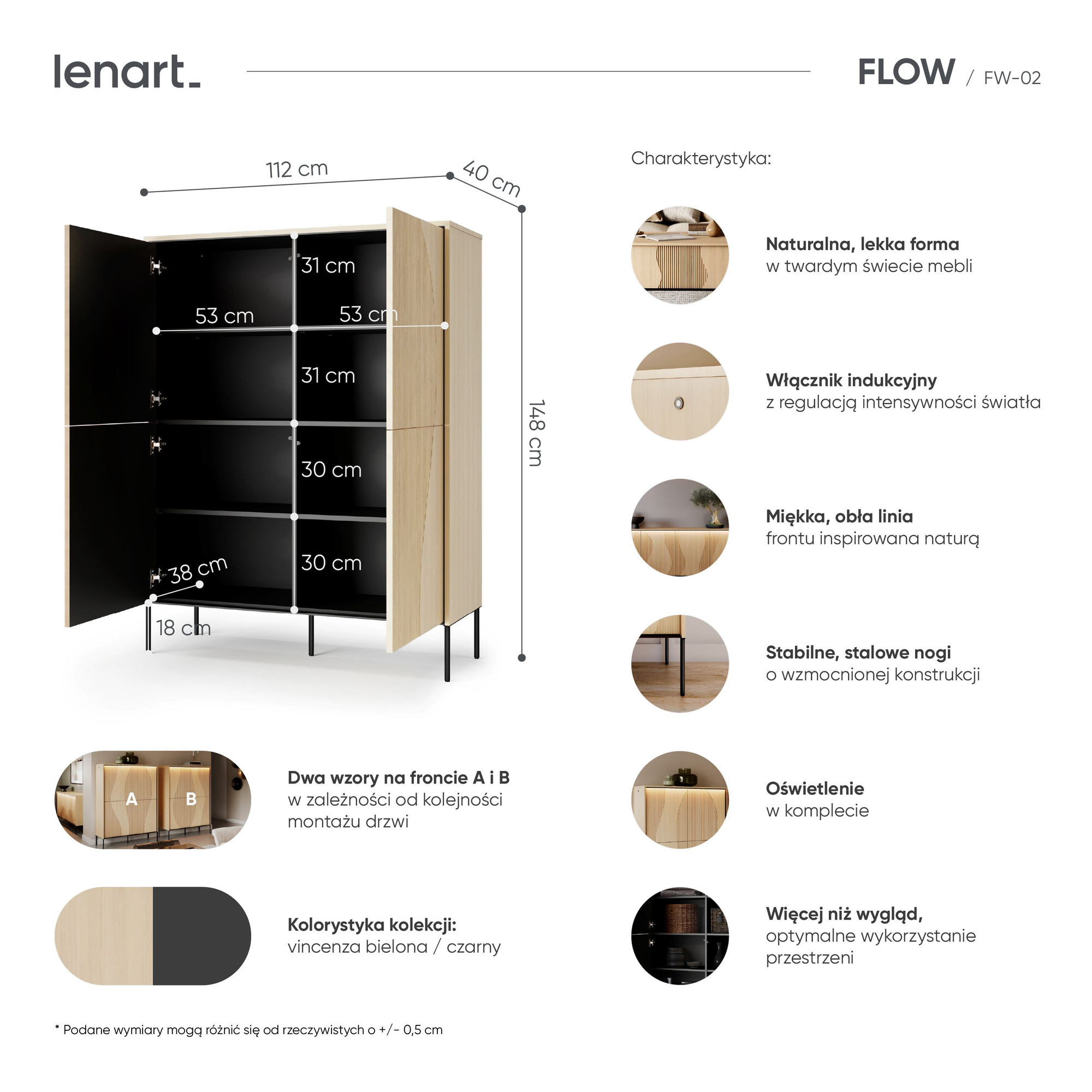 - Odkryj komodę FLOW FW-02 od Lenart – połączenie elegancji i funkcjonalności. Wykończenie w bielonym dębie Vincenza oraz czarne matowe półki dodają nowoczesnego charakteru. Wbudowane oświetlenie tworzy przytulny klimat, idealny do każdego wnętrza.