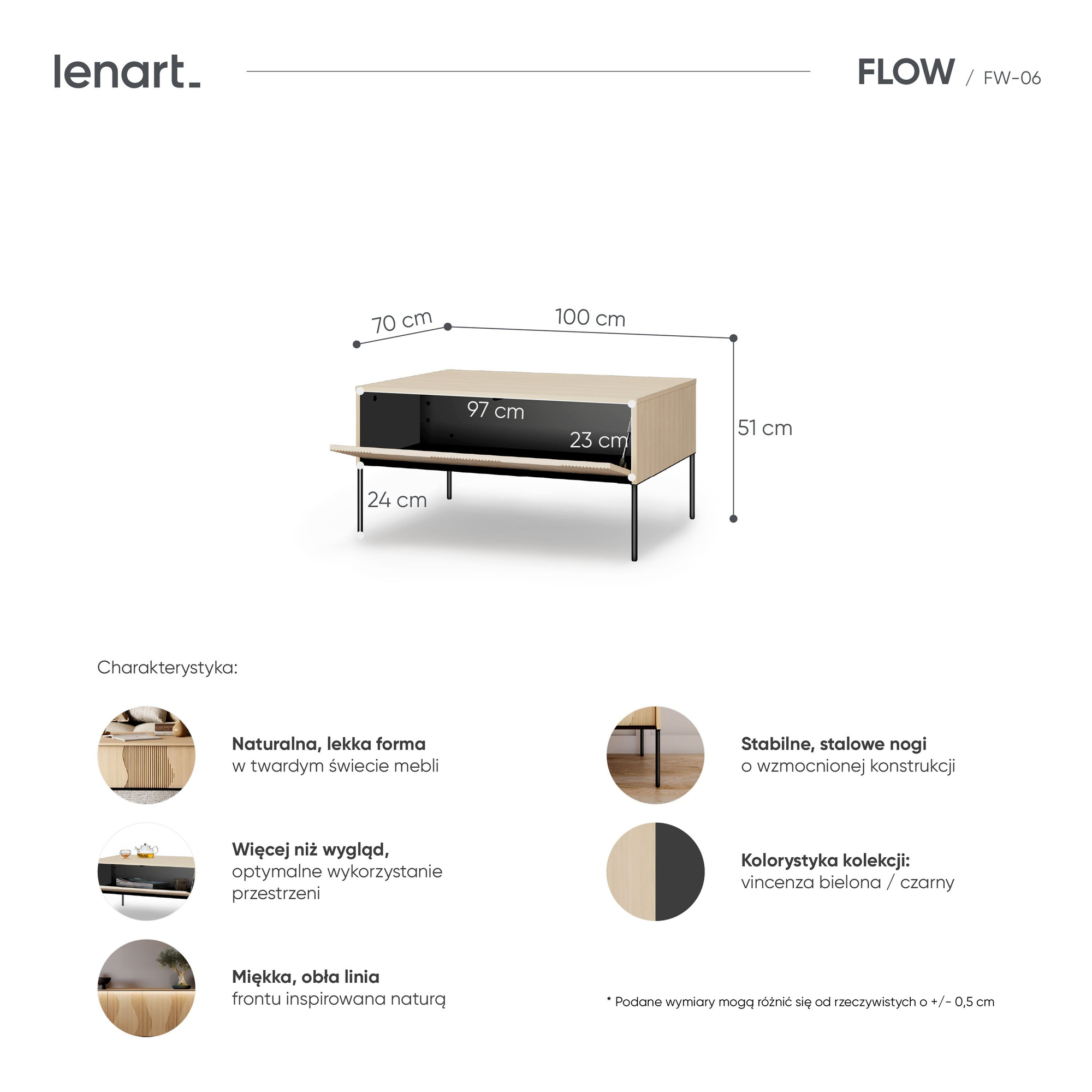 Szerokość 100 cm, wysokość 51 cm oraz głębokość 70 cm sprawiają, że FLOW FW-06 jest idealnym rozwiązaniem, które można łatwo wkomponować w mniejsze jak i większe przestrzenie. Dzięki prostemu montażowi każdy poradzi sobie z jego złożeniem, co sprawia, że zakup tego stolika jest nie tylko praktyczny, ale i przyjemny.