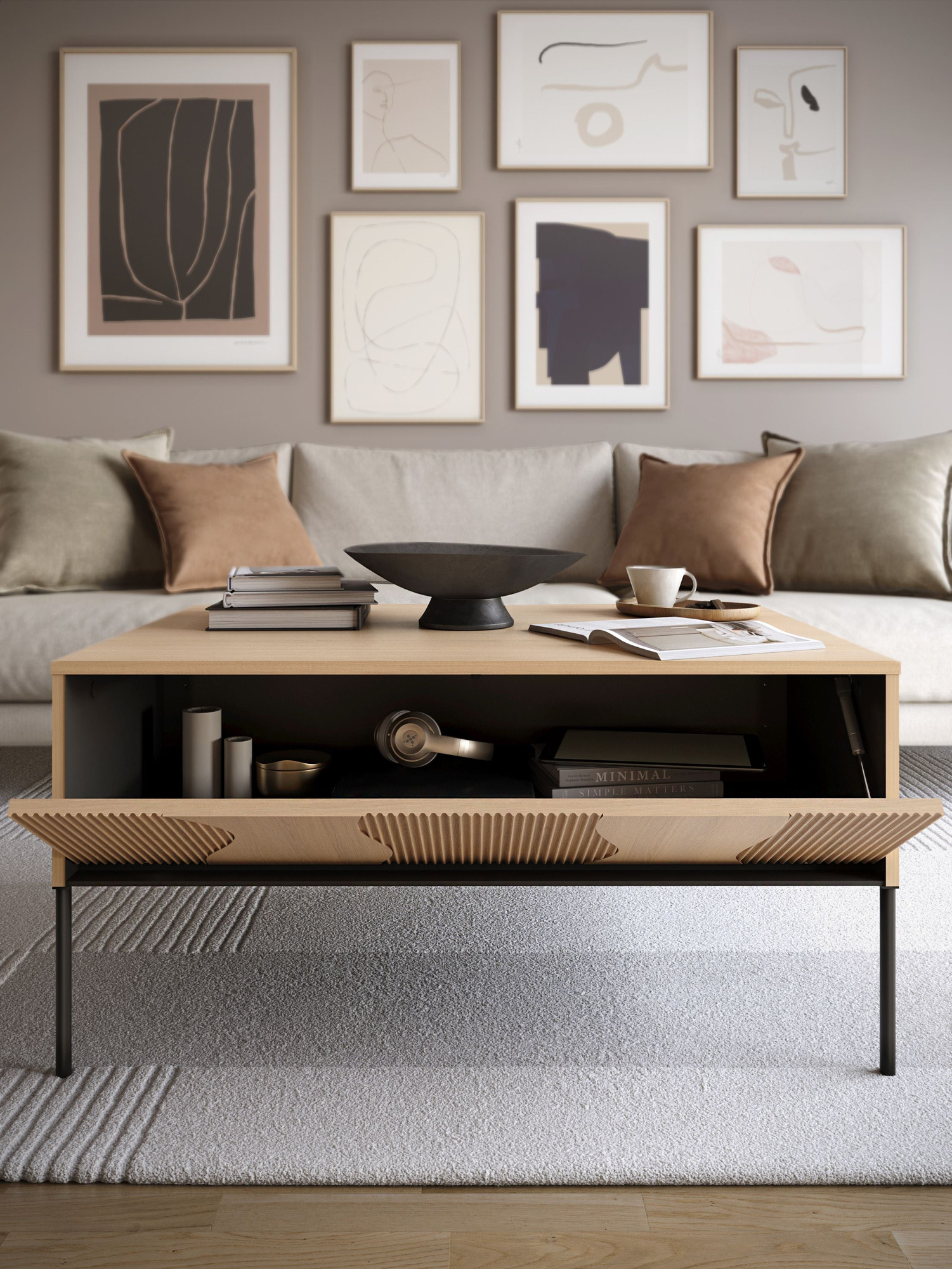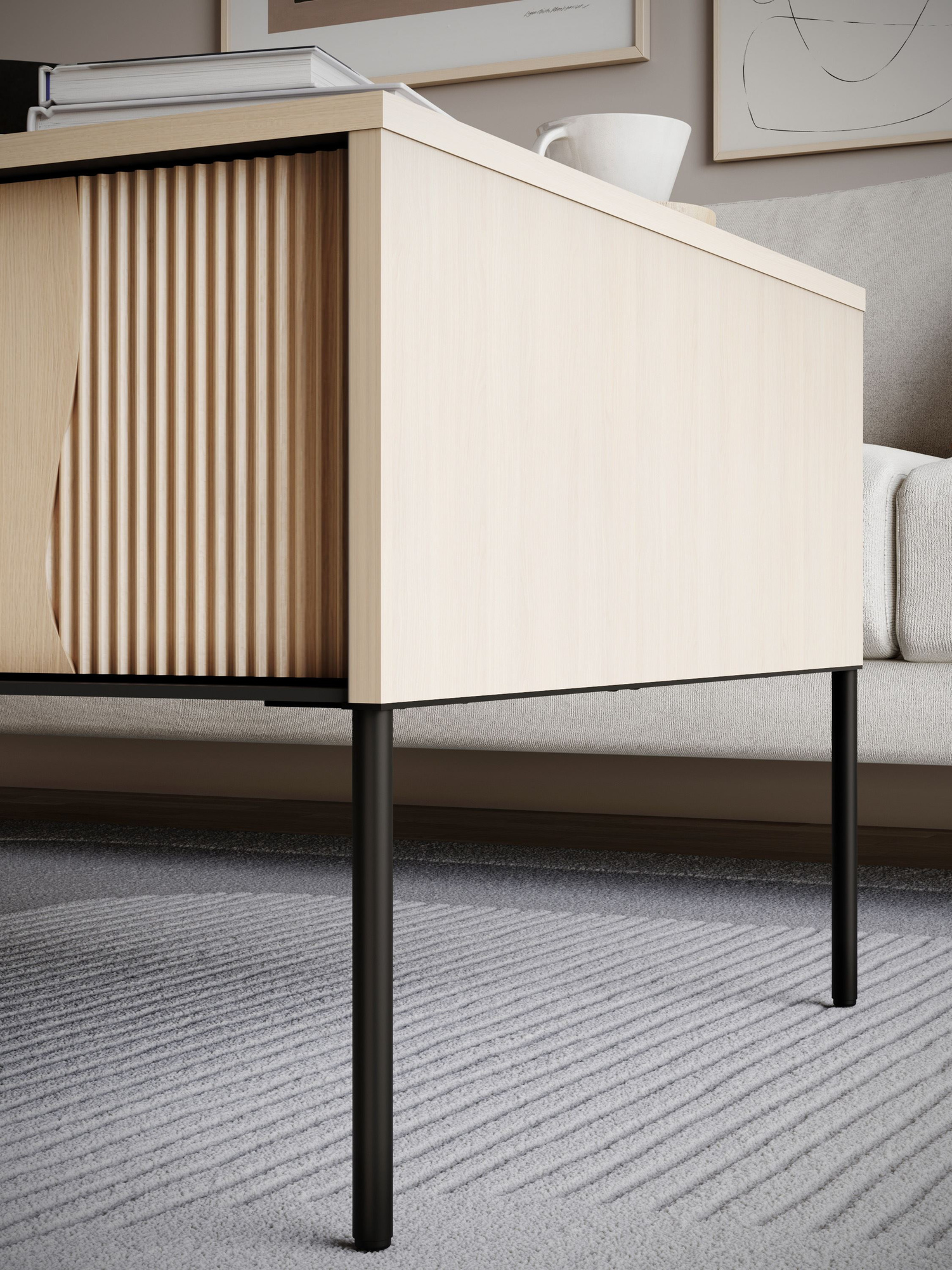 Stolik kawowy FLOW FW-06 łączy elegancję dębu vincenza w bielonym wykończeniu z nowoczesnym czarnym matowym detalem. Funkcjonalny i stylowy, doskonale wpisuje się w każdą przestrzeń dzienną, zapewniając idealne miejsce na napoje i dekoracje.