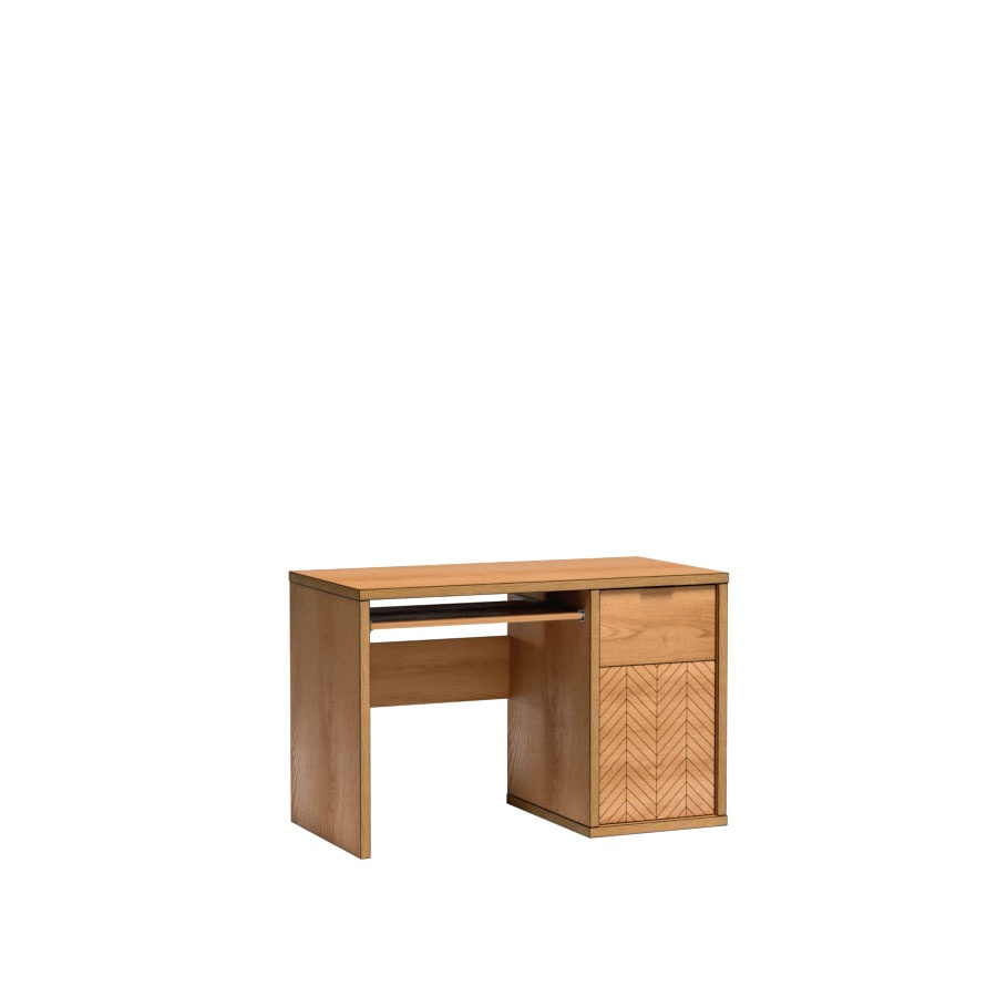 Biurko FONTI-14 w kolorze dąb karmel to idealny wybór do pokoju młodzieżowego lub biura. Oferuje wysuwaną półkę na klawiaturę oraz szafkę z półką, która organizuje przestrzeń. Solidna konstrukcja z płyty laminowanej zapewnia trwałość i stylowy wygląd.