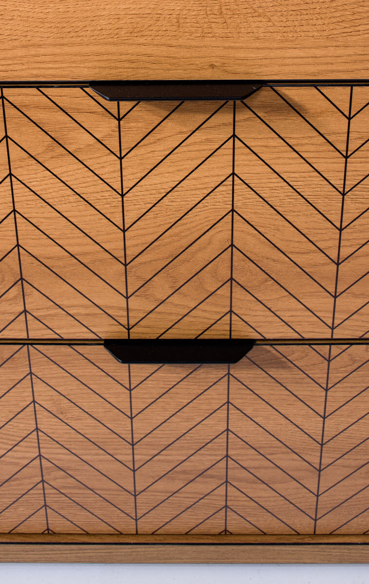Dzięki zastosowaniu płyty laminowanej, komoda FONTI-5 jest nie tylko estetyczna, ale także trwała. Zastosowanie cichych zawiasów zapewnia komfort użytkowania, eliminując głośne trzaskanie drzwiami, co sprawia, że codzienne korzystanie z mebla stało się jeszcze przyjemniejsze. Dodatkowo, nowoczesne metalowe uchwyty w klasycznej czerni nadają komodzie eleganckiego, a zarazem nowoczesnego wyrazu.