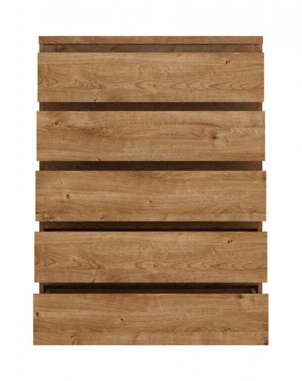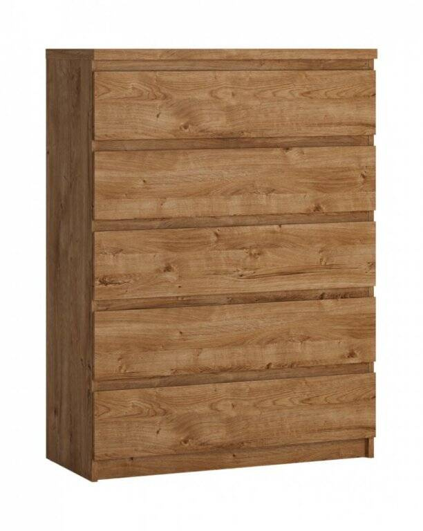 - Praktyczna komoda Fribo FRIK06 w kolorze Dąb Ribbeck Złoty, posiada 5 pojemnych szuflad z pełnym wysuwem. Nowoczesny design bez uchwytów i naturalny wygląd, idealna do organizacji przestrzeni.