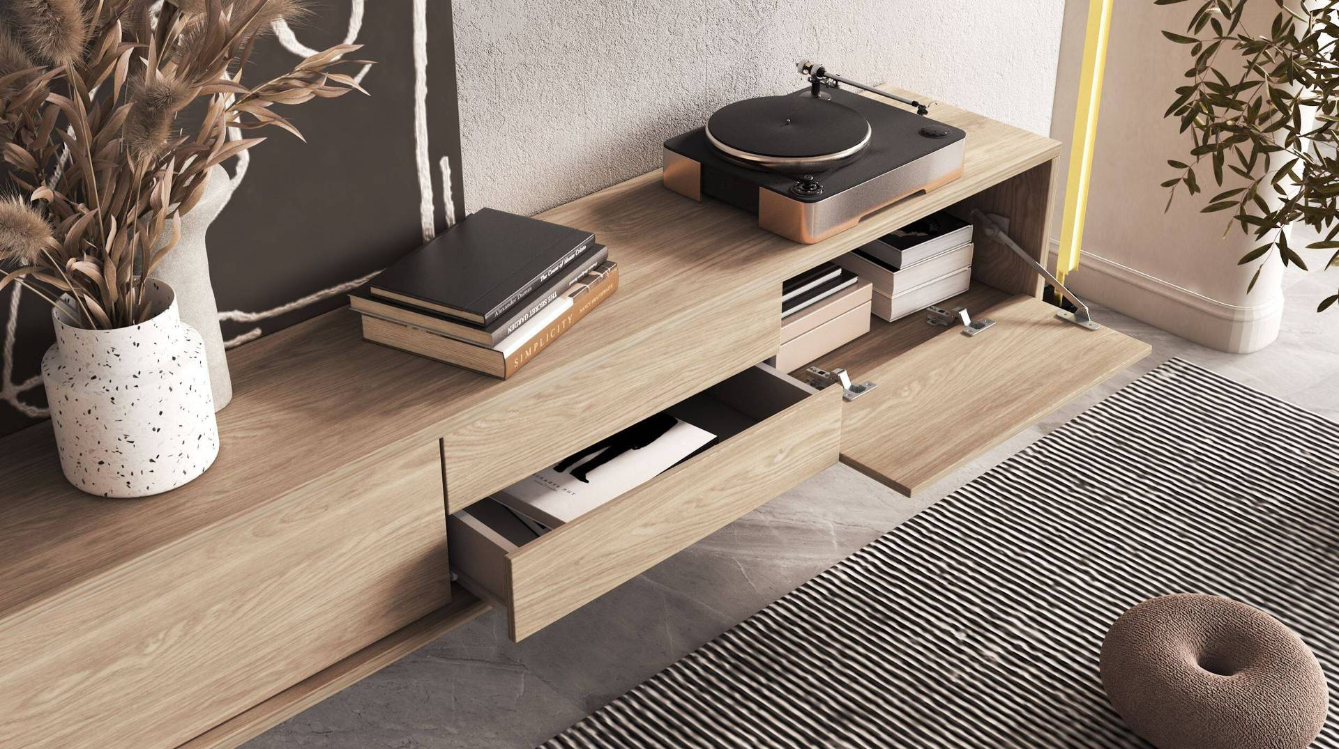 Funkcjonalność to kolejny atut tej komody RTV. Dzięki systemowi otwierania „Push to open”, korzystanie z niej jest niezwykle komfortowe i intuicyjne, a jednocześnie nie zaburza jej prostych linii. To idealne rozwiązanie dla tych, którzy cenią sobie nowoczesne technologie w harmonii z klasycznym designem.