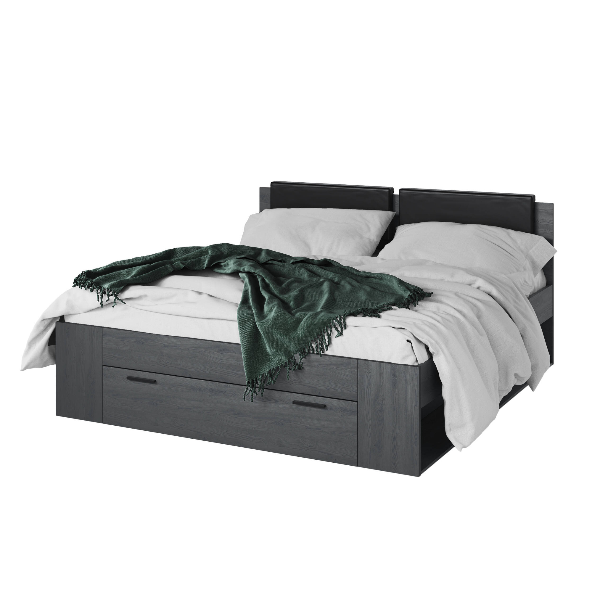 Łóżko Galaxy z serii mebli Helvetia to doskonały wybór dla osób ceniących nowoczesny design i funkcjonalność. Wykonane z wysokiej jakości laminowanej płyty meblowej w kolorze Carbon świetnie komponuje się z różnymi paletami barw oraz stylem aranżacji. Solidna konstrukcja gwarantuje trwałość użytkowania, a subtelne linie mebla dodają elegancji do każdego wnętrza.