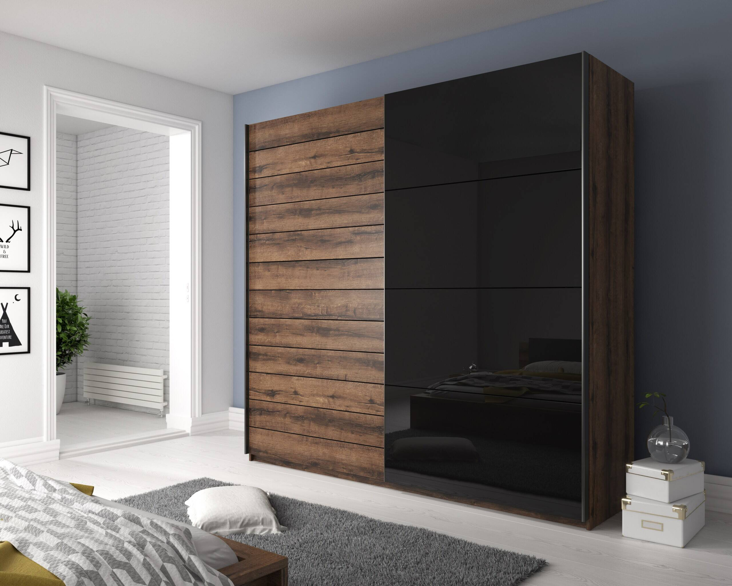 Elegancka szafa Galaxy 2D w odcieniu Dąb Monastery z czarnym połyskiem. Przesuwne drzwi otwierają dostęp do funkcjonalnego wnętrza z drążkiem i półkami, wykonane z trwałej płyty laminowanej.