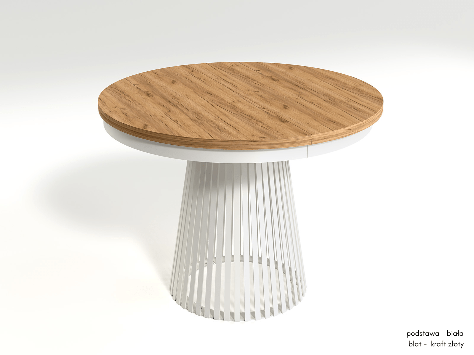 Stół GARDA to idealne połączenie stylu i funkcjonalności. Okrągły, rozkładany blat z płyty laminowanej w odcieniu kraft złoty i solidna, biała metalowa podstawa nadają wnętrzu elegancji. Doskonały do każdego nowoczesnego lub klasycznego pomieszczenia.