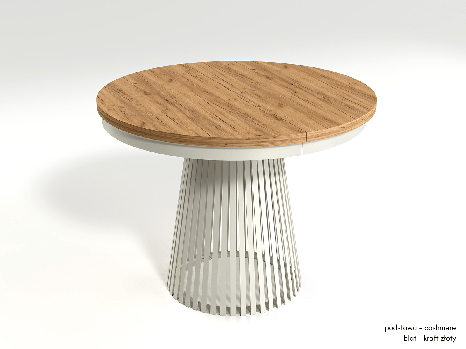 Stół GARDA łączy elegancję z funkcjonalnością. Okrągły, rozkładany blat z laminatu Kraft Złoty wyróżnia się nowoczesnym stylem, a ażurowa podstawa w kolorze Cashmere dodaje lekkości. Idealny do każdego wnętrza! Montaż własny.