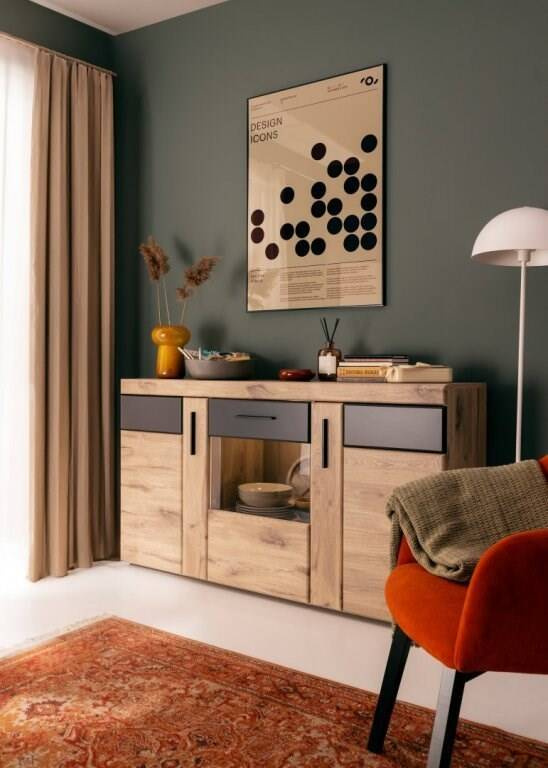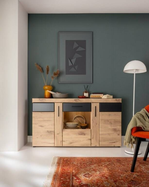 - Komoda Grano GRNK02 łączy elegancję i funkcjonalność dzięki połączeniu Dębu Viking i Szarego Kosmosu. Trzydrzwiowy design z hartowanym szkłem Antisol, cichym domykiem oraz opcjonalnym oświetleniem. Idealna do nowoczesnych wnętrz.