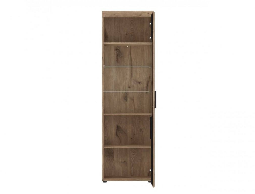 Centralny punkt witryny stanowi szklany front z hartowanego szkła Antisol w kolorze szarym, który nie tylko dodaje meblowi nowoczesnego wyglądu, ale również chroni przechowywane w nim przedmioty. Szklane półki są doskonałym miejscem do eksponowania najcenniejszych dodatków i ozdób. Z kolei opcjonalne oświetlenie sprawi, że witryna będzie prezentować się zjawiskowo nawet po zmroku, tworząc przyjemny i kameralny nastrój.