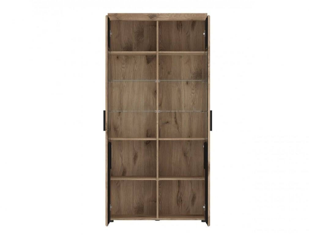 Design witryny jest przemyślany, aby wpasować się w różnorodne style aranżacyjne, od nowoczesnych po klasyczne. Fronty wykonane z solidnej płyty MDF, wykończone w kolorystykę Dąb Viking, przyciągają wzrok i nadają wnętrzu eleganckiego wyglądu. Dodatkowym atutem są delikatne elementy w kolorze Szary Kosmos, które dodają głębi i dyskretnej elegancji. Wnętrze witryny, z półkami z niehartowanego szkła, stanowi idealne miejsce do eksponowania ulubionych dekoracji i książek.
