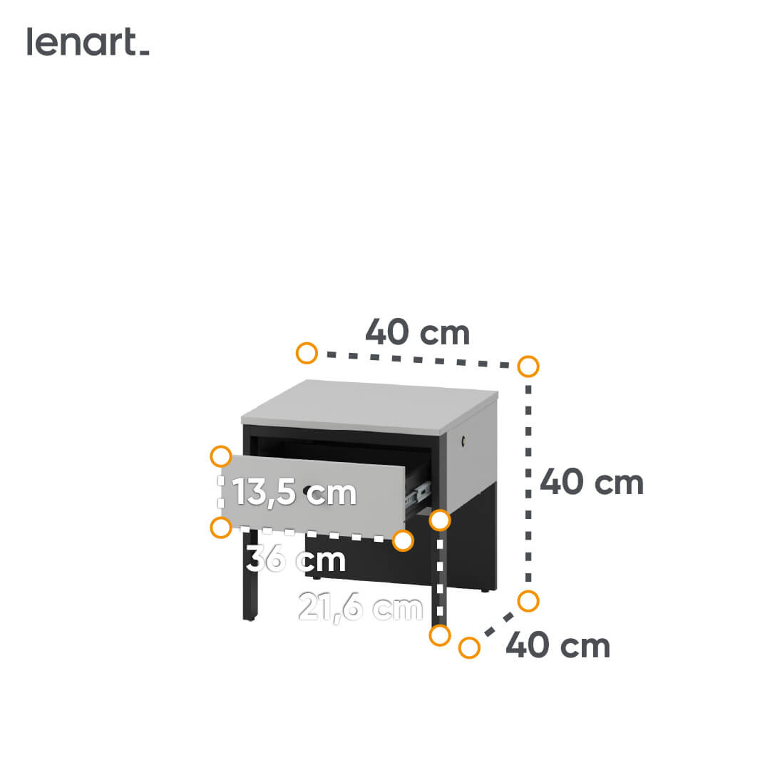 - Elegancki stolik nocny GRIS GS-05 w kolorze szaro-czarnym, wyposażony w funkcjonalną szufladę z oświetleniem LED, doda nowoczesnego stylu sypialni. Wymiary: 40x40x40cm, łatwy montaż, idealny do przechowywania nocnych drobiazgów.