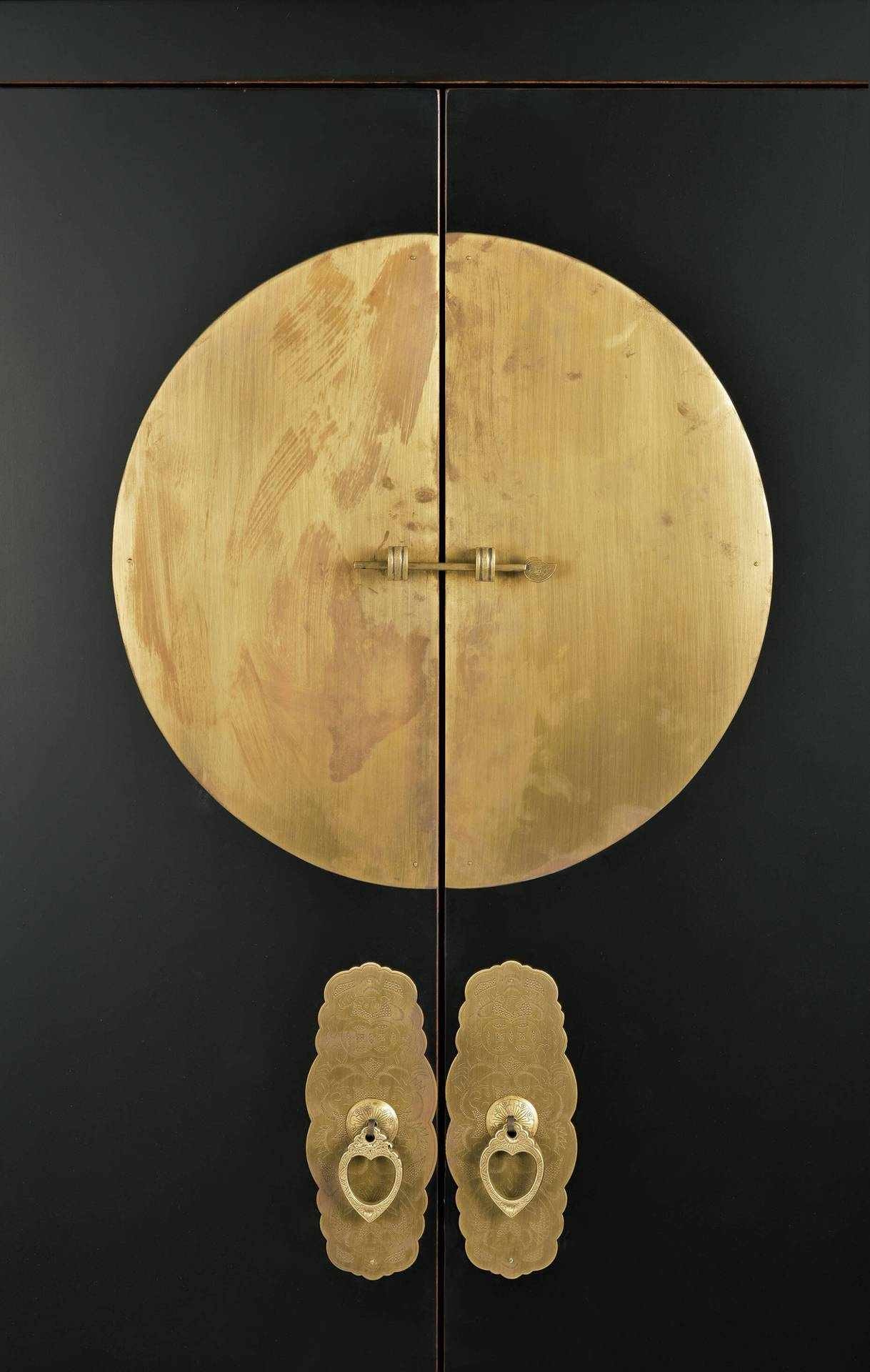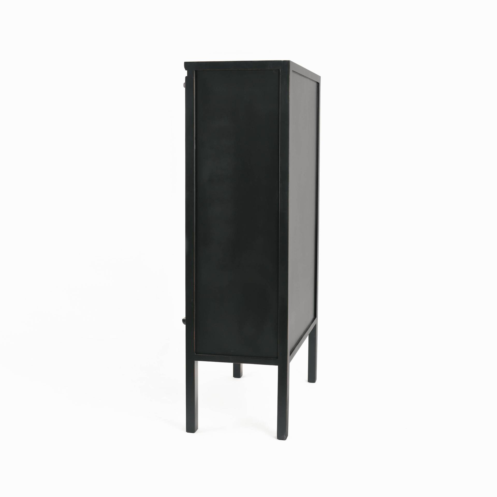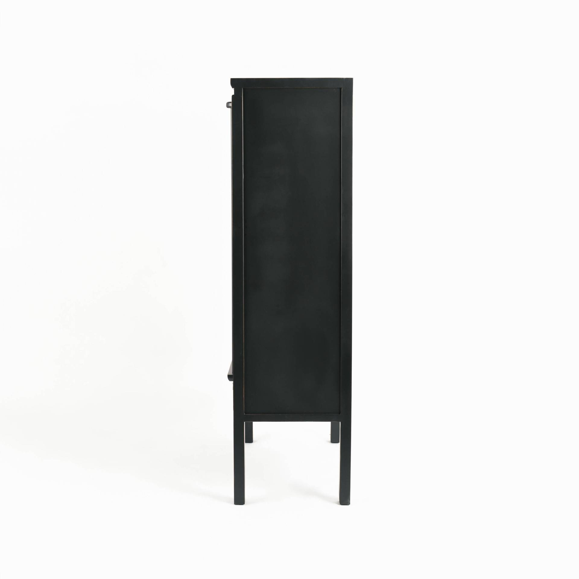 Stylowa szafa Hamilton HT08 z drewna wiązu w kolorze czarnym. Wyróżnia się ozdobnymi złotymi uchwytami i orientalnymi akcentami. Dwie drzwi, szuflady i półki oferują mnóstwo miejsca do przechowywania. Zmontowana, gotowa do użycia.