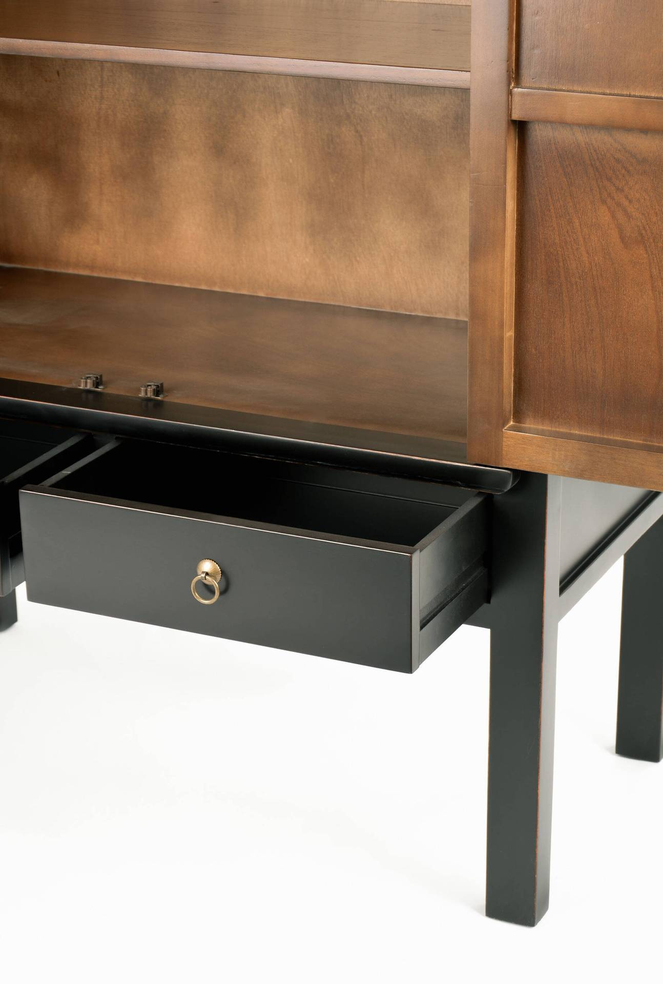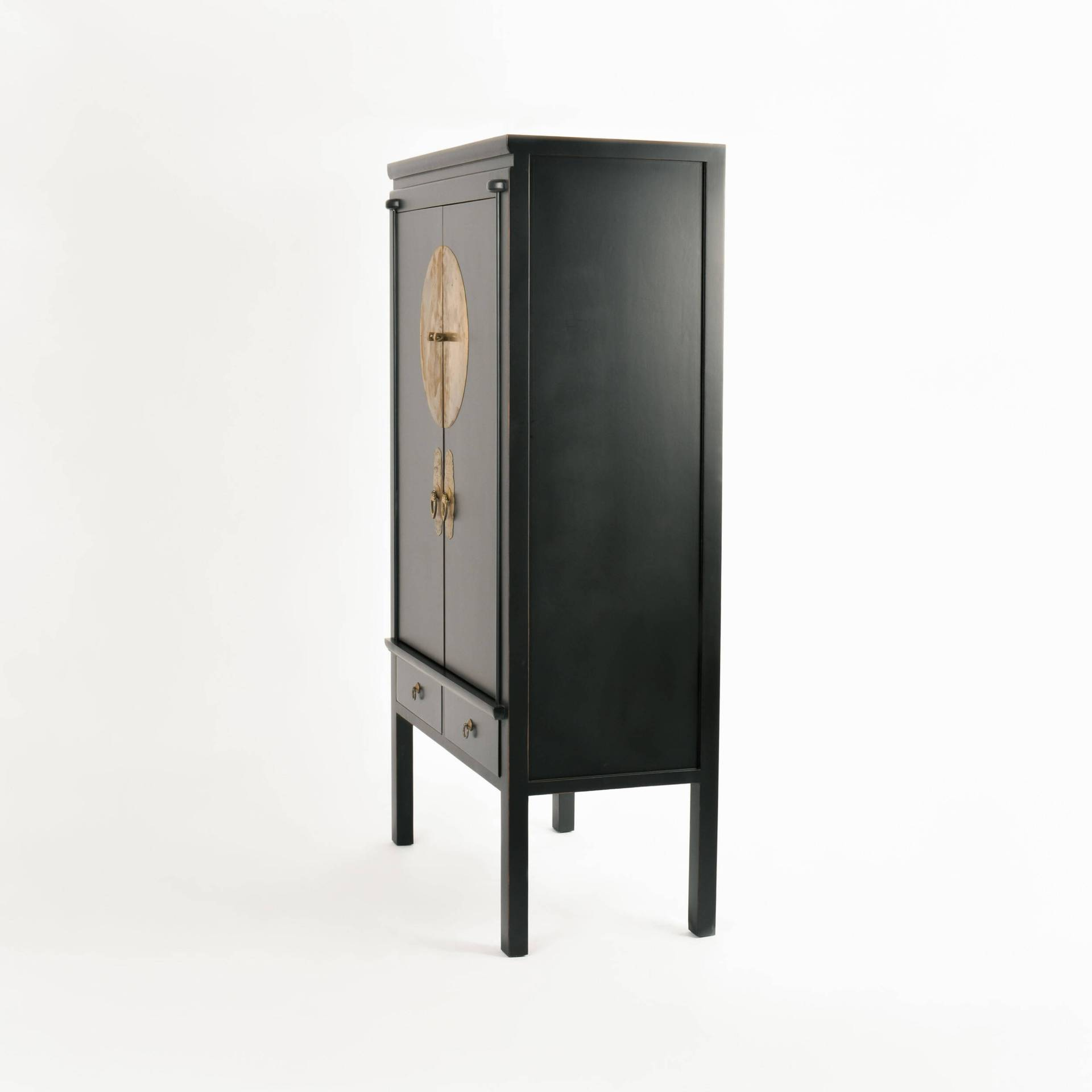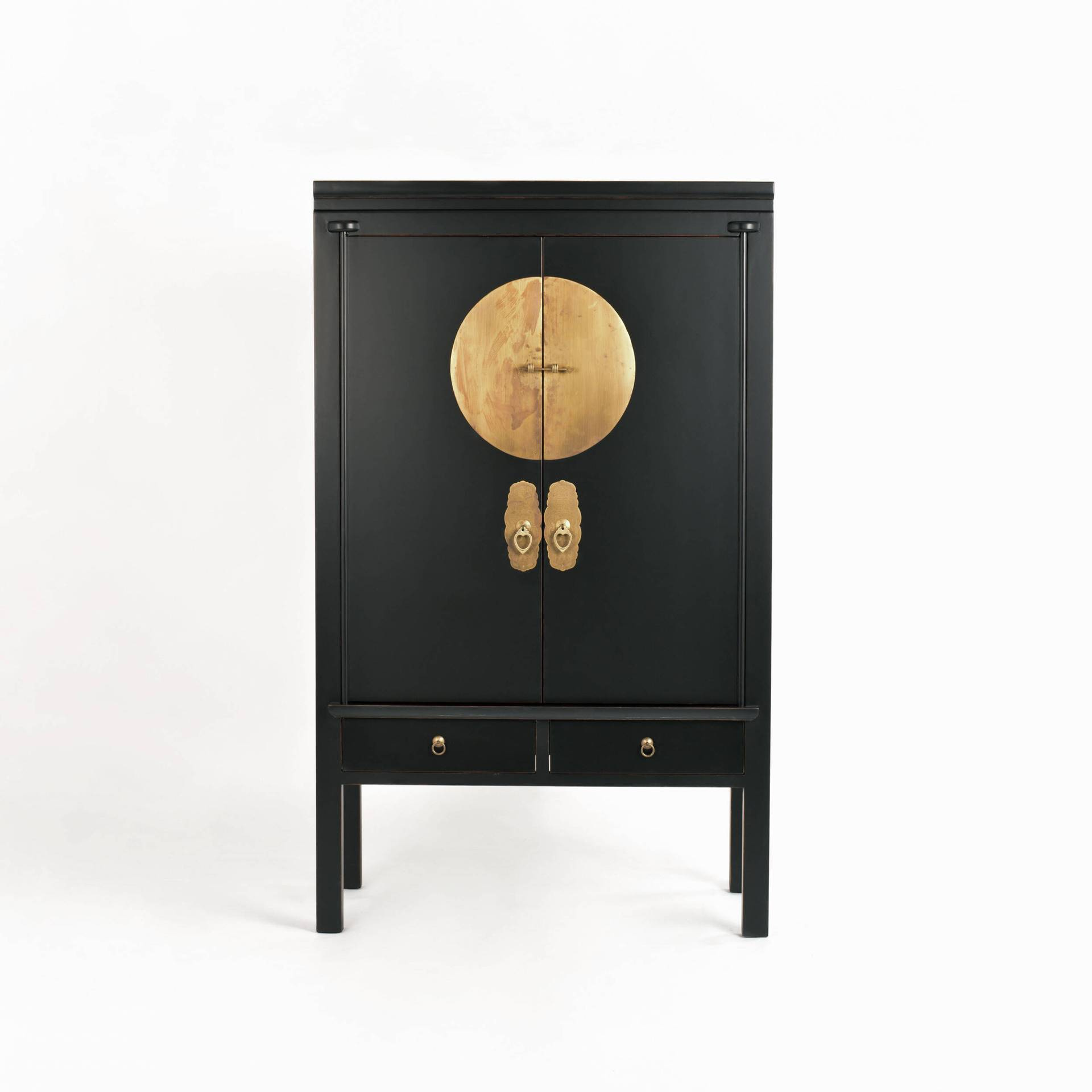 - Stylowa szafa Hamilton HT08 z drewna wiązu w kolorze czarnym. Wyróżnia się ozdobnymi złotymi uchwytami i orientalnymi akcentami. Dwie drzwi, szuflady i półki oferują mnóstwo miejsca do przechowywania. Zmontowana, gotowa do użycia.