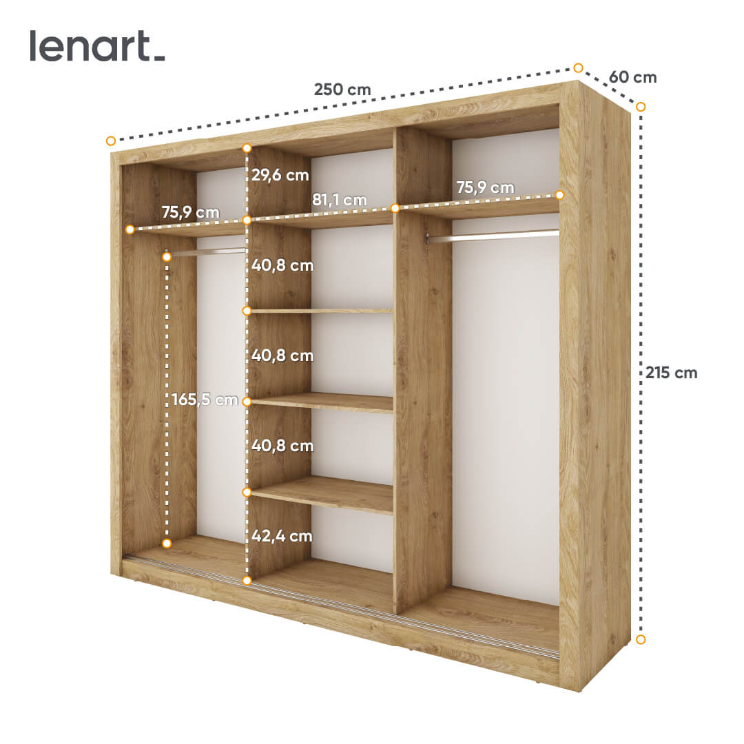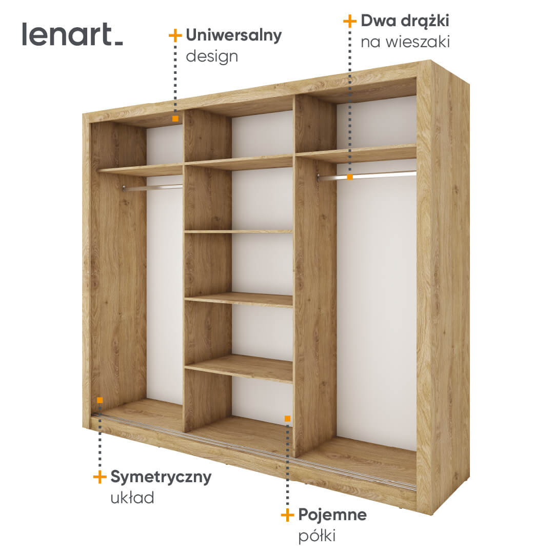 Wykończona w ciepłych, zachęcających tonach dębu o wymiarach szerokości 250 cm, wysokości 215 cm i głębokości 60 cm, szafa IDEA ID-01-3L doskonale komponuje się z różnorodnymi aranżacjami – od surowo minimalistycznych do tych ciepłych i prywatnych.