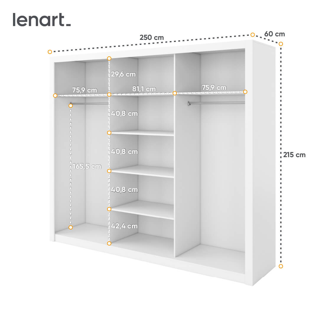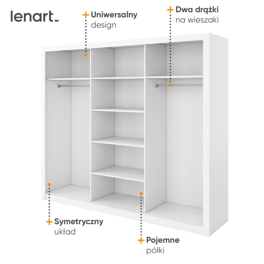Pozwól, że przedstawię niezrównaną szafę przesuwną IDEA ID-01, która z pewnością stanie się centralnym punktem Twojej sypialni, garderoby lub przedpokoju. Jej wyjątkowe parametry, takie jak szerokość 250 cm, wysokość 215 cm i głębokość 60 cm, zapewnią wystarczająco dużo miejsca na wszystkie Twoje ubrania i akcesoria. Wyposażona w trzy drzwi, dwa drążki i sześć półek gwarantuje funkcjonalność i organizację przestrzeni. Dodatkowo, białe lustro nie tylko optycznie powiększy wnętrze, ale też pozytywnie wpłynie na codzienne użytkowanie szafy.