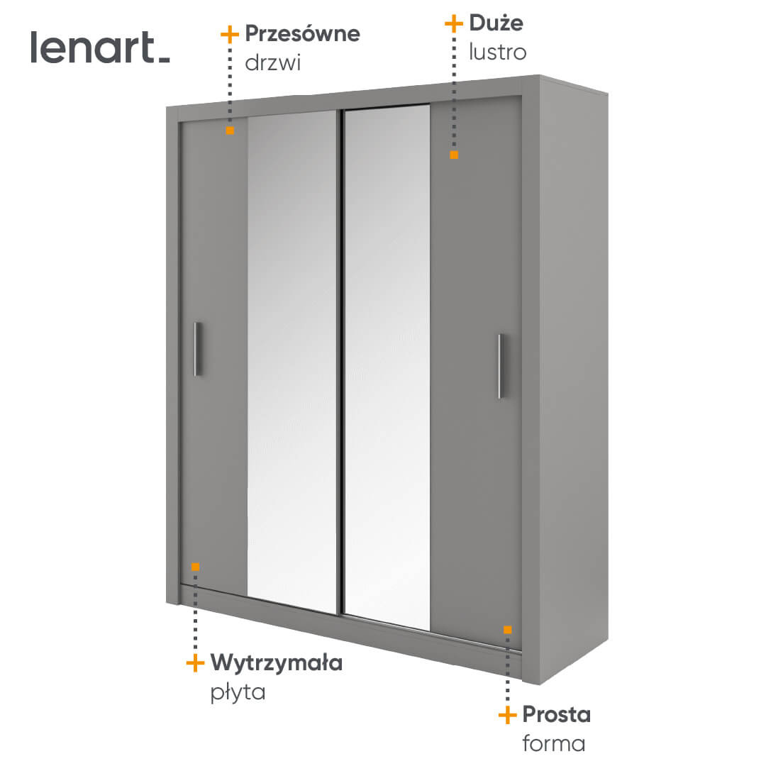 Nowoczesny styl kolekcji IDEA doskonale harmonizuje z różnorodnymi aranżacjami wnętrz. Szafa charakteryzuje się prostą, ale elegancką kolorystyką oraz linią designu, współgrającą zarówno z minimalizmem, jak i bardziej dekoracyjnymi przestrzeniami. Dodatkowo, na obu drzwiach umieszczono duże lustra, które nie tylko są praktycznym elementem, ale też optycznie powiększają i rozjaśniają pomieszczenie.