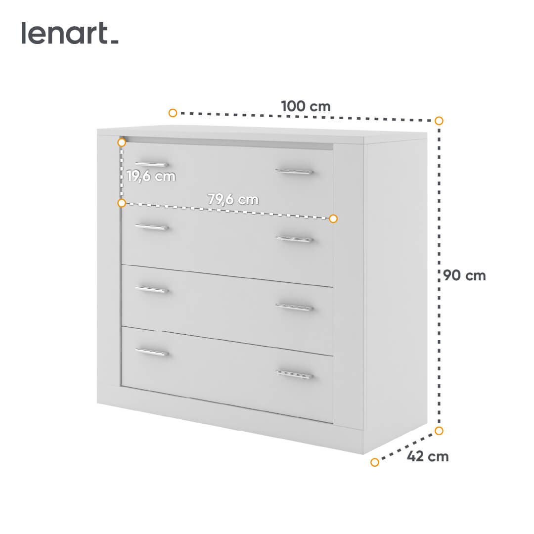 Umiejętnie zaprojektowana, komoda IDEA ID-10 4s charakteryzuje się wymiarami szerokości 100 cm, wysokości 90 cm i głębokości 42 cm. Dzięki kompaktowym wymiarom idealnie wpasuje się do przestrzeni, w której każdy centymetr ma znaczenie. Oferując aż cztery pojemne szuflady na rolkowych prowadnicach, gwarantuje płynne i ciche ich wysuwanie oraz doskonałą organizację przechowywanych rzeczy. Fronty wyposażono w uchwyty wykonane z trwałego tworzywa, które podkreślają nowoczesny charakter komody i są niezwykle funkcjonalne w codziennym użytkowaniu.