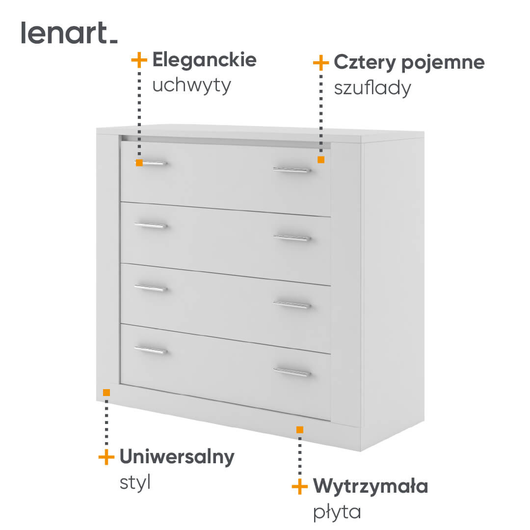- Komoda IDEA ID-10 w bieli to kwintesencja funkcjonalności i stylu, z czterema przestronnymi szufladami na rolkowych prowadnicach. Solidna, nowoczesna i łatwa w montażu, będzie idealnym uzupełnieniem sypialni czy garderoby.