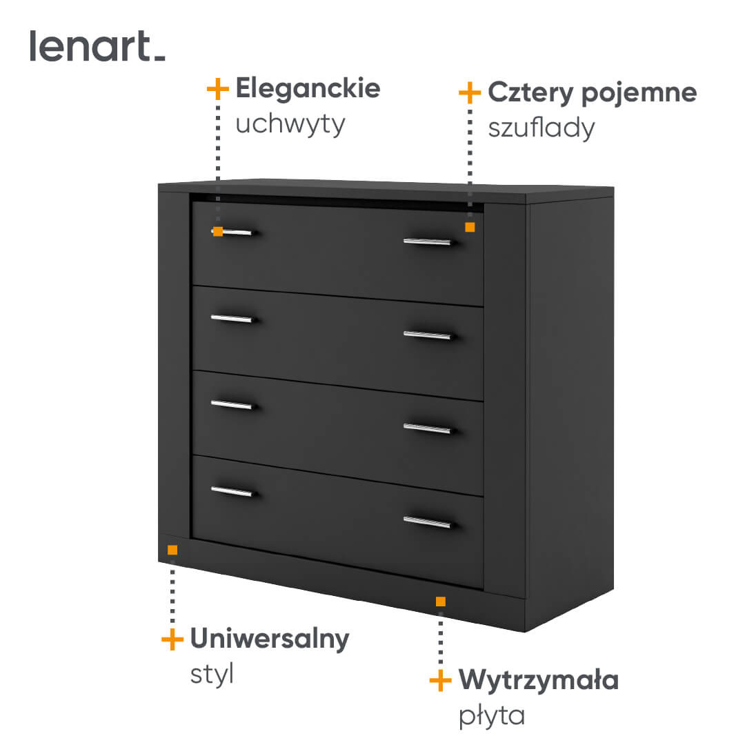 Komoda IDEA ID-10 w kolorze czarnym, o nowoczesnym designie, zapewniająca dużą przestrzeń do przechowywania dzięki czterem funkcjonalnym szufladom. Stabilna i trwała, pasuje do sypialni i garderoby.