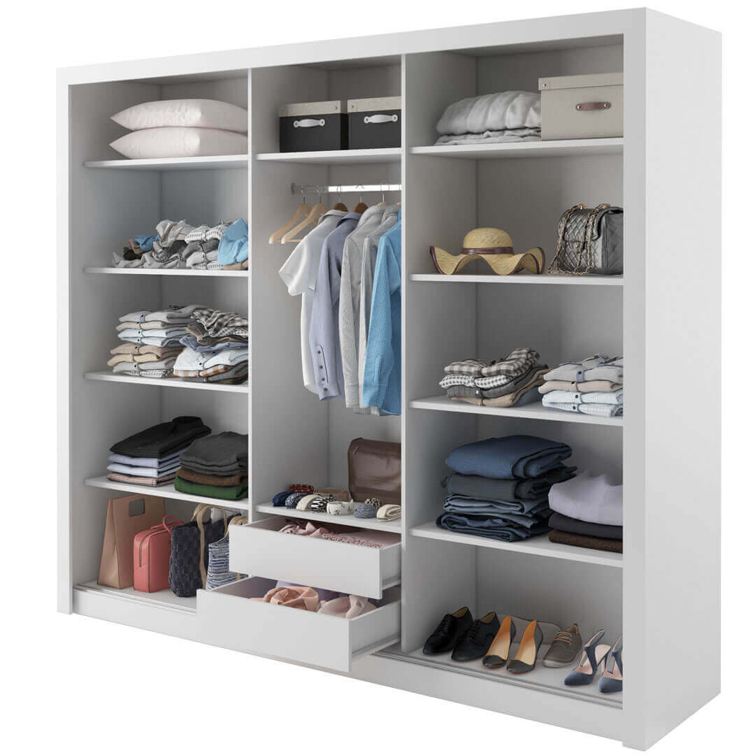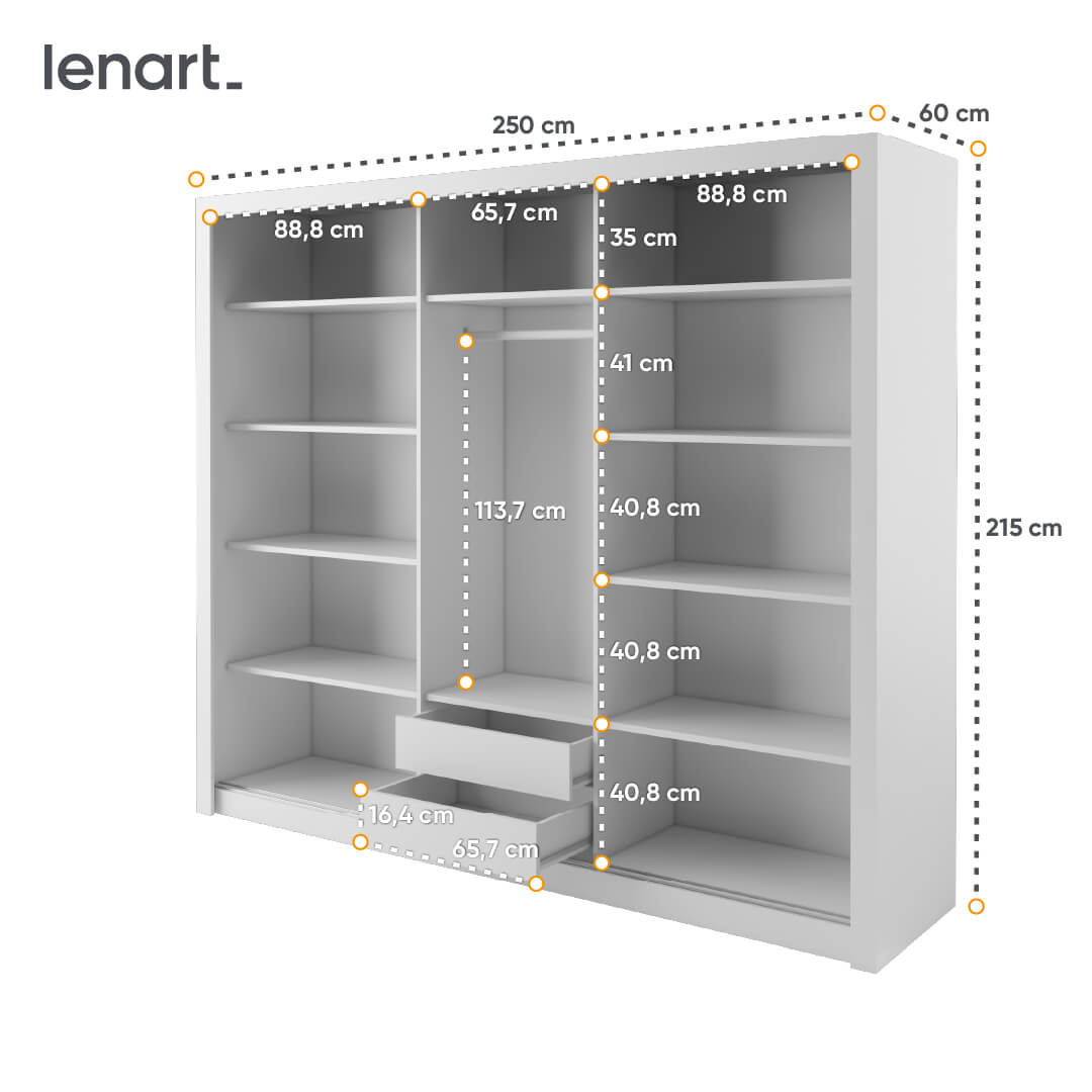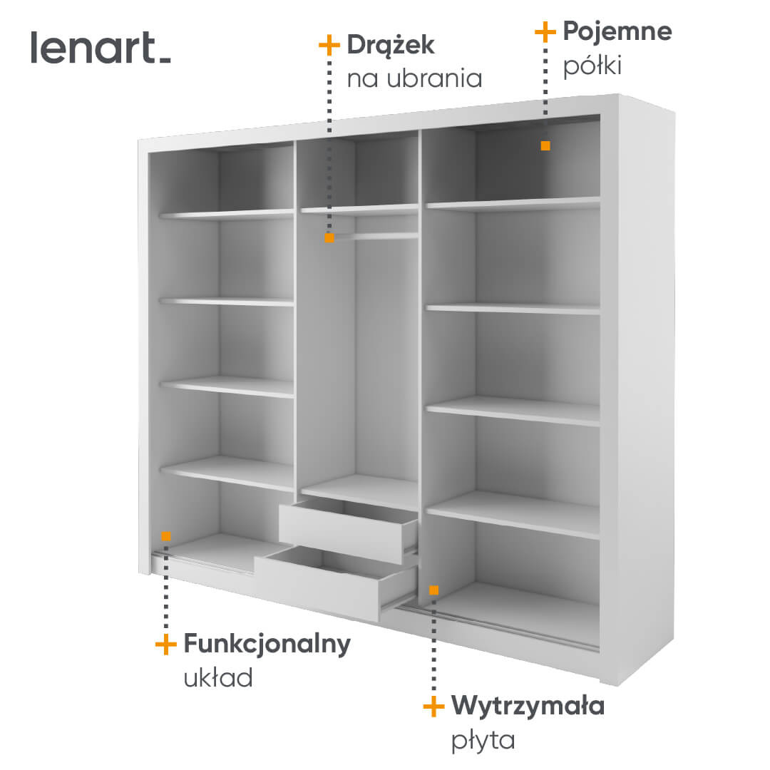 Szafa przesuwna o szerokości 250 cm i wysokości 215 cm wyróżnia się swoim funkcjonalnym wnętrzem, które daje Ci swobodę organizacji różnorodnych elementów Twojej garderoby. Za trzema przesuwnymi drzwiami kryje się dziesięć pojemnych półek oraz drążek do wieszania ubrań, dzięki czemu łatwo zachowasz ład i porządek wśród rzeczy codziennego użytku.