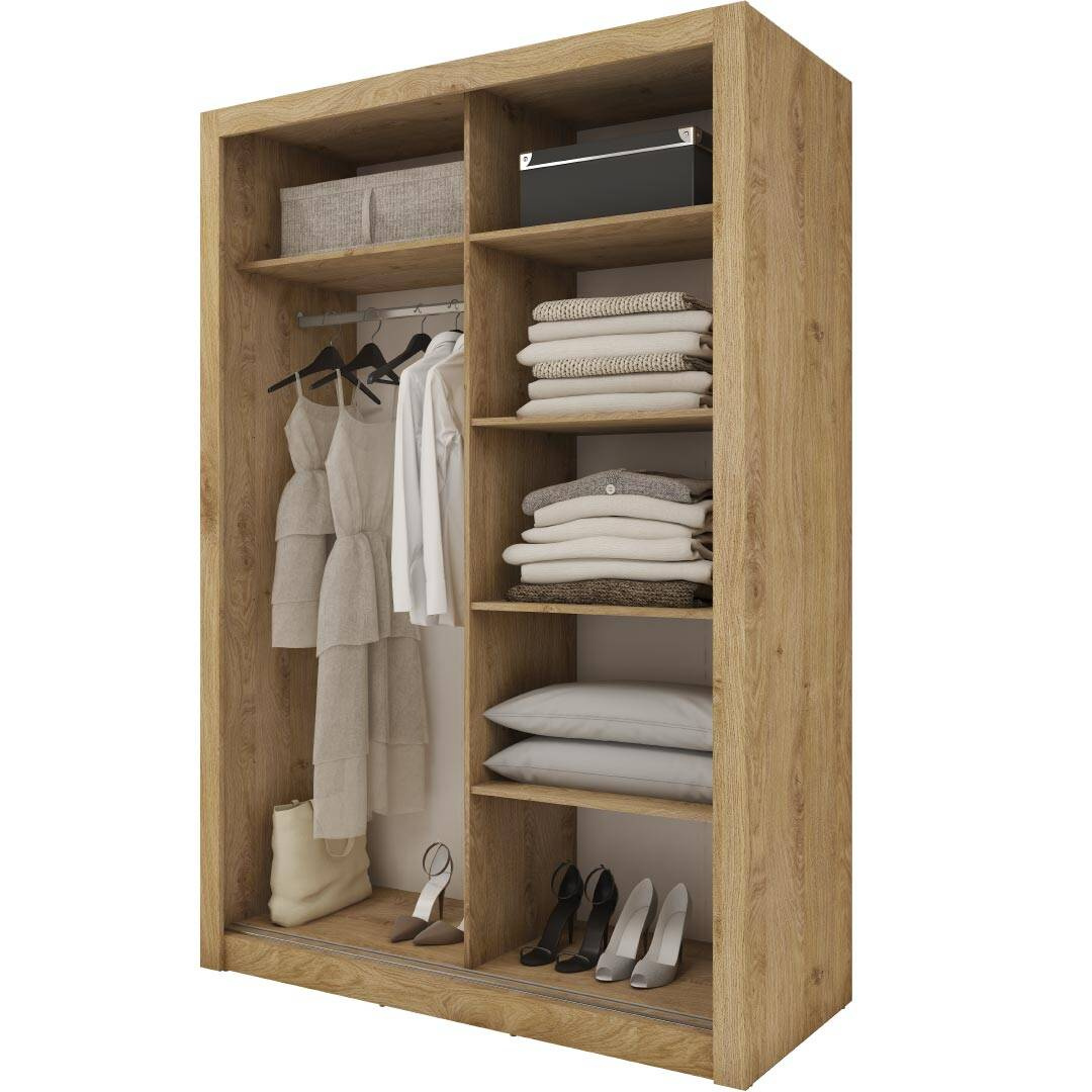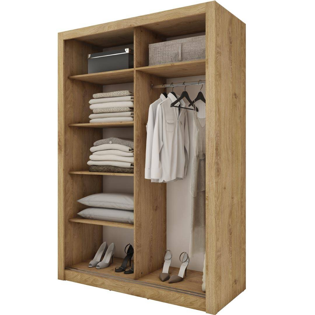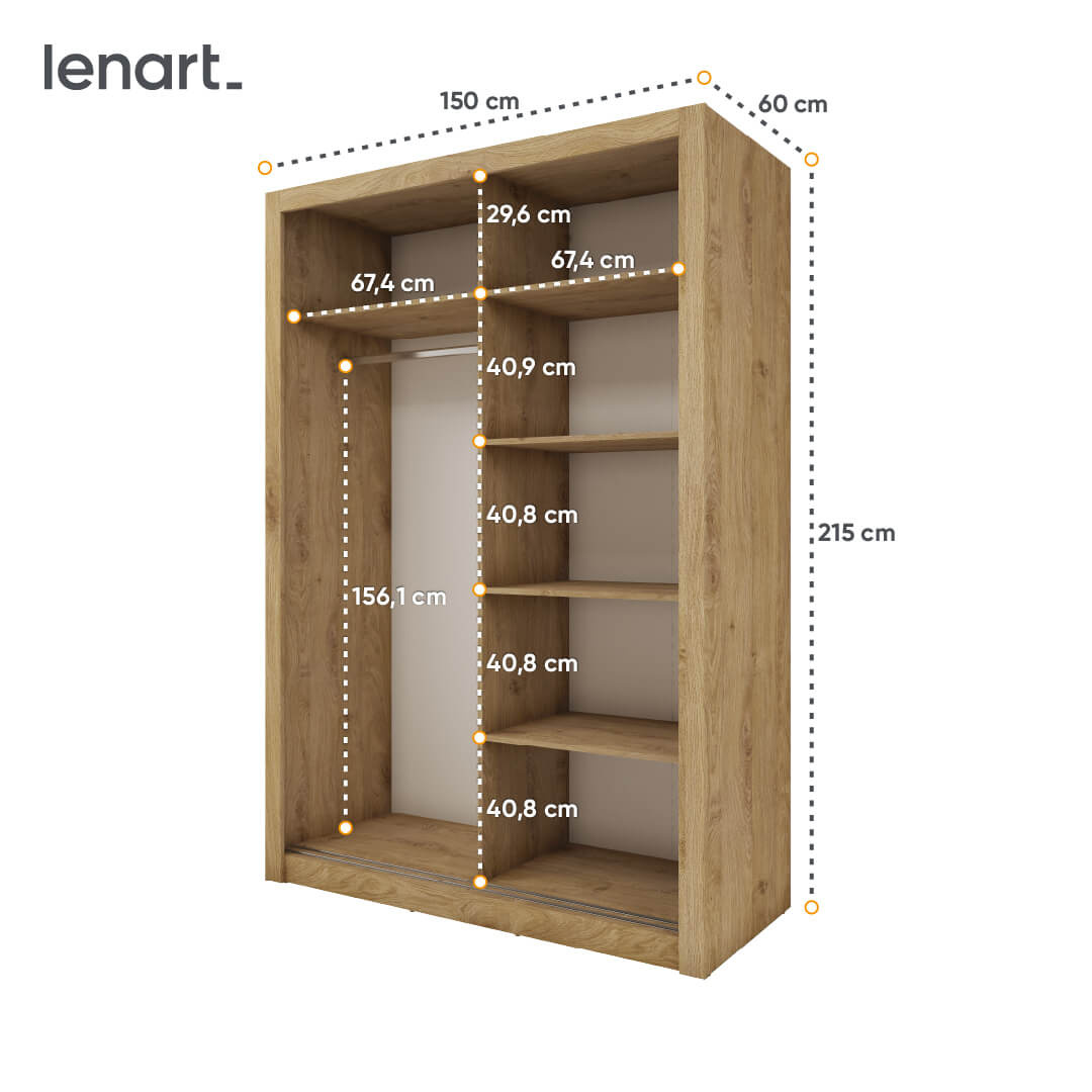 IDEA ID-17 zachwyca swoimi wymiarami: szerokość 150 cm, wysokość 215 cm i głębokość 60 cm, gwarantującym doskonałą pojemność w każdej aranżacji wnętrza. Waga bryły wynosząca 143 kg świadczy o solidności i stabilności mebla. Dwudrzwiowy system przesuwny jest idealnym rozwiązaniem do oszczędzania miejsca, a aluminiowe prowadnice zapewniają lekkość oraz cichą pracę drzwi.