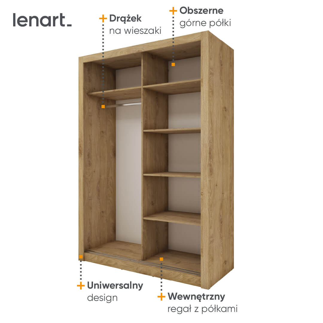 Funkcjonalność szafy podkreśla jej uniwersalny, lecz wyrafinowany design. Fronty z dużym lustrem nie tylko dodają blasku i optycznie powiększają pomieszczenie, ale również pozwalają ocenić strój przed wyjściem. Wewnątrz szafy znajduje się praktyczny drążek na wieszaki oraz pięć pojemnych półek, na których bez trudu rozmieścisz swoje ubrania, akcesoria oraz rzadziej używane przedmioty.