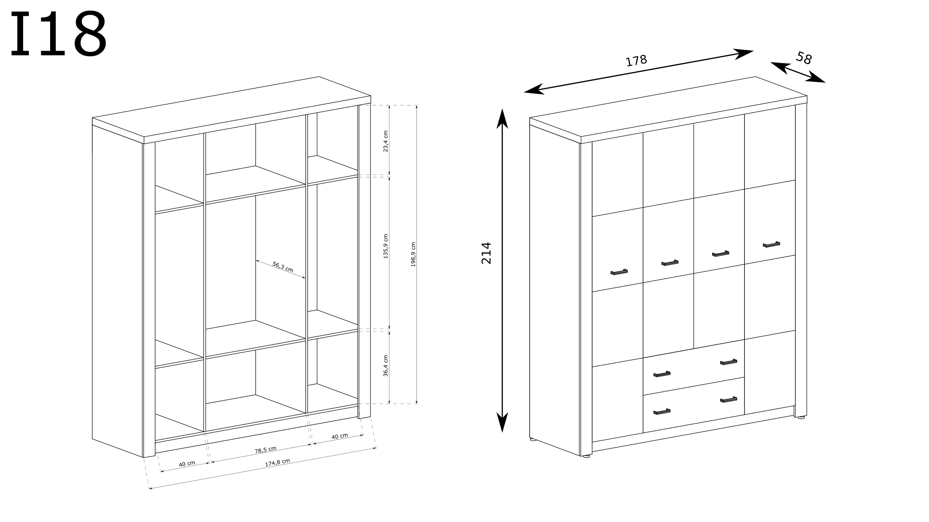 Jednym z największych atutów szafy Indianapolis-18 jest jej przemyślana konstrukcja, która pozwala na efektywne zagospodarowanie przestrzeni. Dzięki czterem drzwiom oraz dwu dużym szufladom, każdy znajdzie w niej miejsce na swoje rzeczy. Pięć półek z łatwością pomieści wszystko, co trzeba uporządkować, a dwa drążki do ubrań ułatwią organiazcję garderoby. Teraz możesz cieszyć się większym porządkiem i pełnym komfortem w codziennym użytkowaniu.