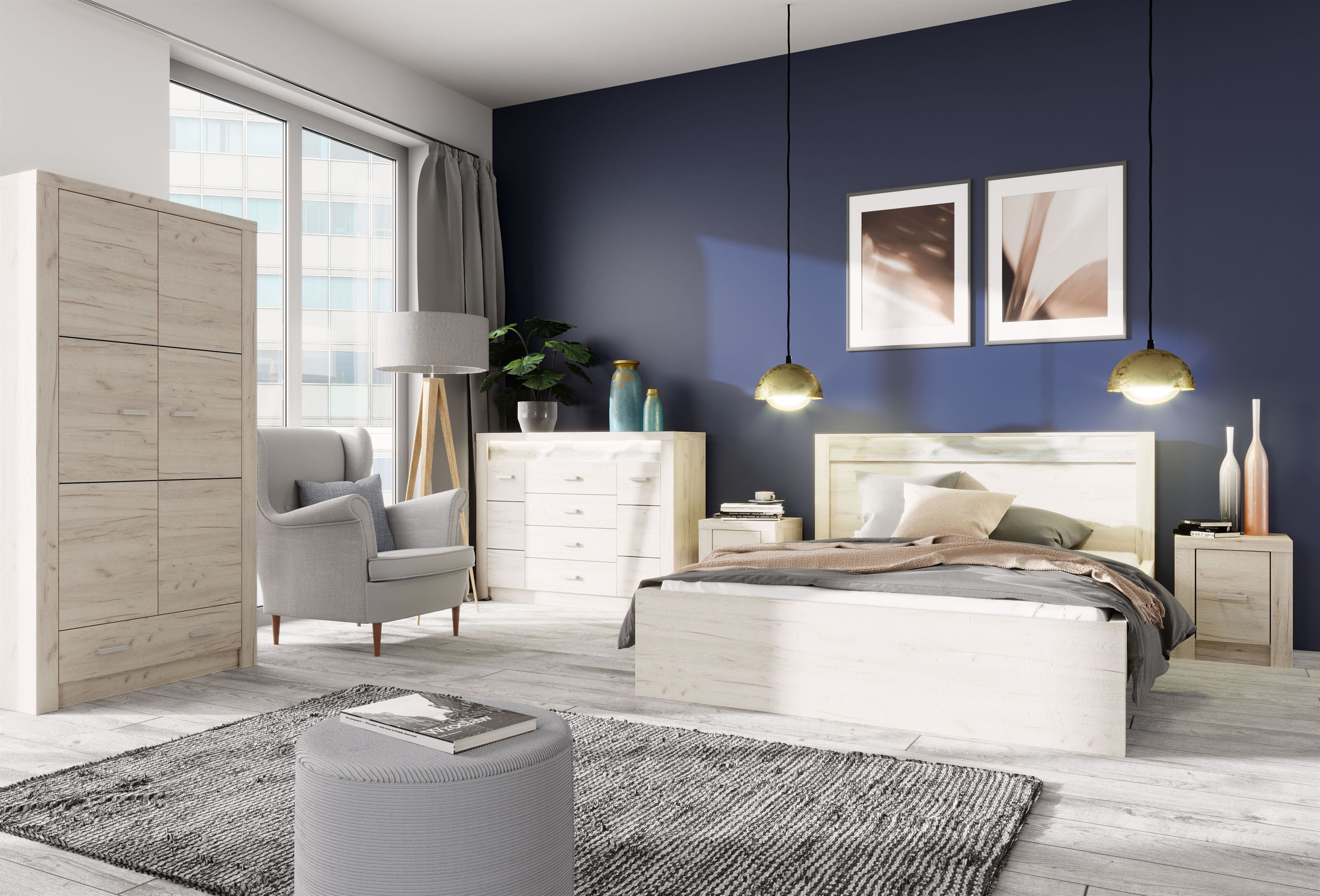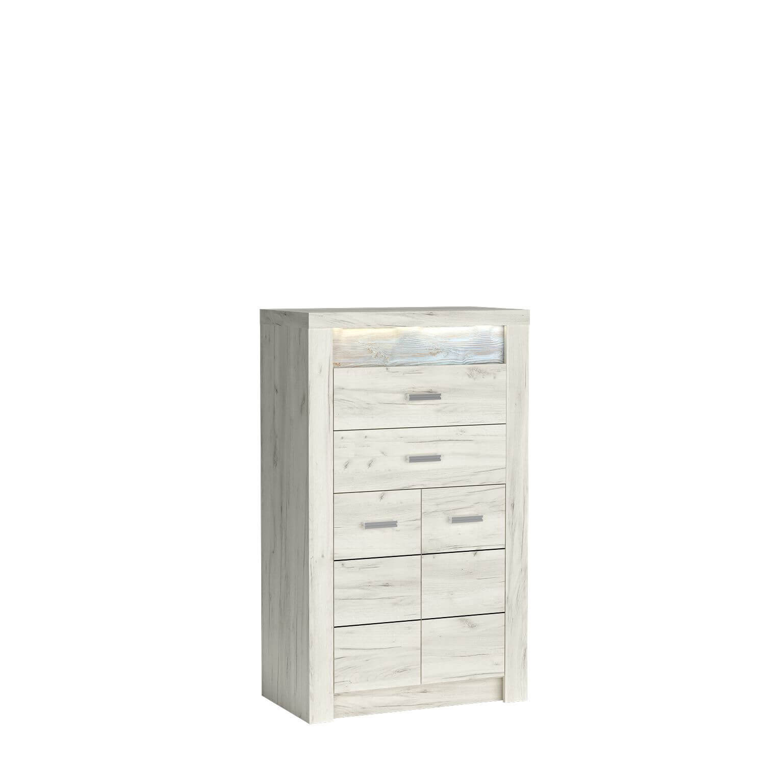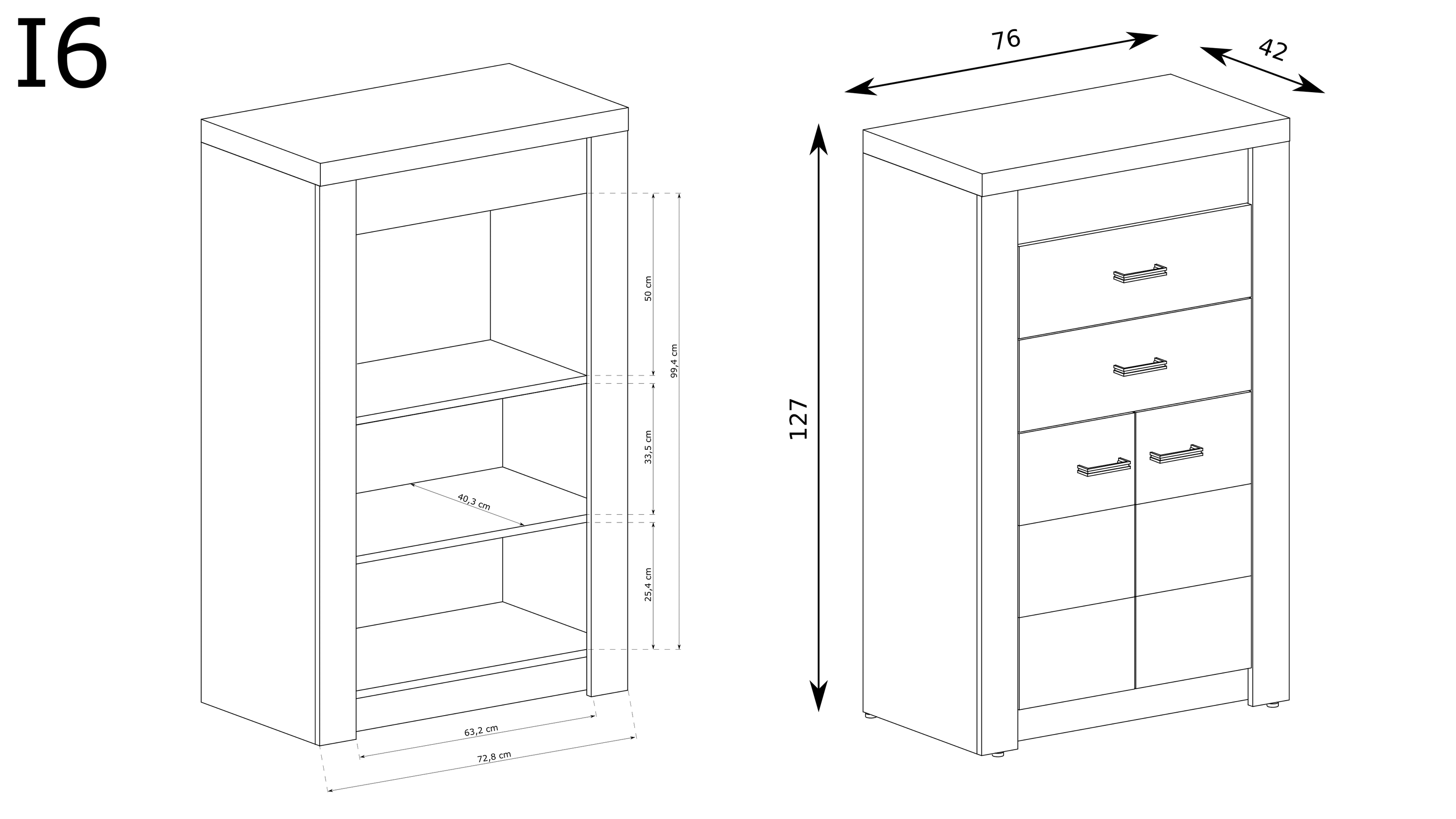Wysokość 127 cm i szerokość 76 cm oferują doskonałą równowagę między pojemnością a ergonomią. Dolna część komody została zaprojektowana z myślą o maksymalnej funkcjonalności – dzięki podwójnym drzwiom z praktyczną półką, zyskaliśmy dodatkową przestrzeń, która jest idealna do przechowywania ubrań, pościeli czy innych drobiazgów. Komoda Indianapolis-6 to rozwiązanie, które wykorzystuje przestrzeń w 100%, a jednocześnie nie przytłacza wnętrza.