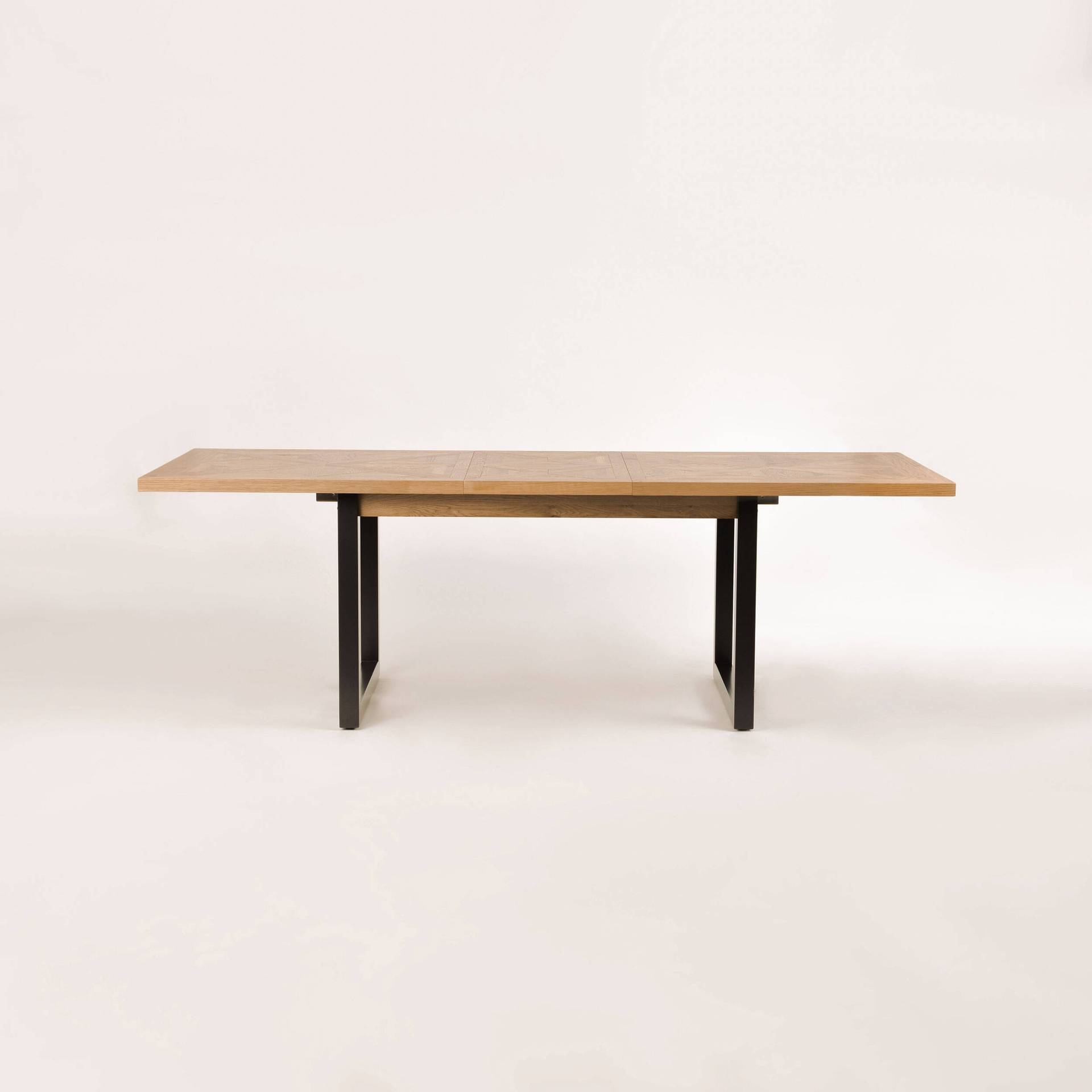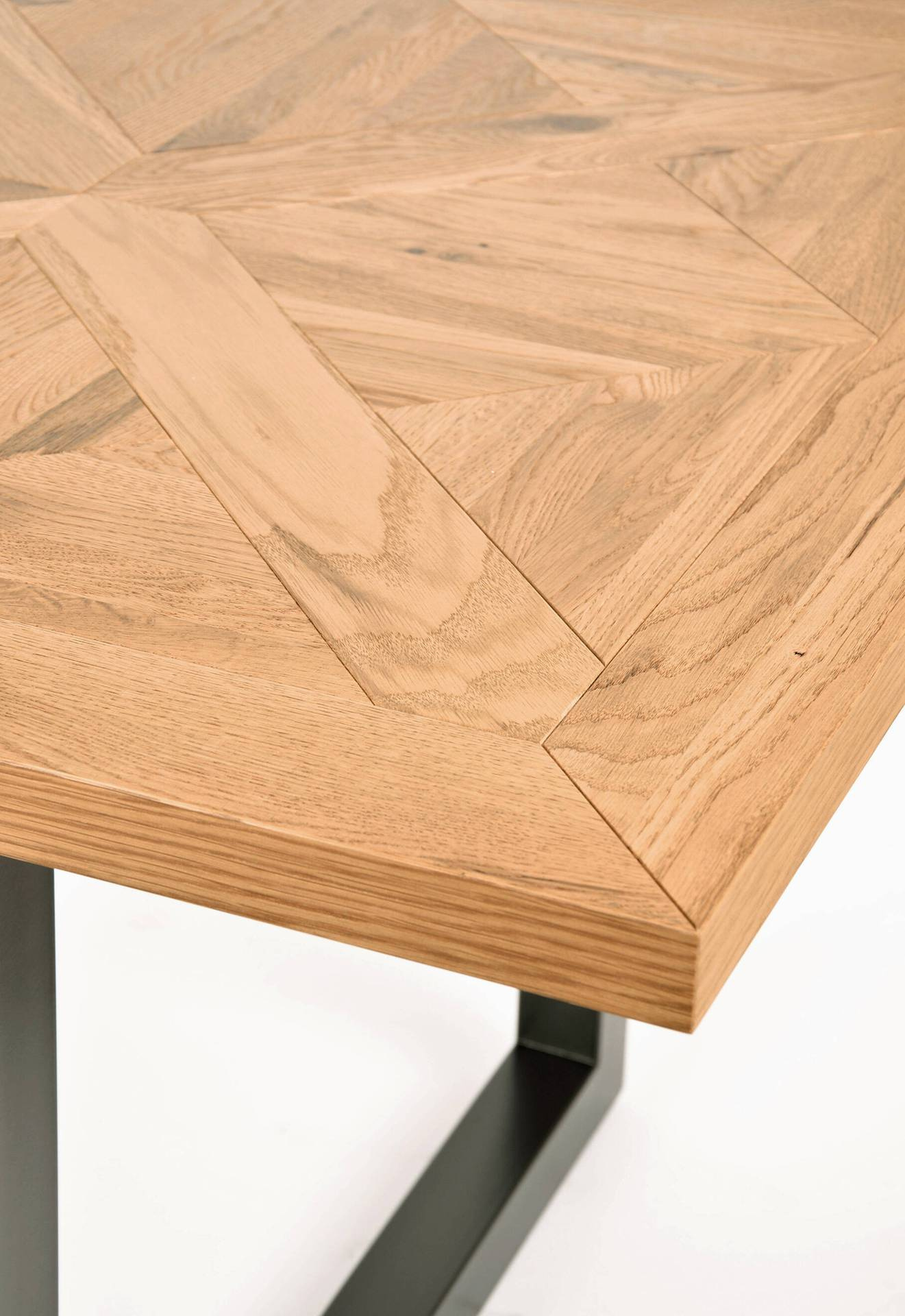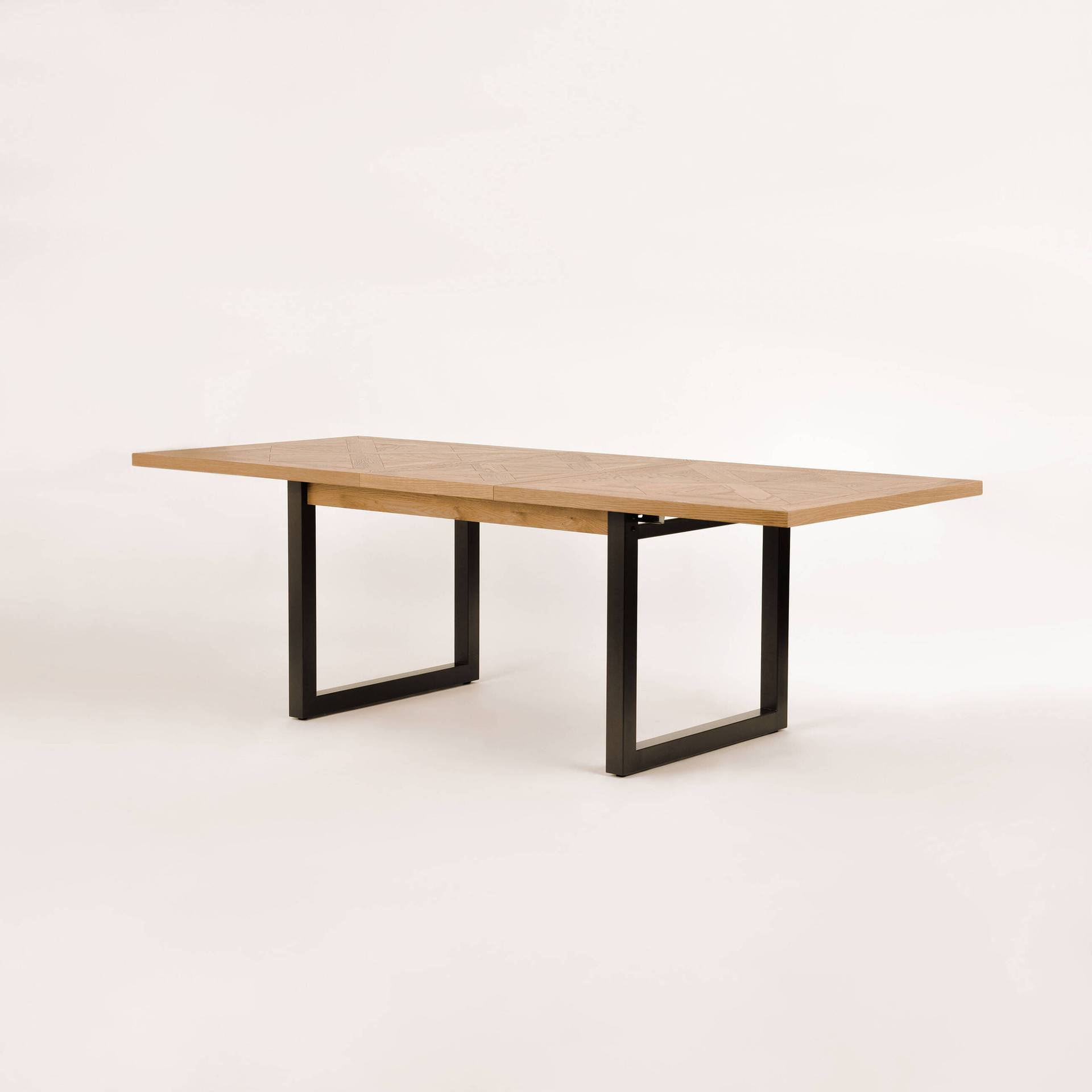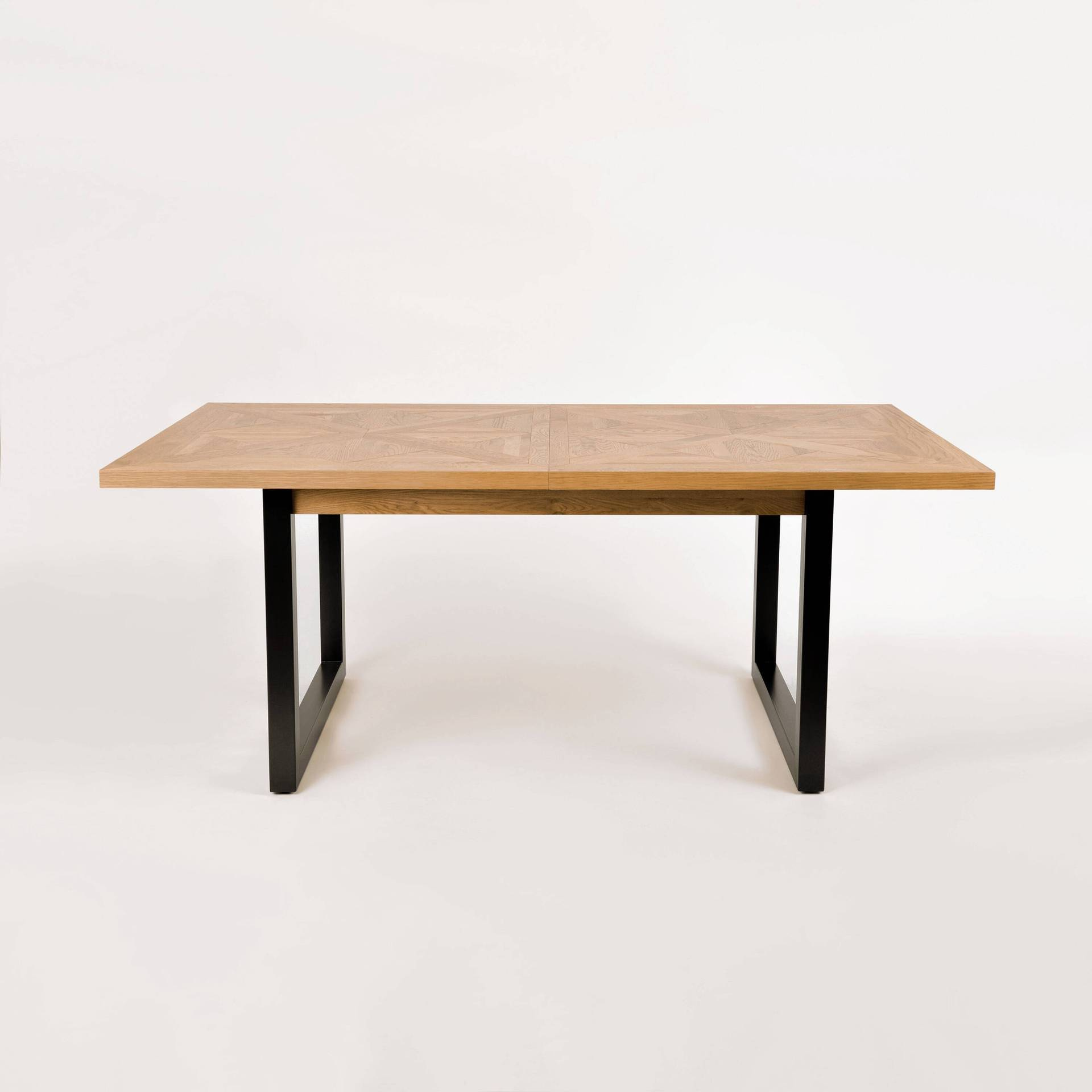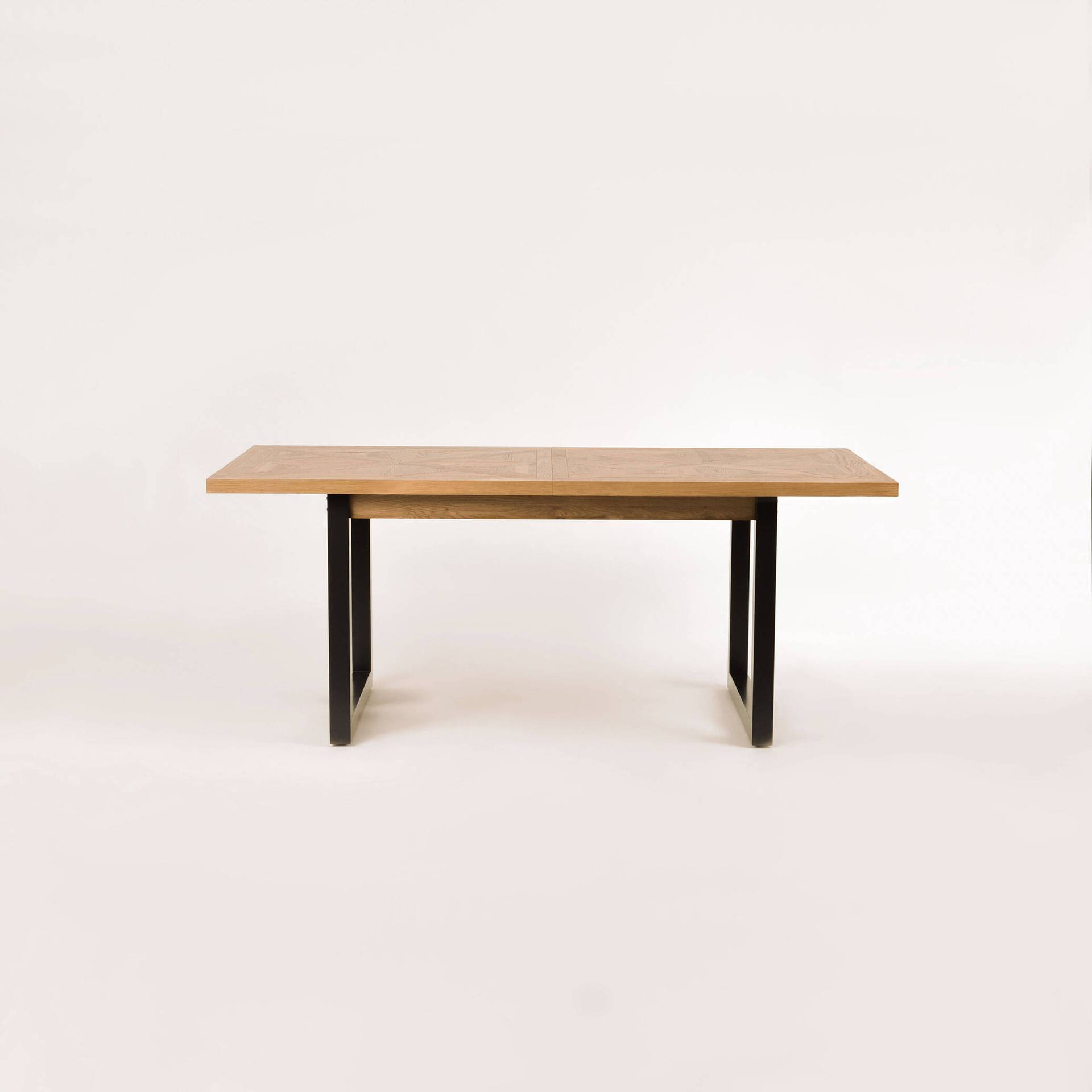 - Ekskluzywny rozkładany stół na stalowych nogach. Blat z litego drewna białego dębu z intarsją w kształcie X. W zestawie nadstawka wewnętrzna o szerokości 50 cm.