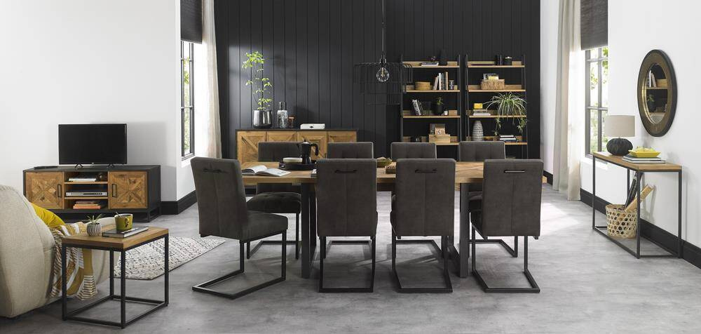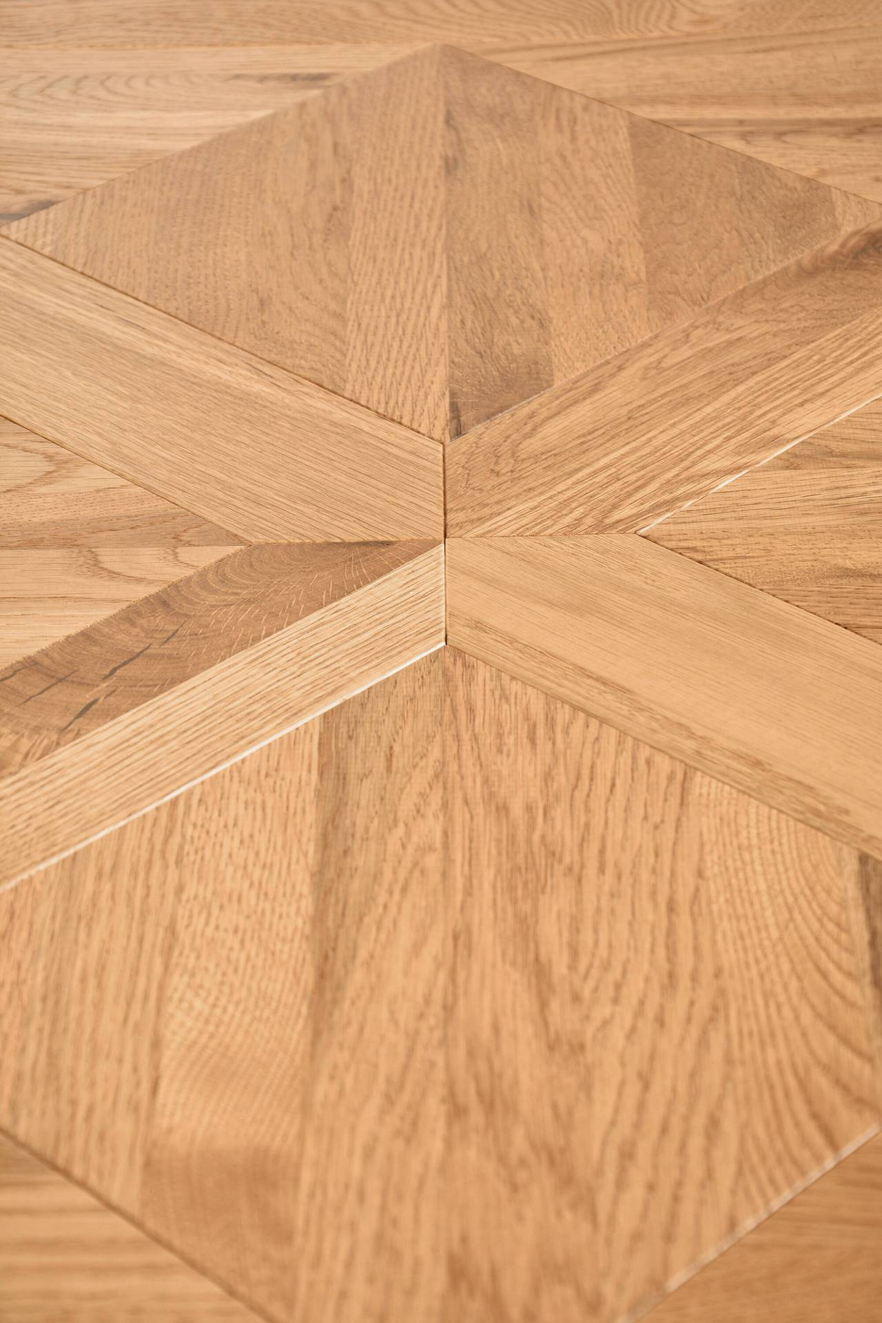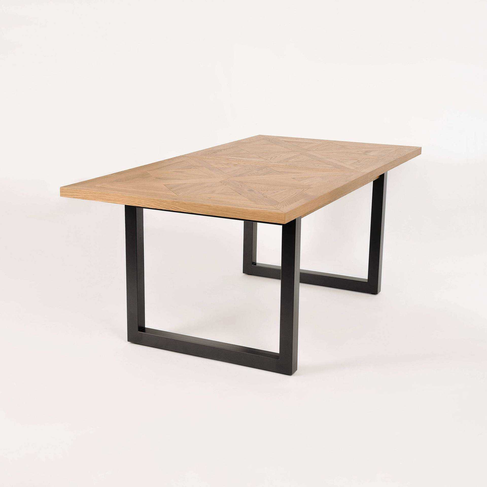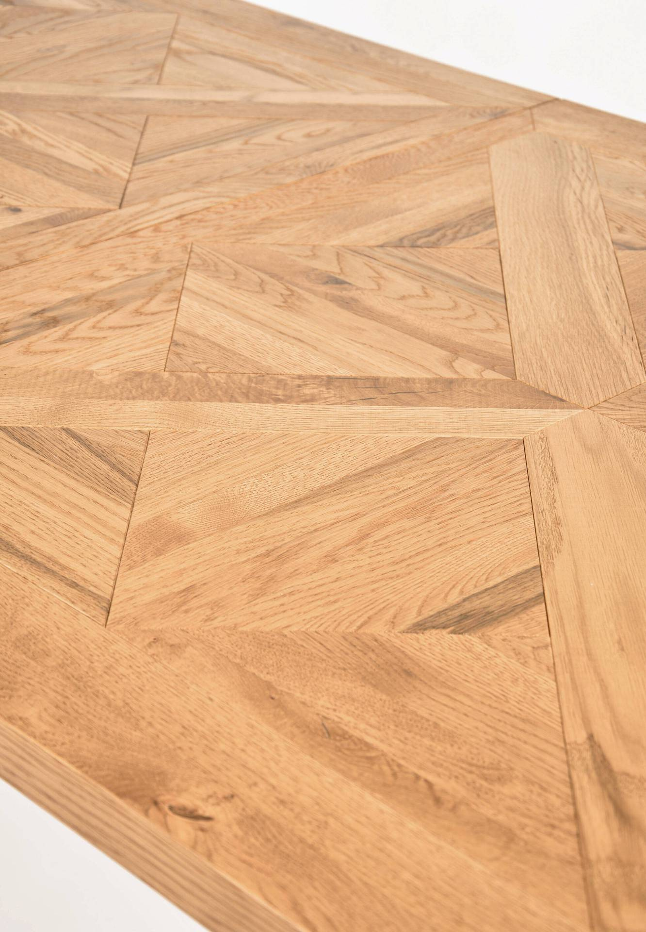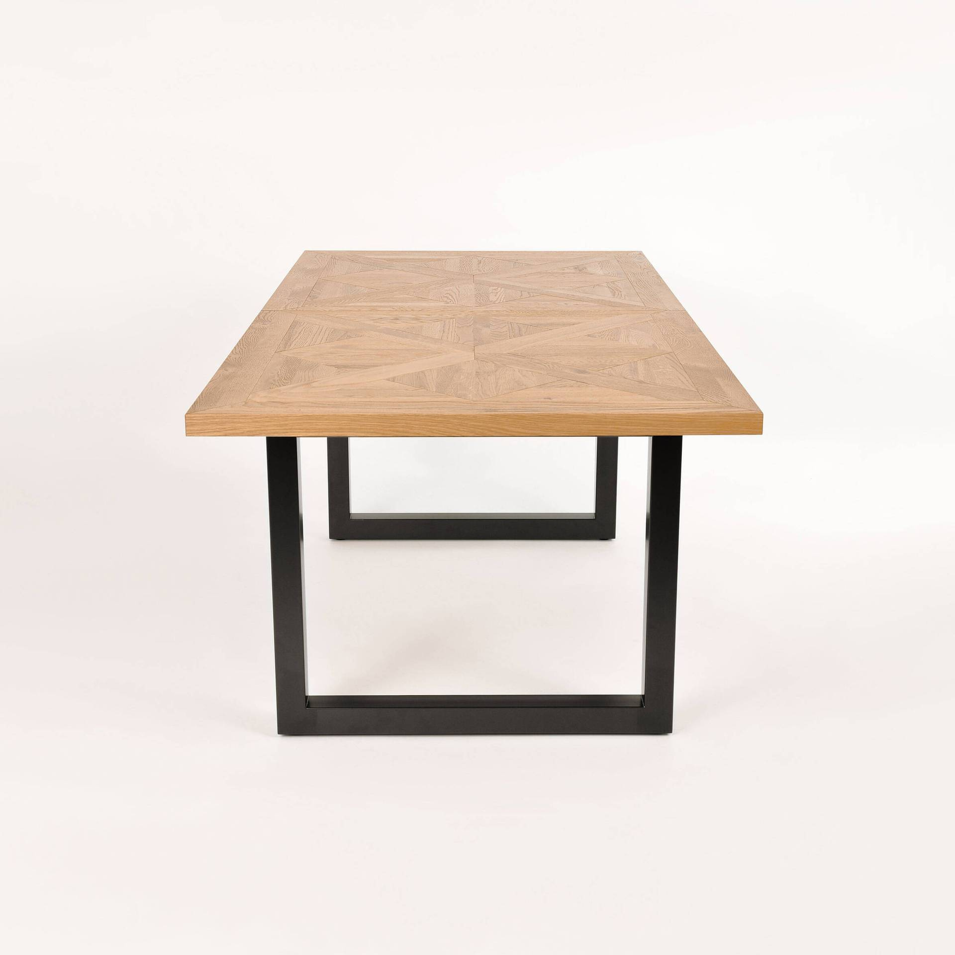 - Ekskluzywny rozkładany stół na stalowych nogach. Blat z litego drewna białego dębu z intarsją w kształcie X. W zestawie nadstawka wewnętrzna o szerokości 50 cm.