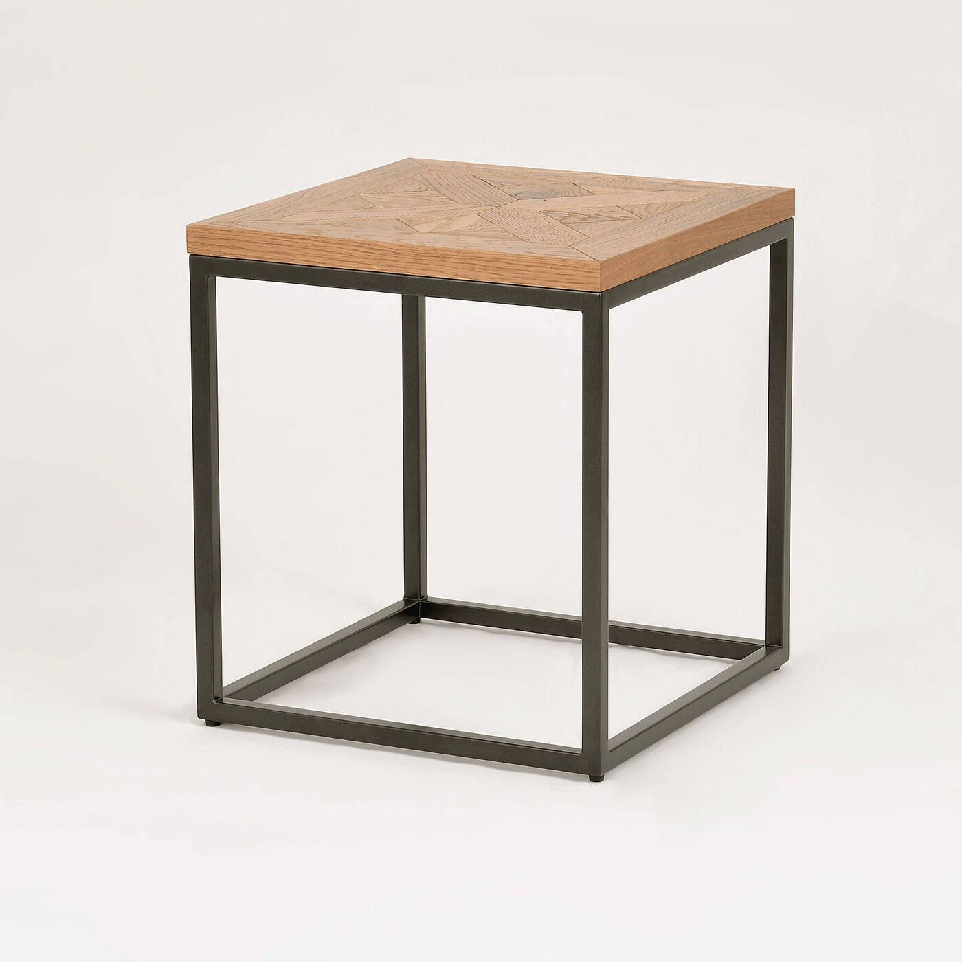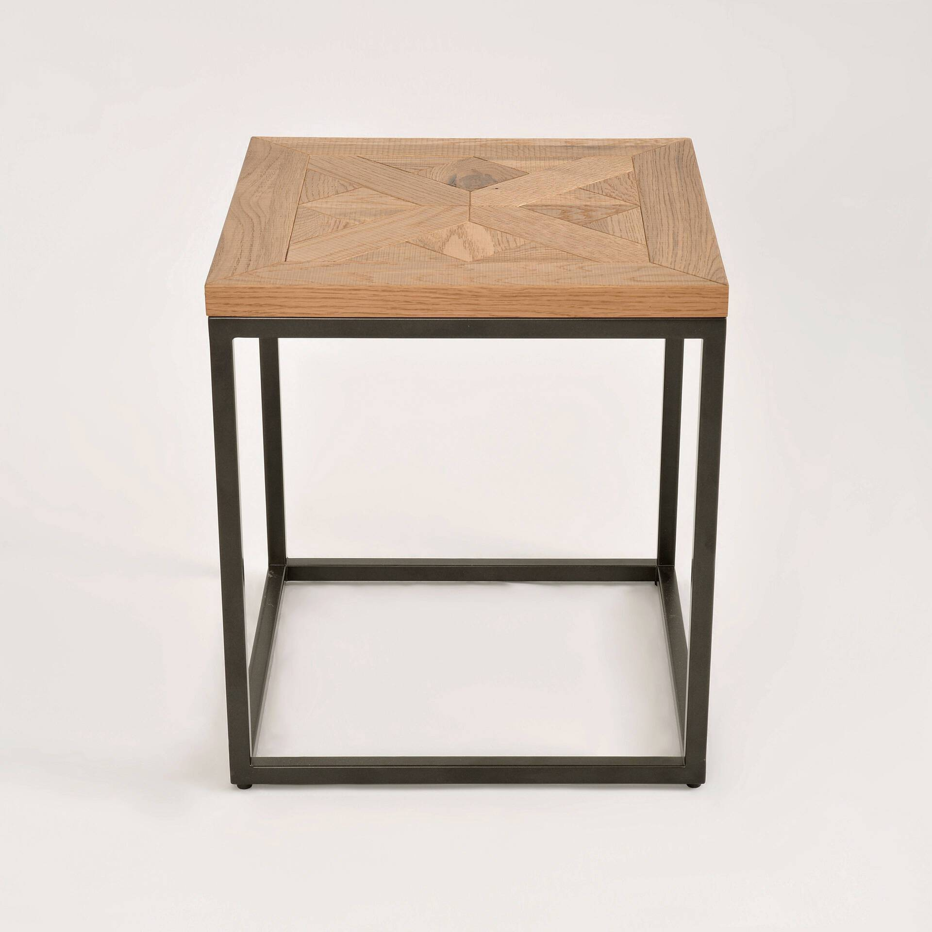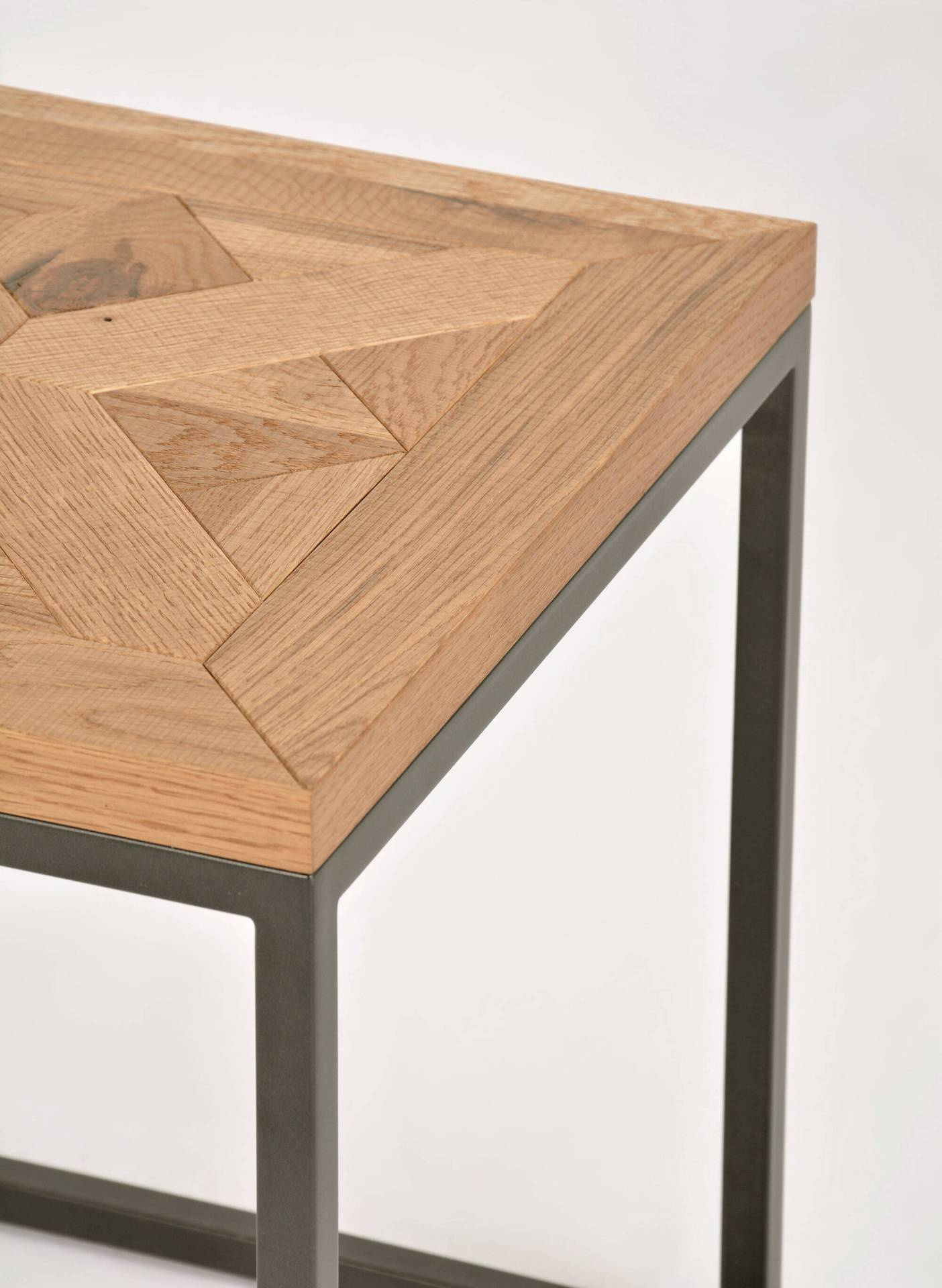 - Stolik o szerokości 45 cm wykonany z litego drewna dębowego z intarsją w kształcie litery X na blacie. Osadzony na metalowej konstrukcji w kolorze czarnym.