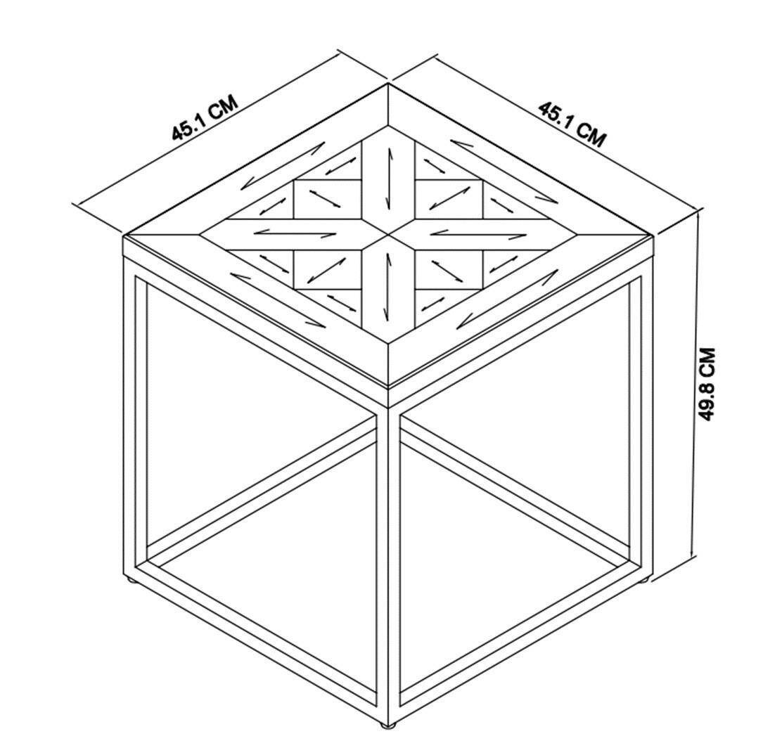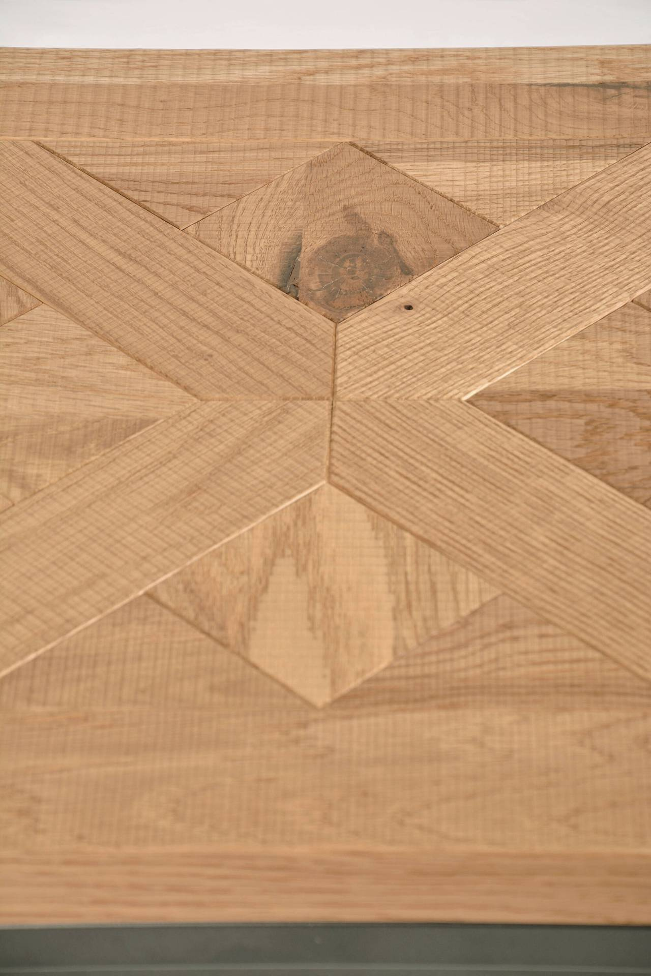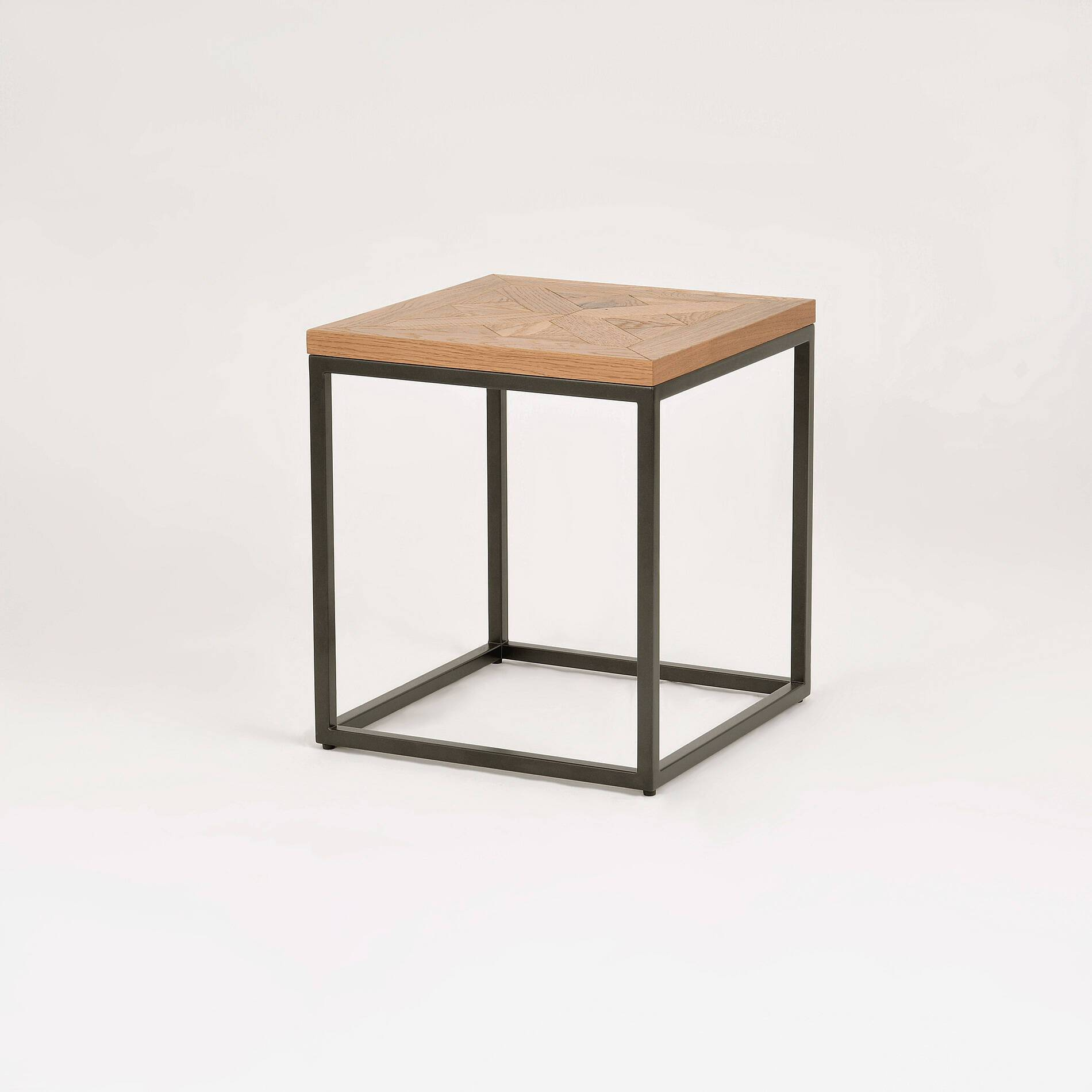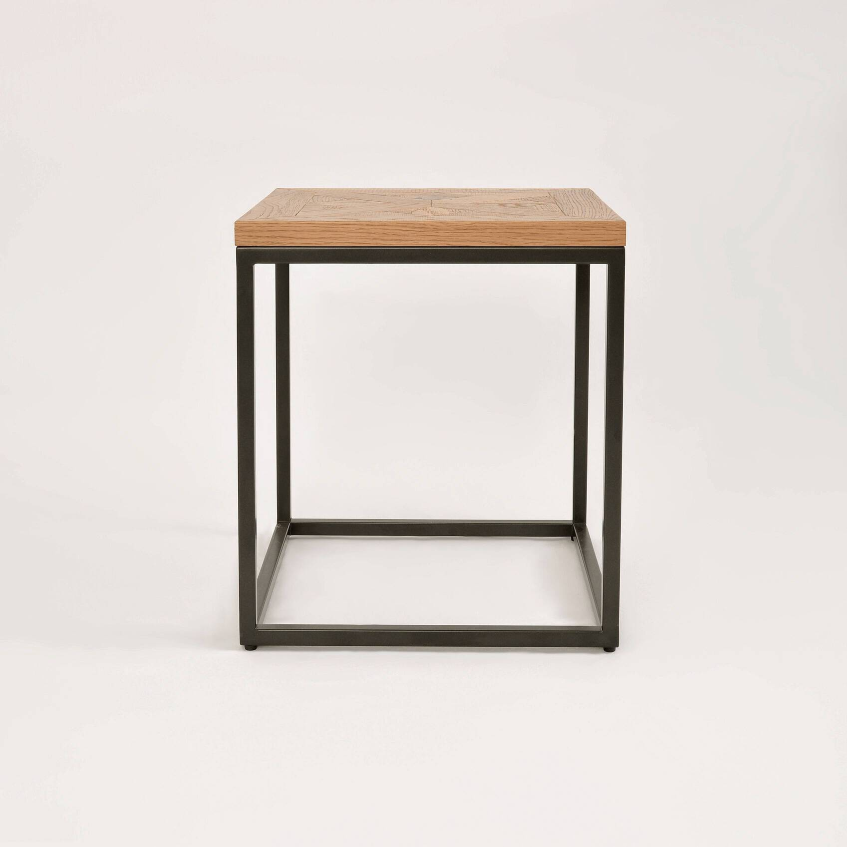 - Stolik o szerokości 45 cm wykonany z litego drewna dębowego z intarsją w kształcie litery X na blacie. Osadzony na metalowej konstrukcji w kolorze czarnym.