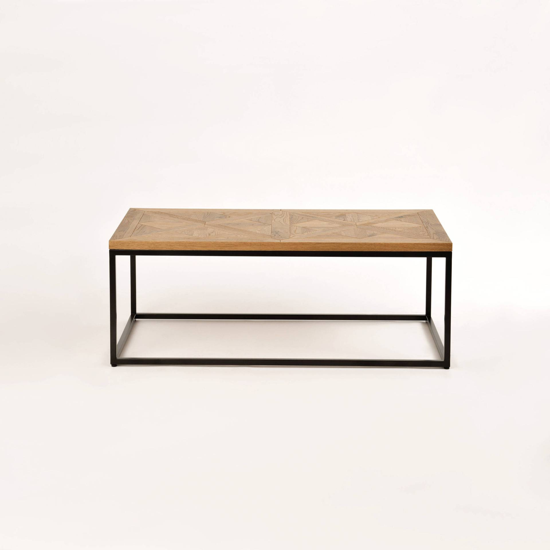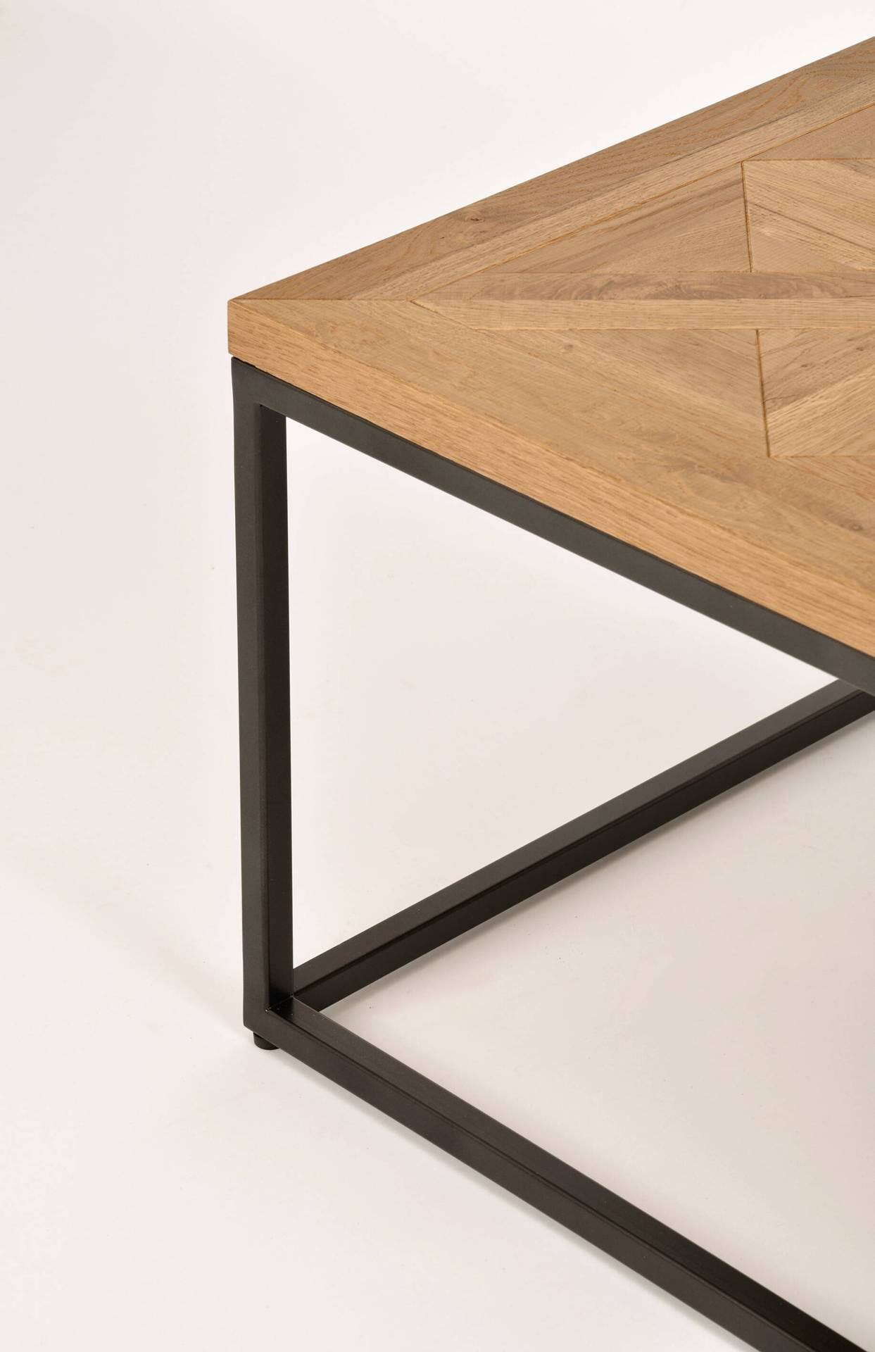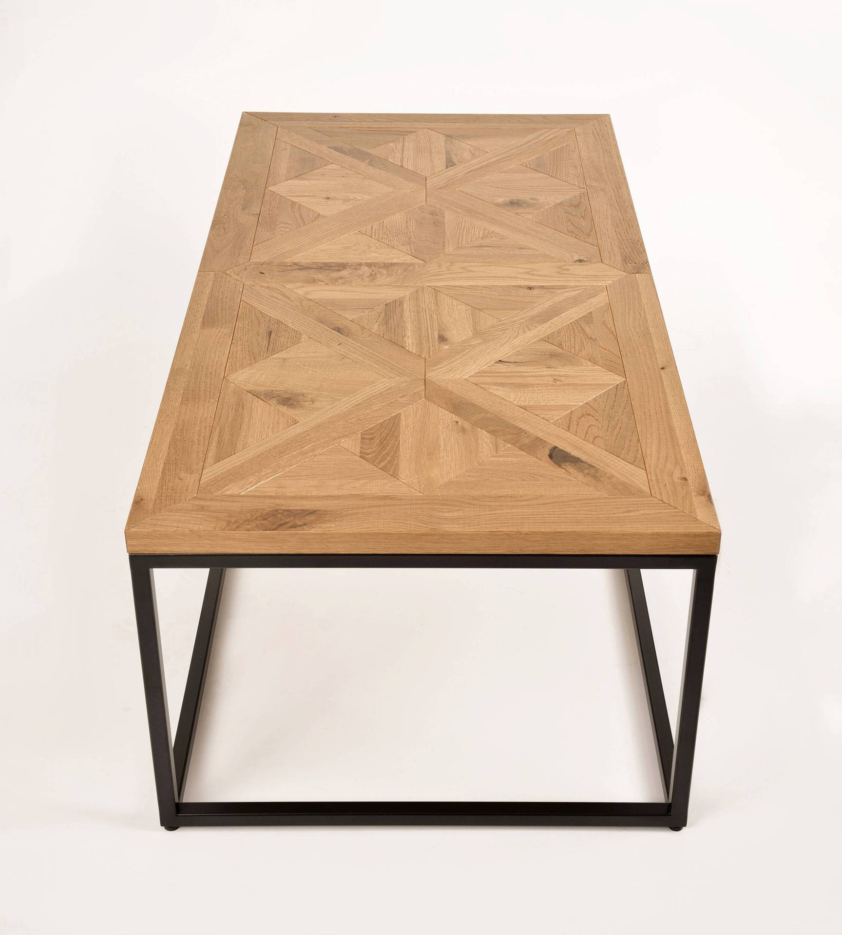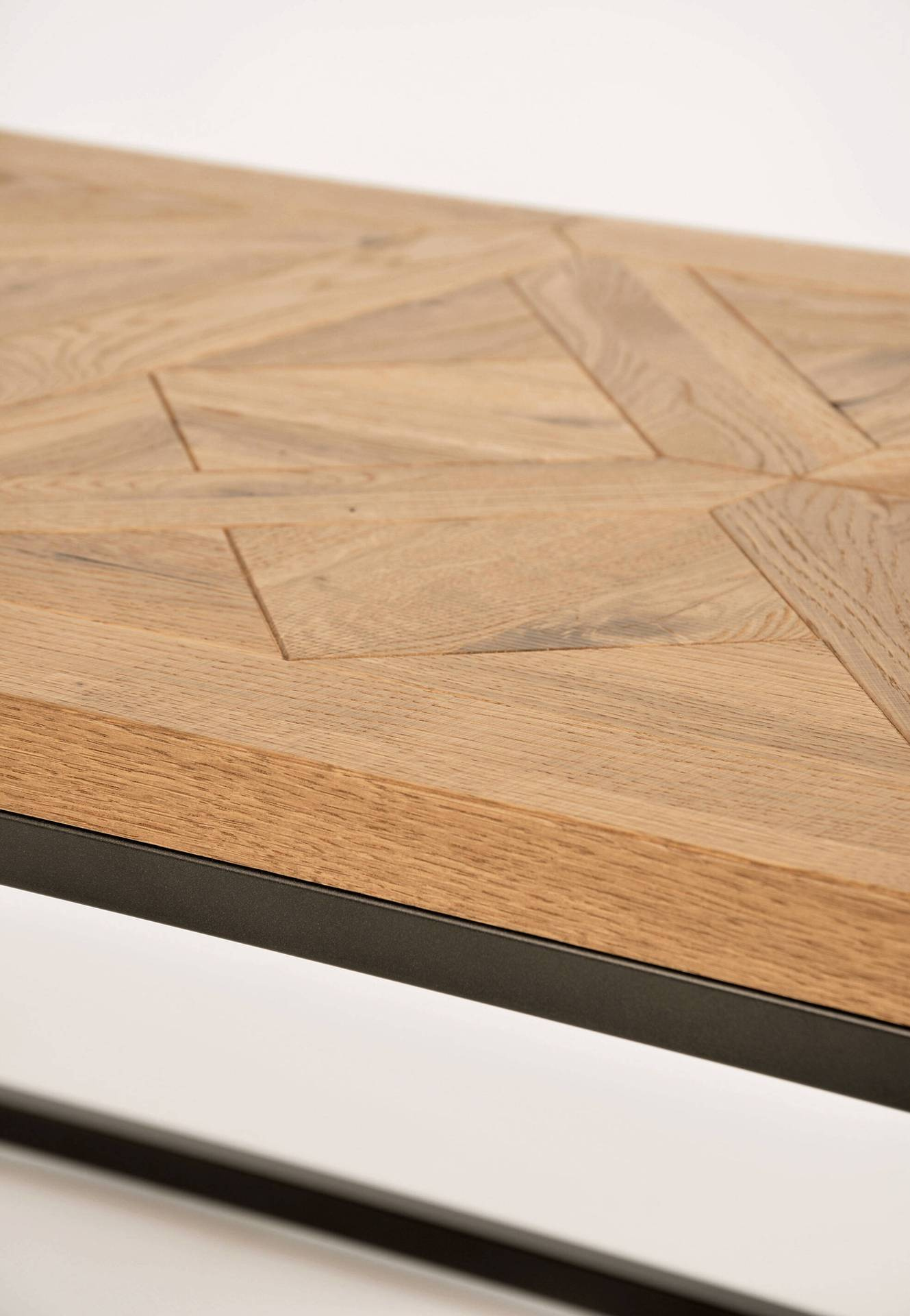 - Ława wykonany z litego drewna białego dębu z intarsją w kształcie X na blacie, osadzony na stalowej konstrukcji.