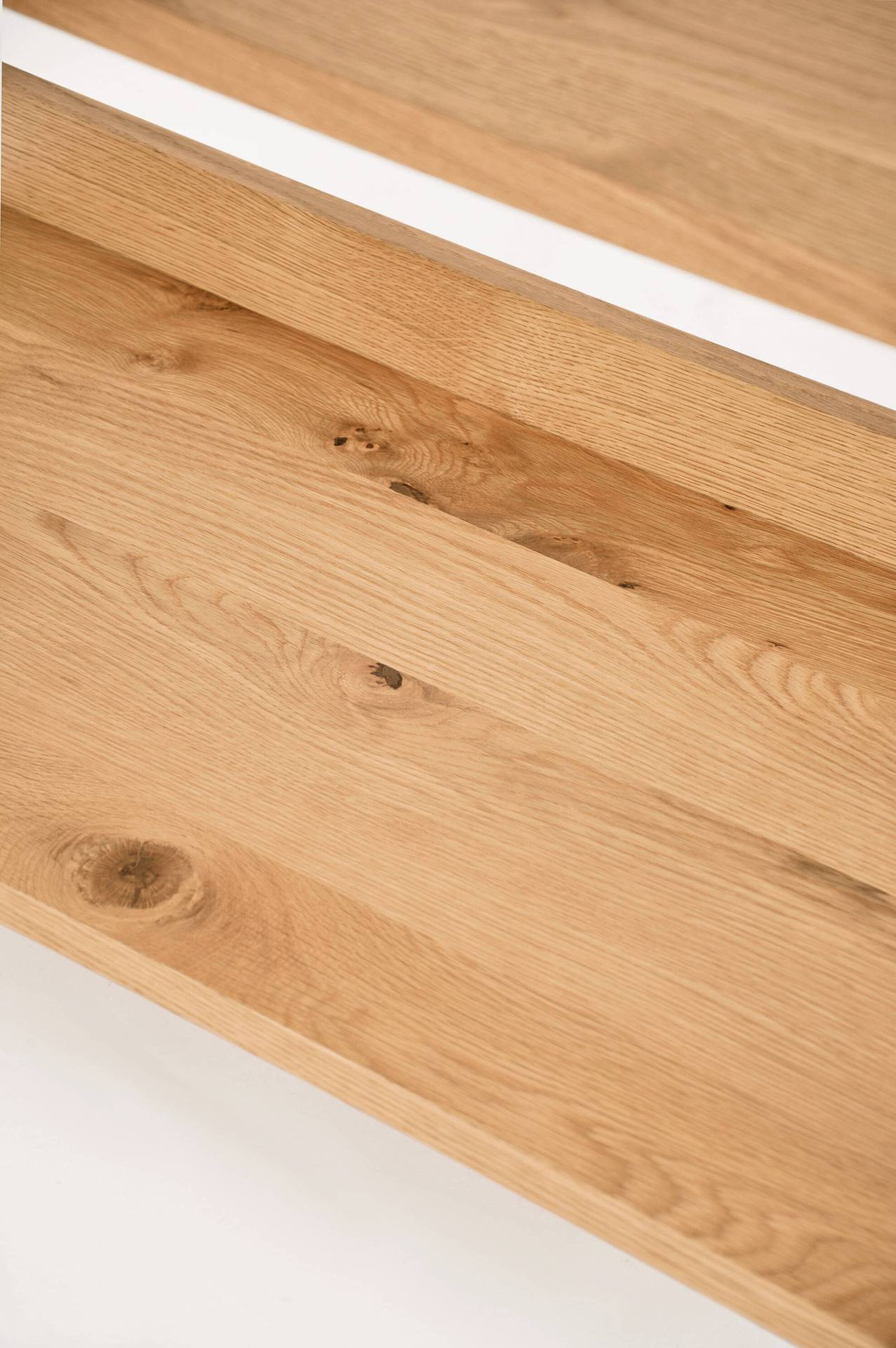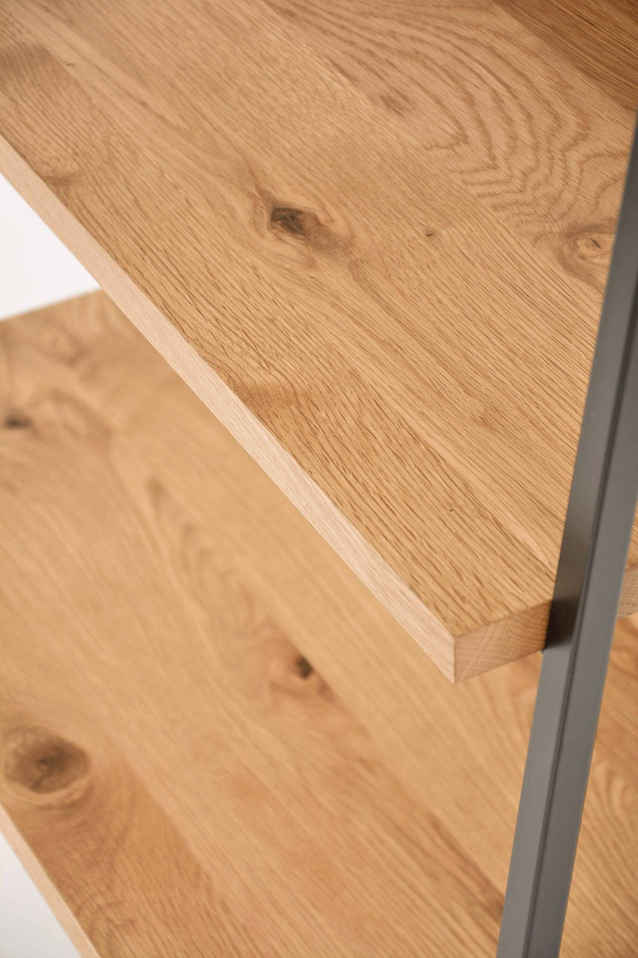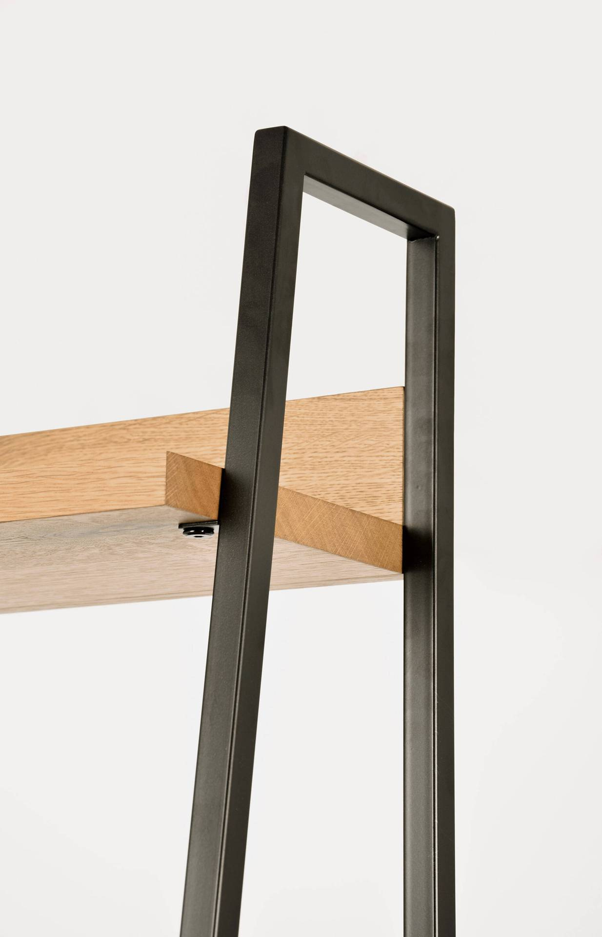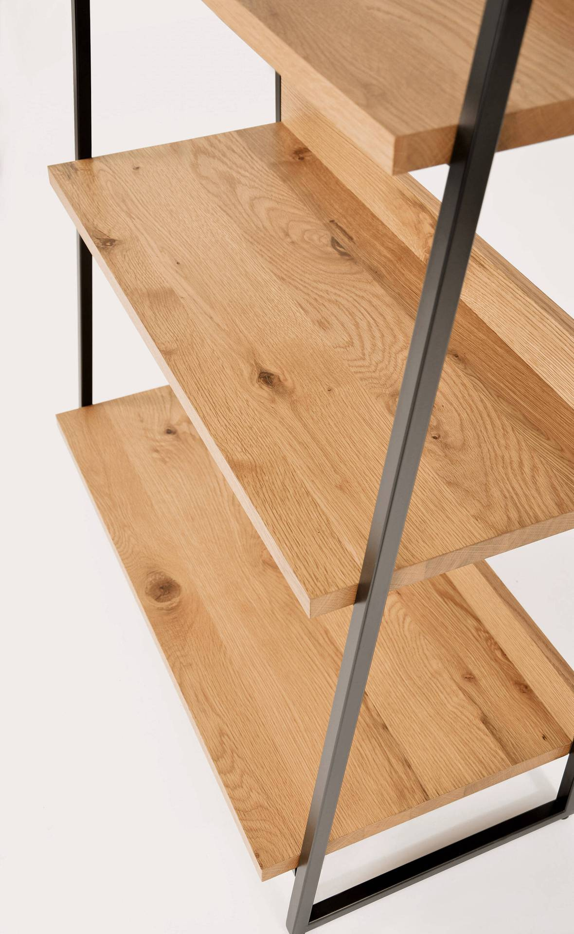 - Regał wykonany z litego drewna białego dębu, osadzony na stalowej konstrukcji.