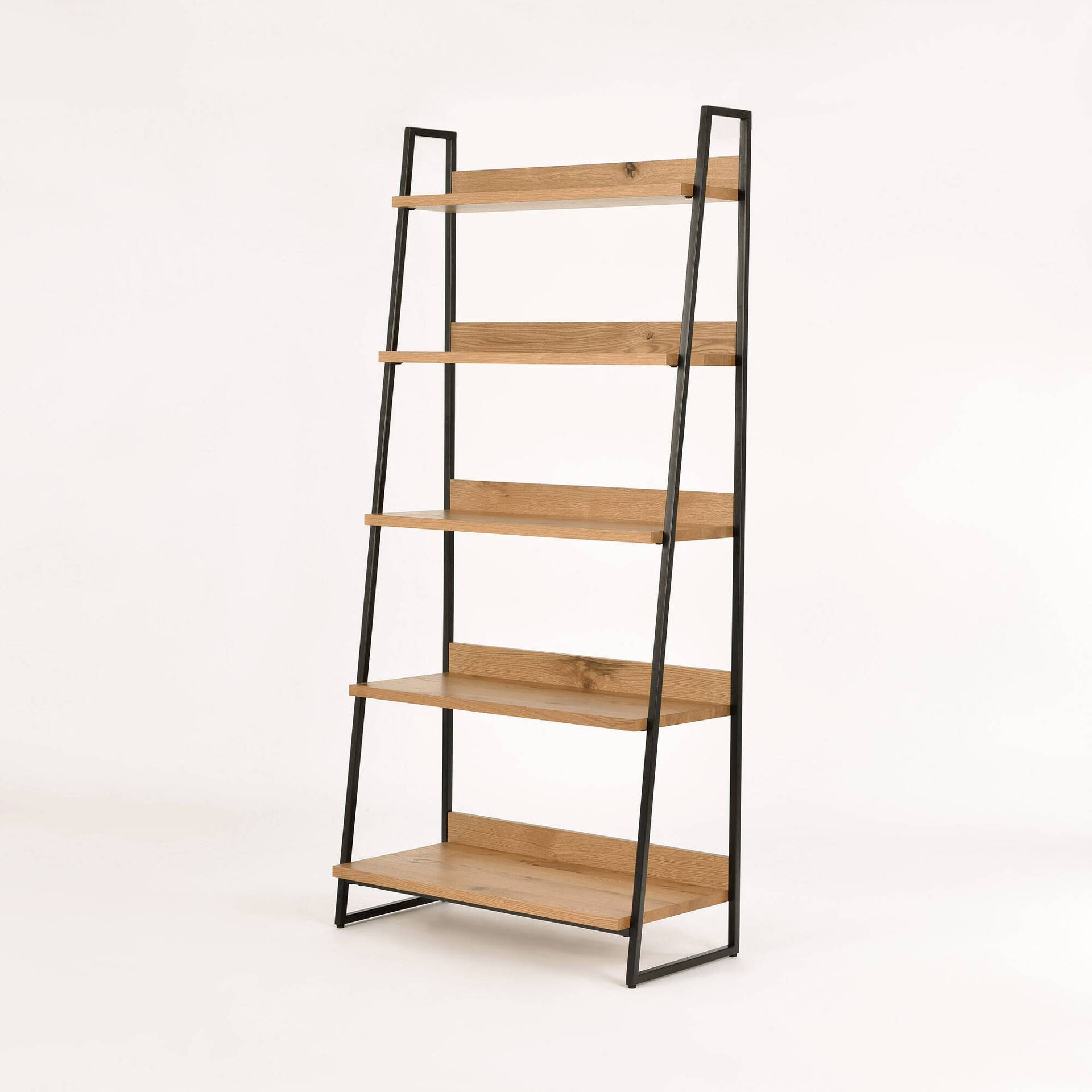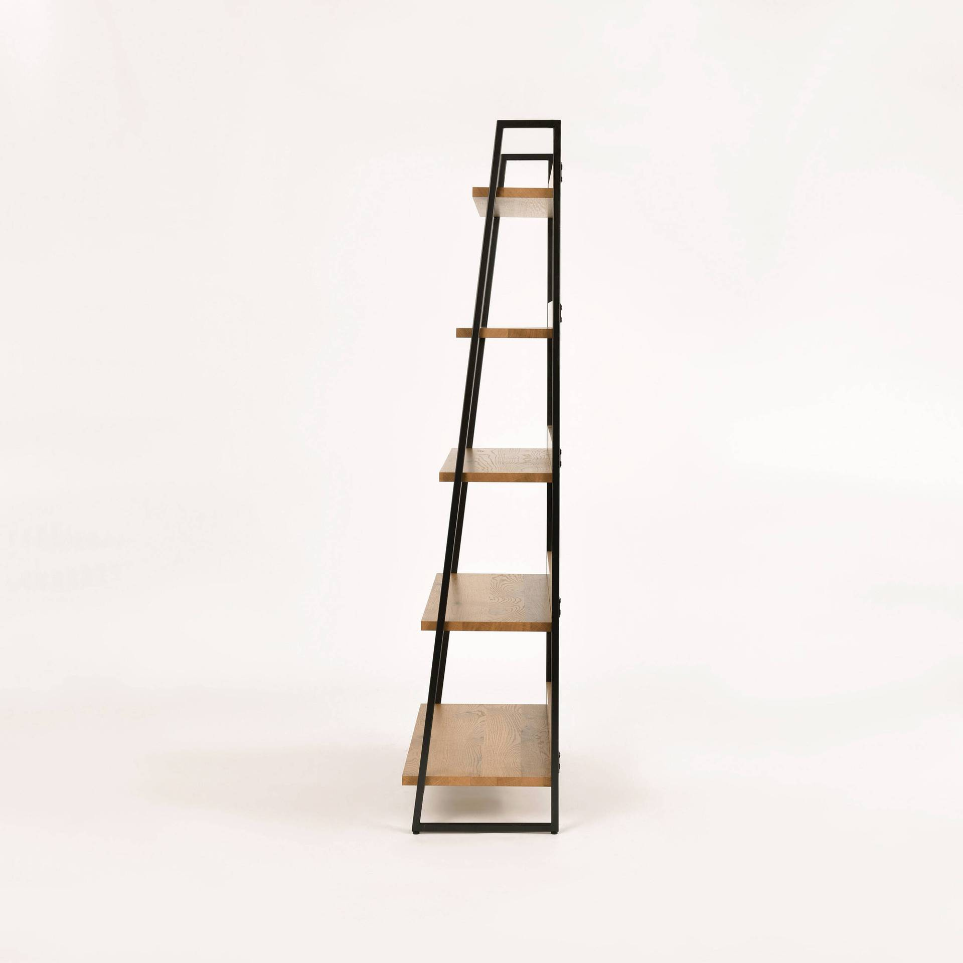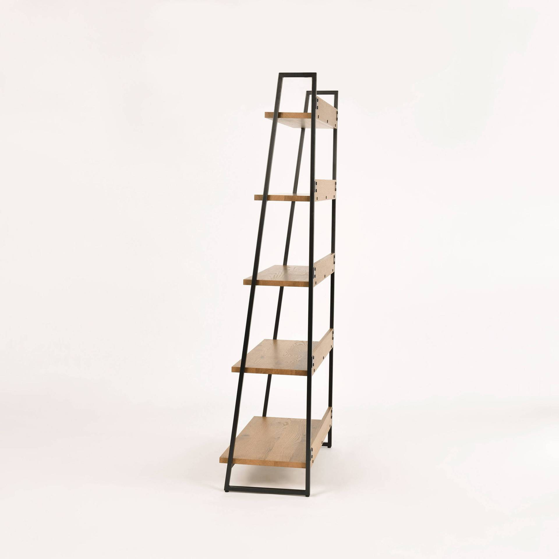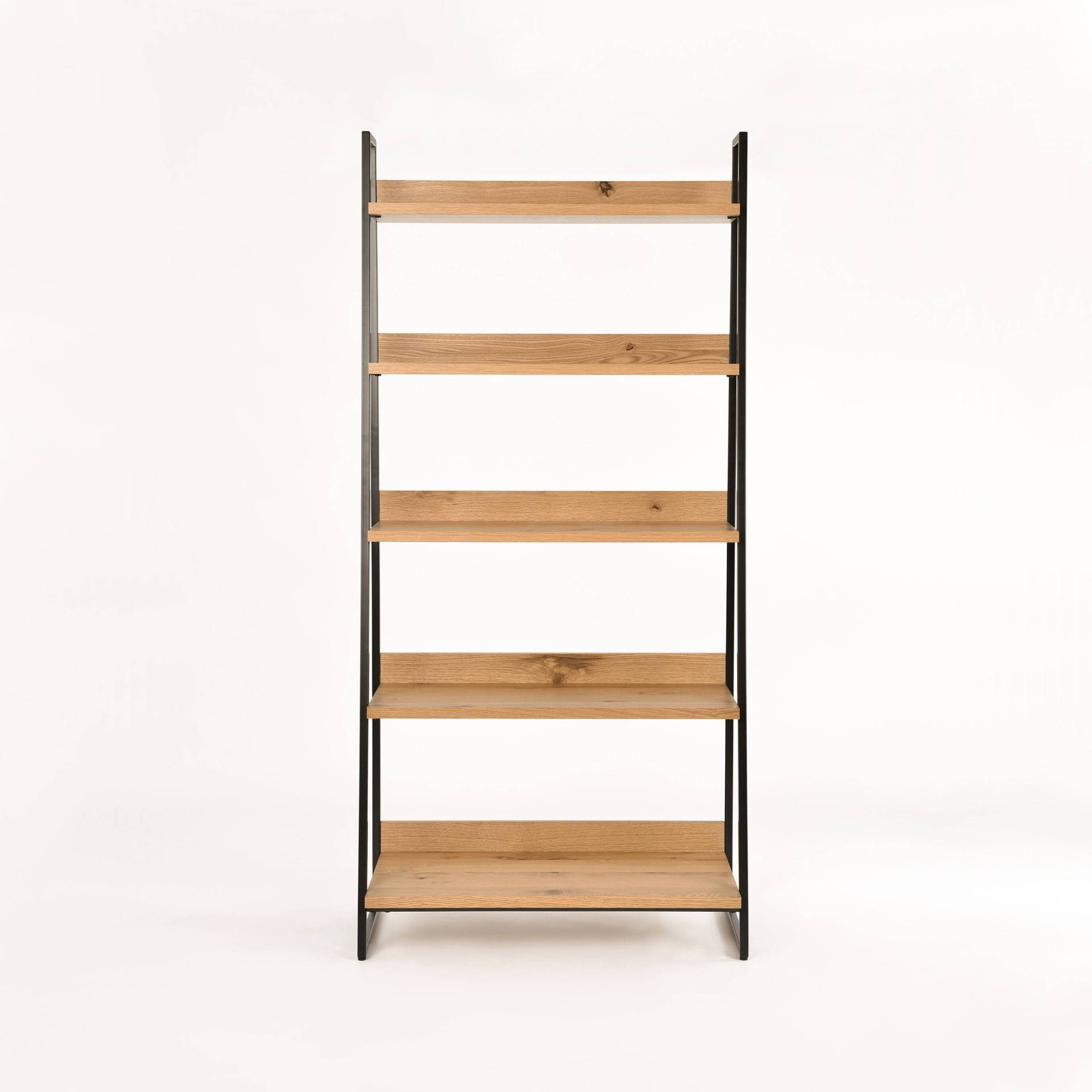 - Regał wykonany z litego drewna białego dębu, osadzony na stalowej konstrukcji.