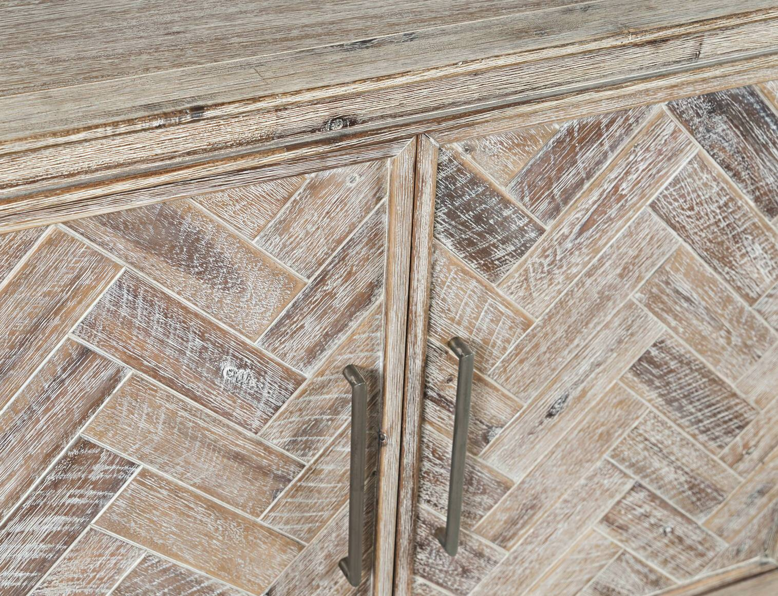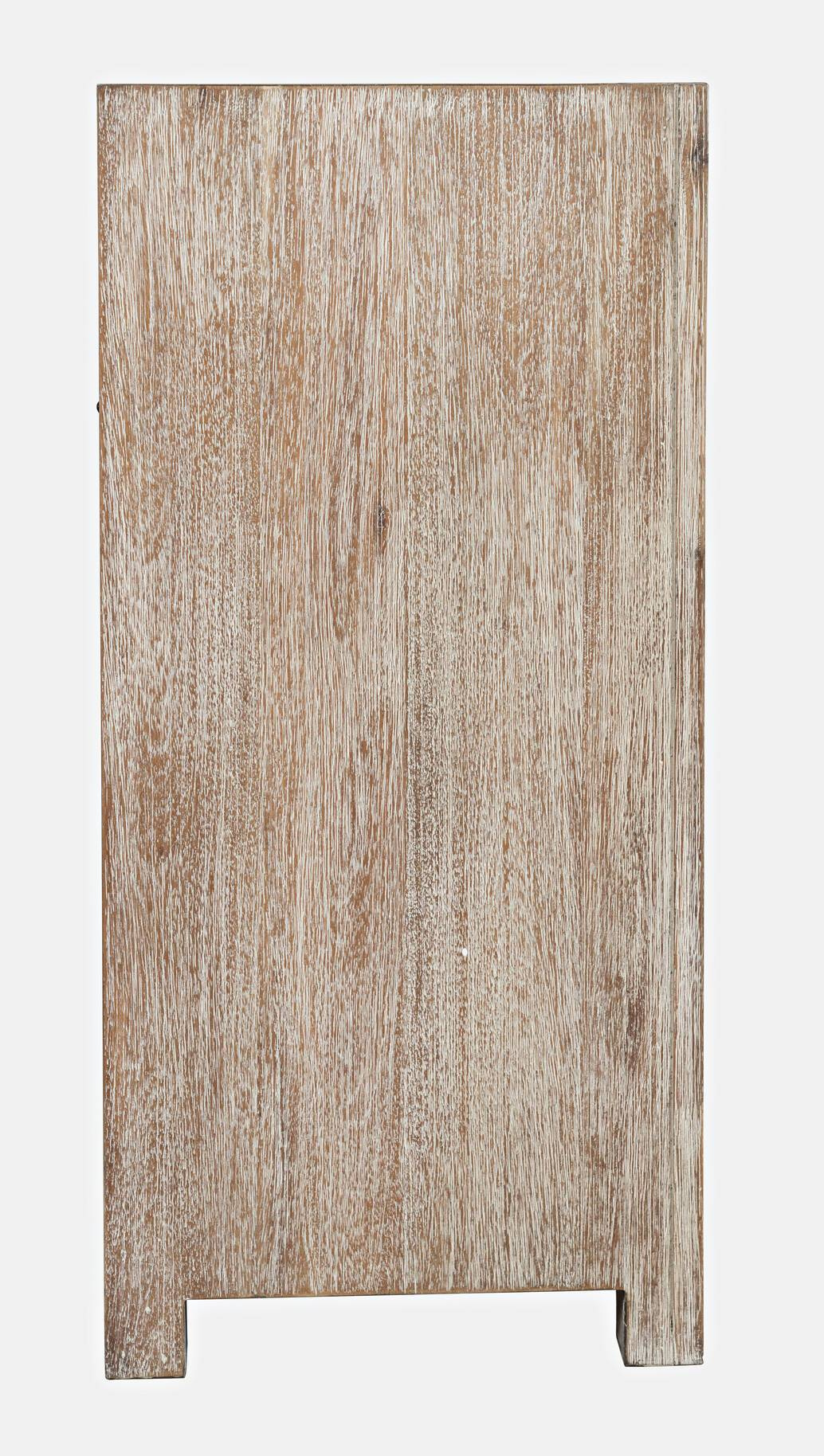 - Komoda z dwojgiem drzwiczek z intarsją i dwiema półkami wykonana z drewna akacji w kolorze jasnobrązowym.