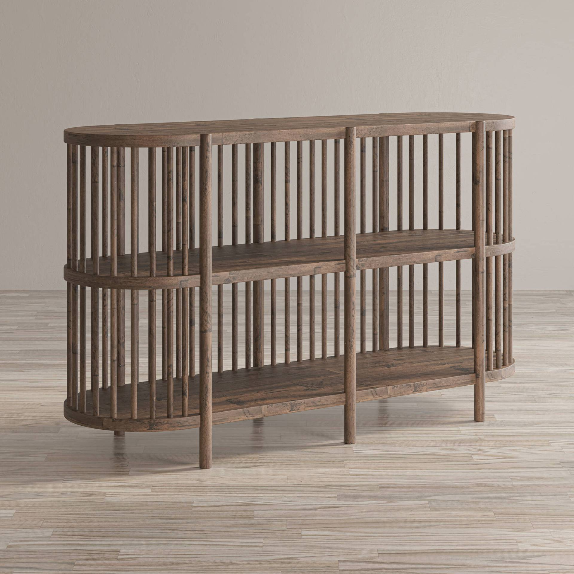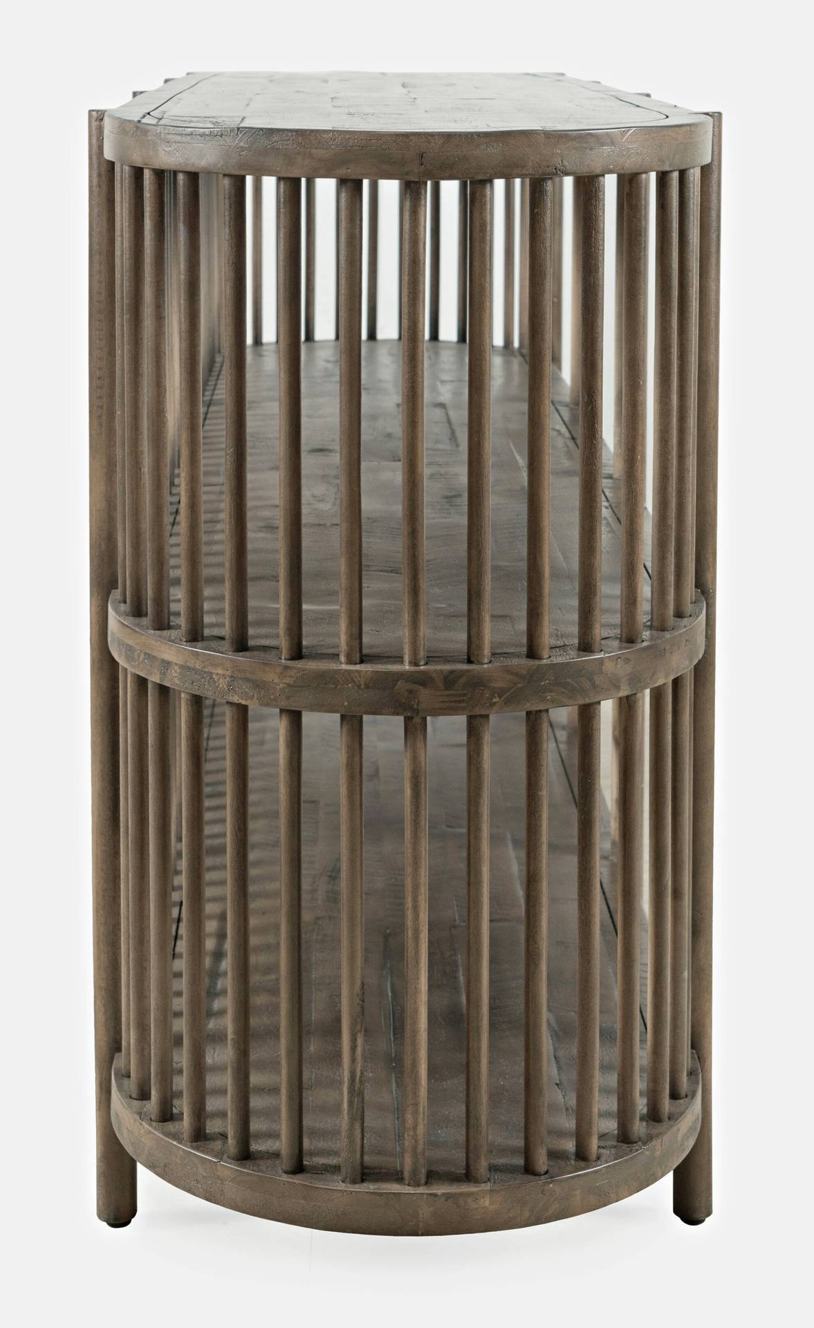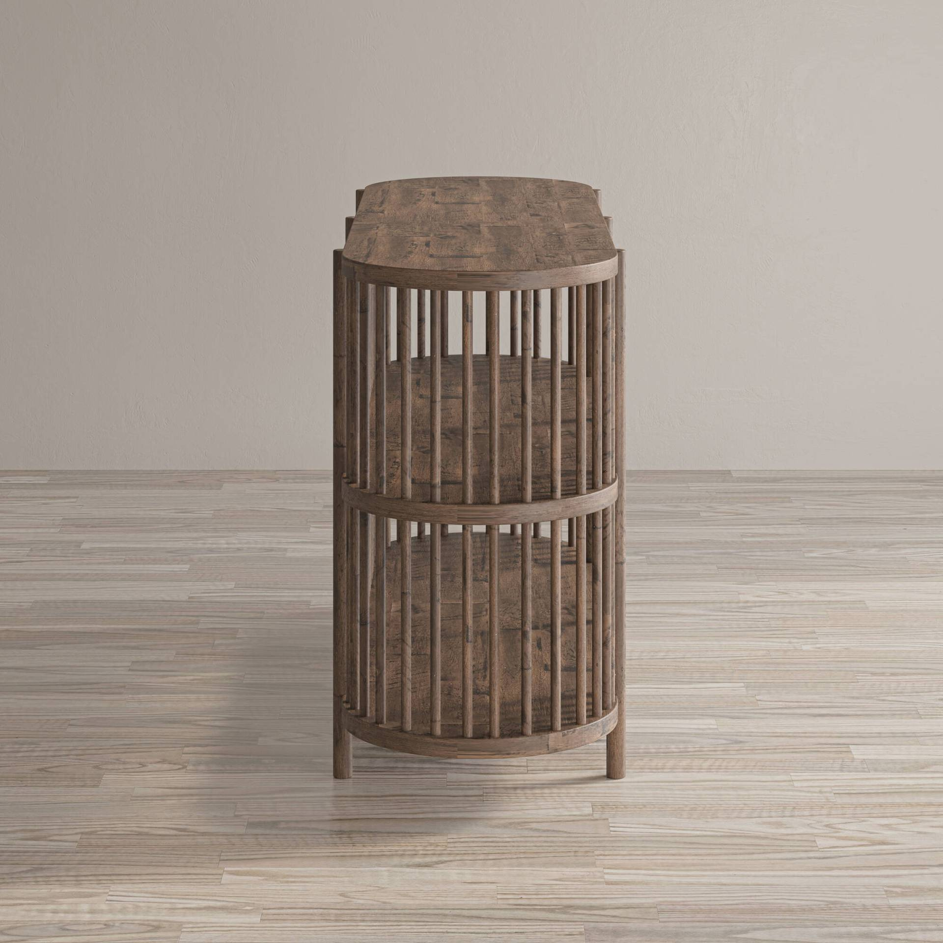 - Komoda o owalnym kształcie o szerokości 137 cm z drewna akacji w kolorze jasnobrązowym z efektownymi pionowymi szczebelkami w stylu industrialnym, vintage, boho.