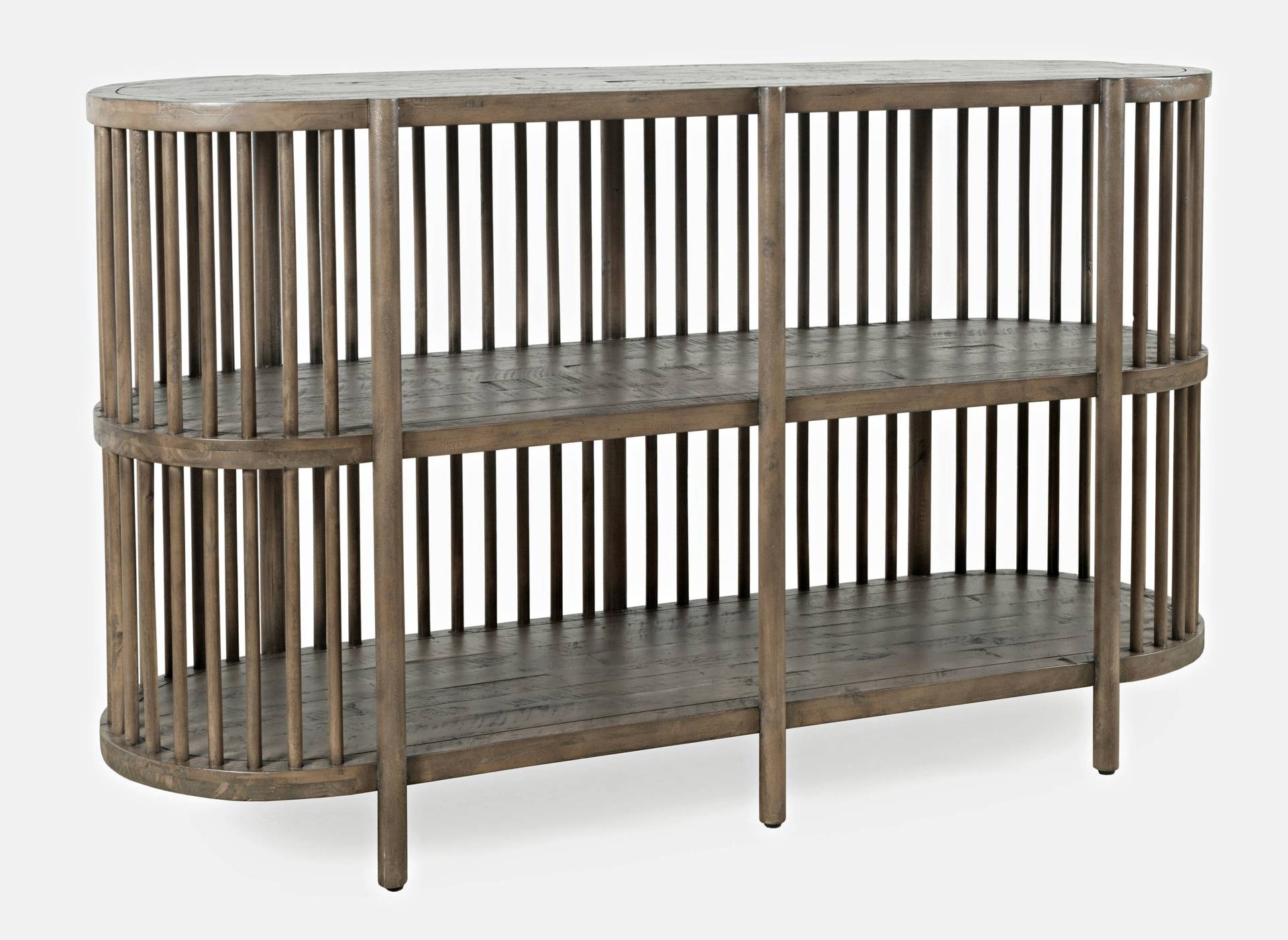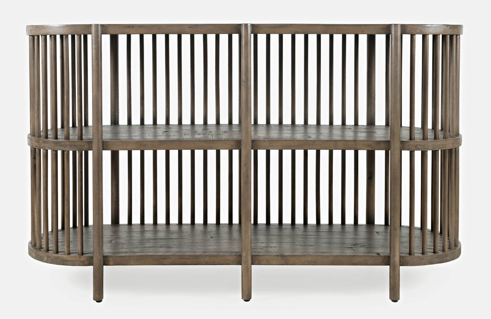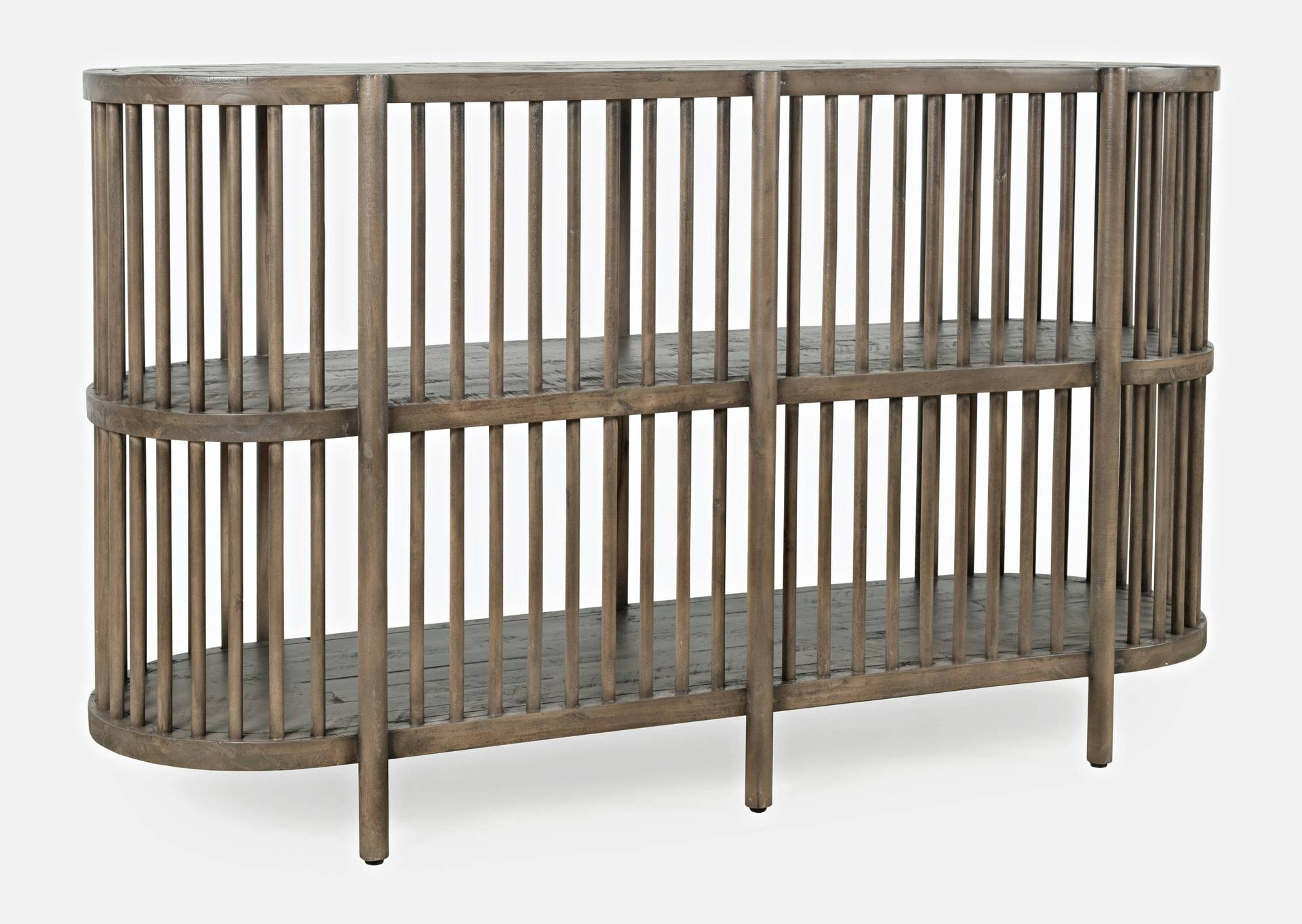 - Komoda o owalnym kształcie o szerokości 137 cm z drewna akacji w kolorze jasnobrązowym z efektownymi pionowymi szczebelkami w stylu industrialnym, vintage, boho.