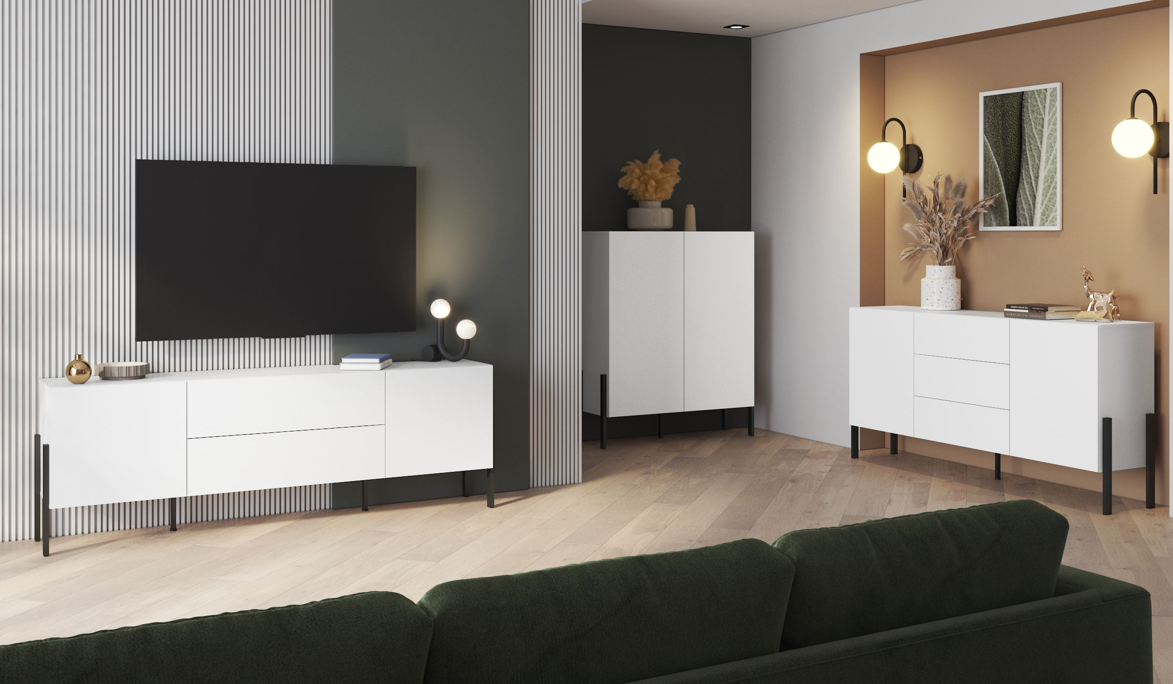 Odkryj elegancję komody RTV Jukon od Helvetia, łączącej biały mat z czarnymi nogami dla nowoczesnego stylu. Praktyczne otwieranie 'push to open' oraz pojemne półki to idealne rozwiązanie do Twojego salonu. łatwy montaż.