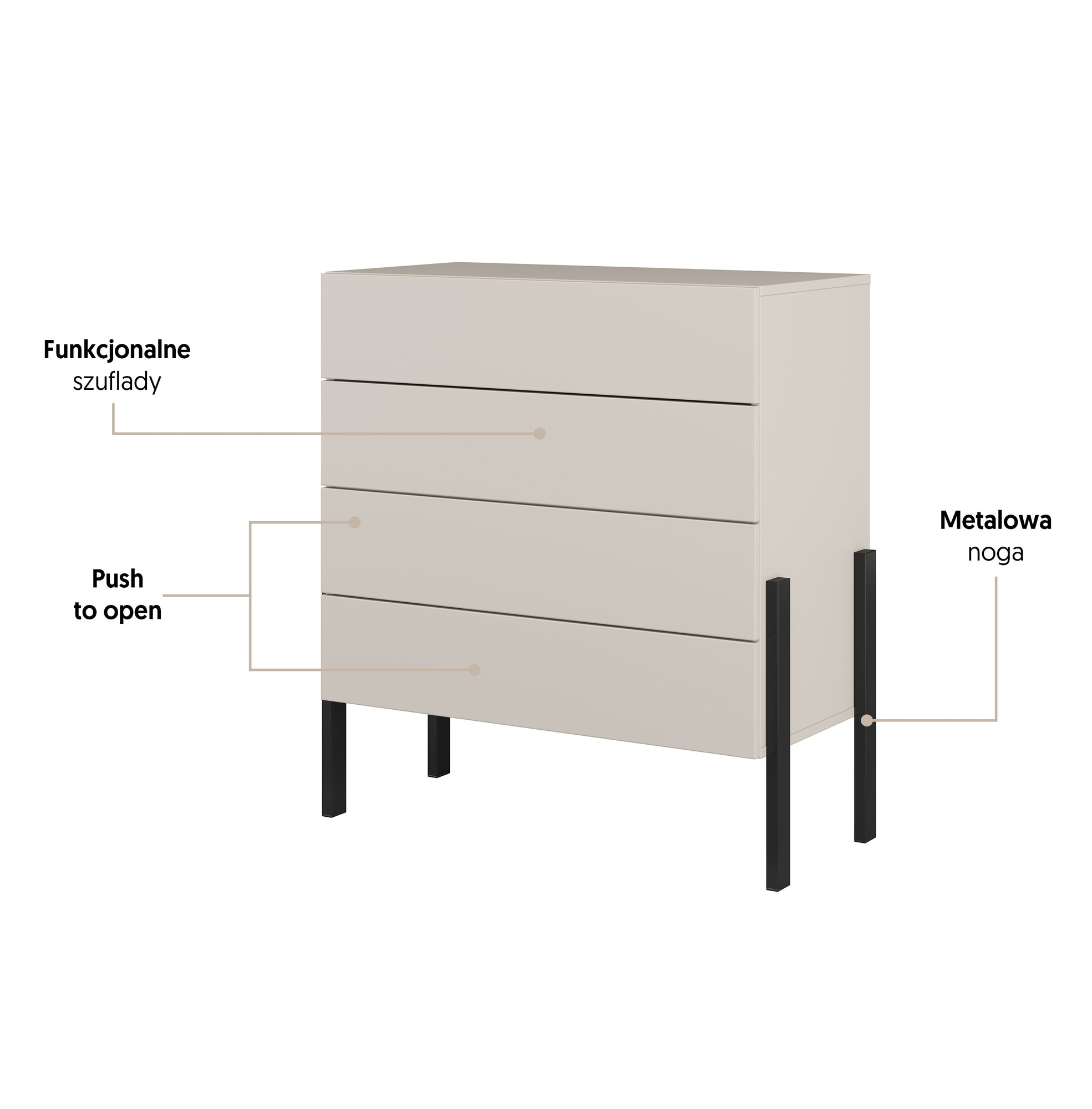Komoda Jukon S to elegancki mebel w kolorze kaszmiru, wyposażony w czarne metalowe nogi. Oferuje funkcjonalne przechowywanie dzięki systemowi Push to open oraz wygodnym prowadnicom rolkowym. Idealna do nowoczesnych wnętrz, łatwa w montażu.