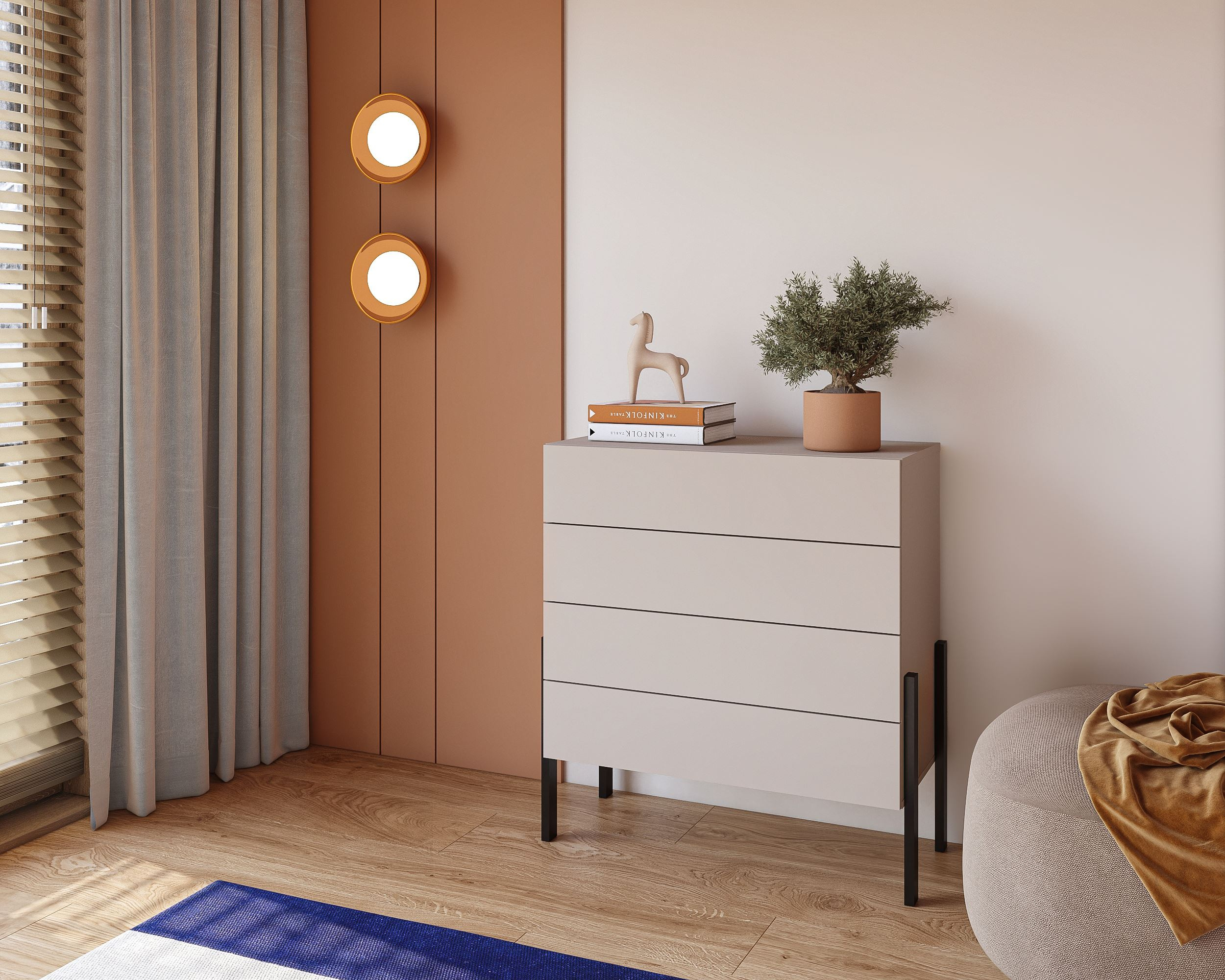 Czarny, matowy kolor metalowych nóg nadaje komodzie nie tylko stabilności, ale również stylowego wyglądu. Kontrast między ciepłym kolorem kaszmiru a chłodnym, industrialnym akcentem nóg sprawia, że ta komoda wyróżnia się spośród innych dostępnych na rynku. Dzięki temu staje się idealnym rozwiązaniem do każdego pomieszczenia – zarówno do salonu, jak i sypialni.