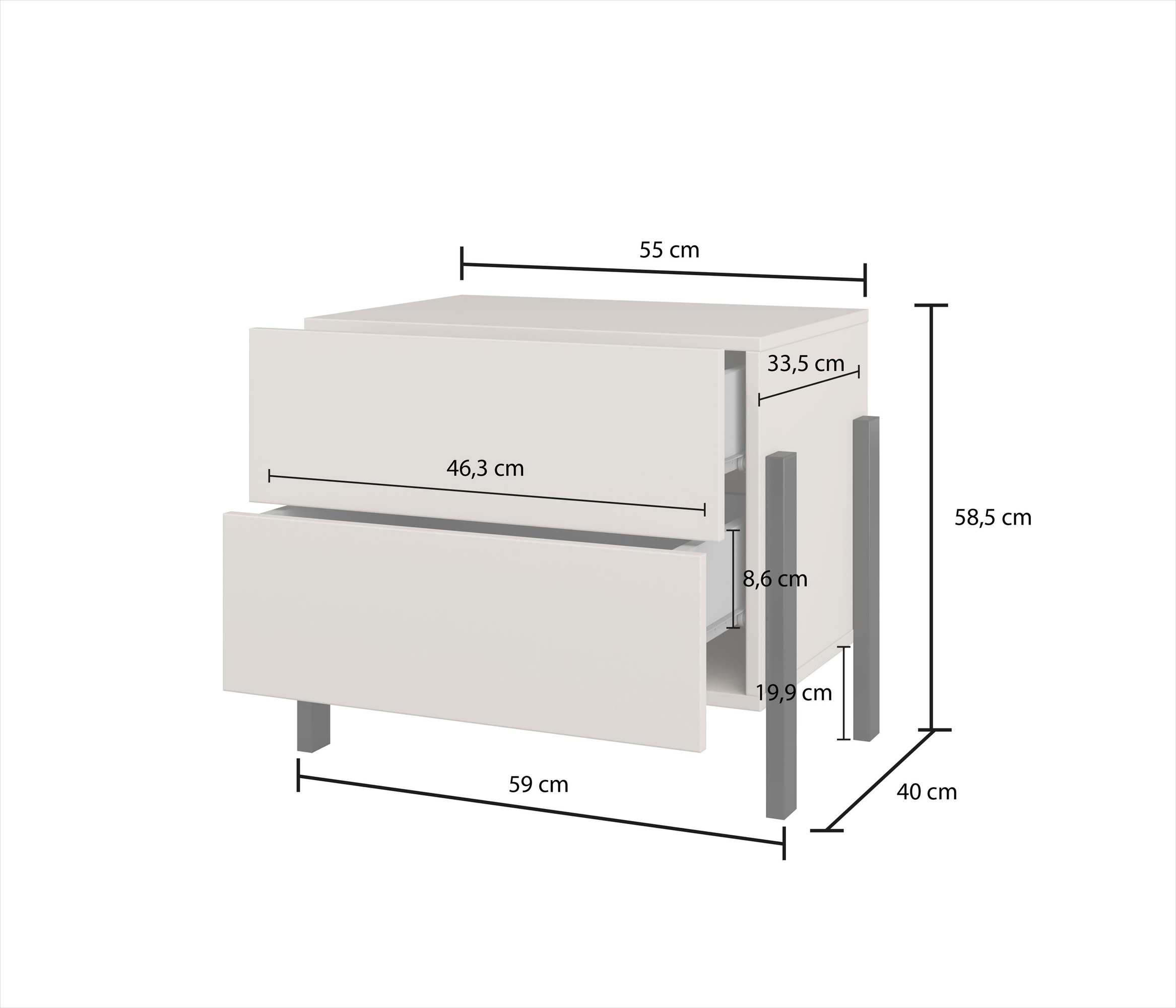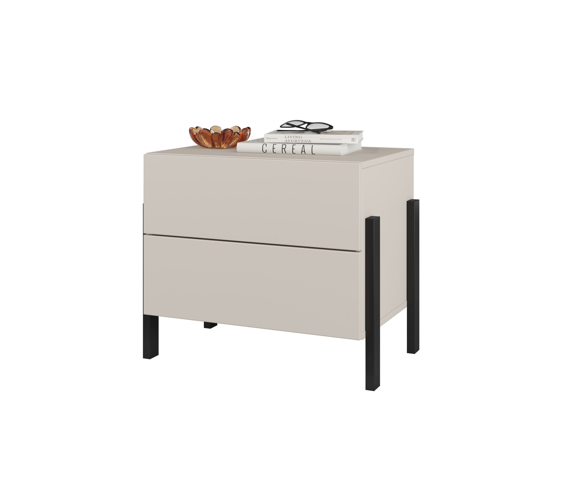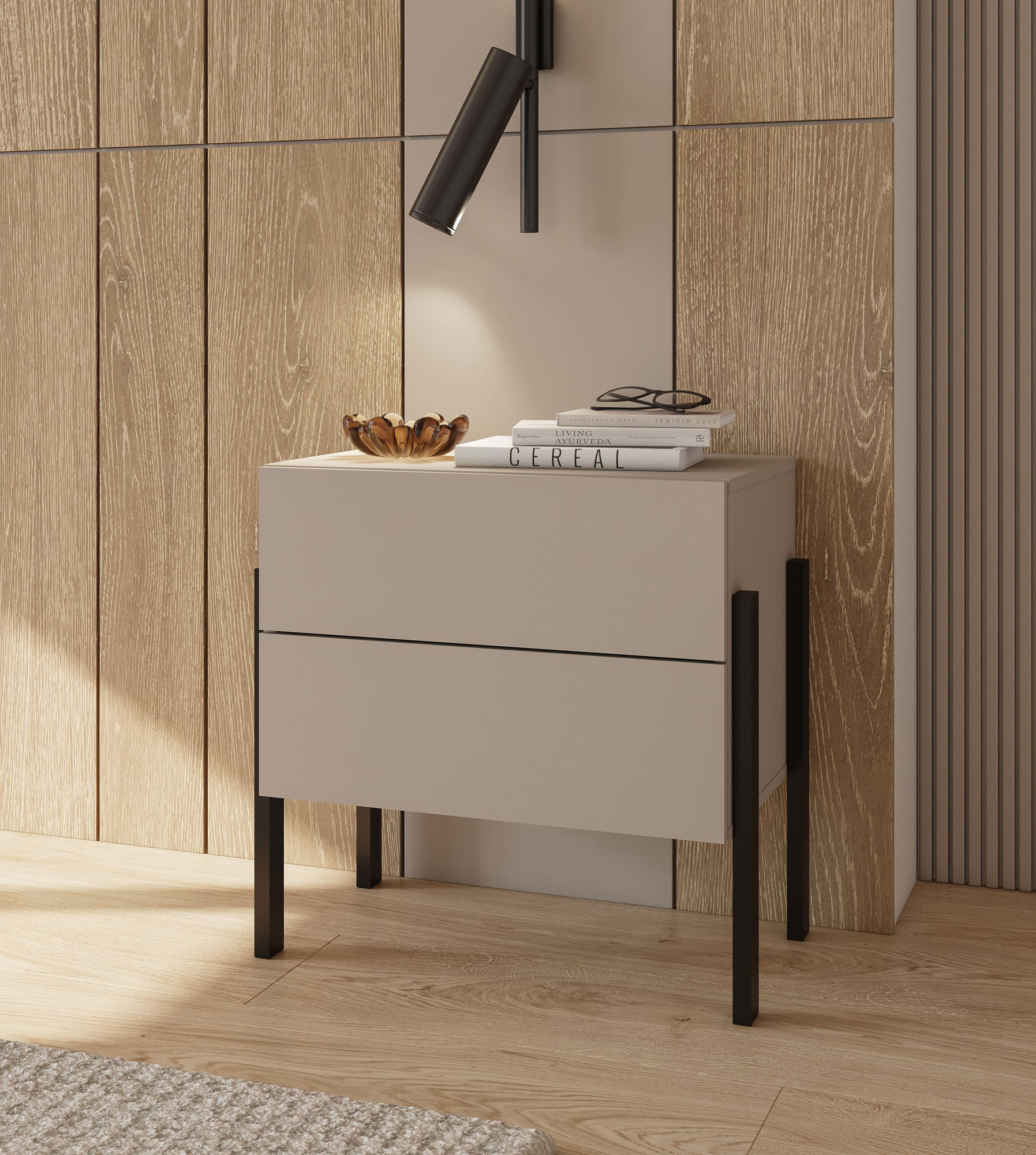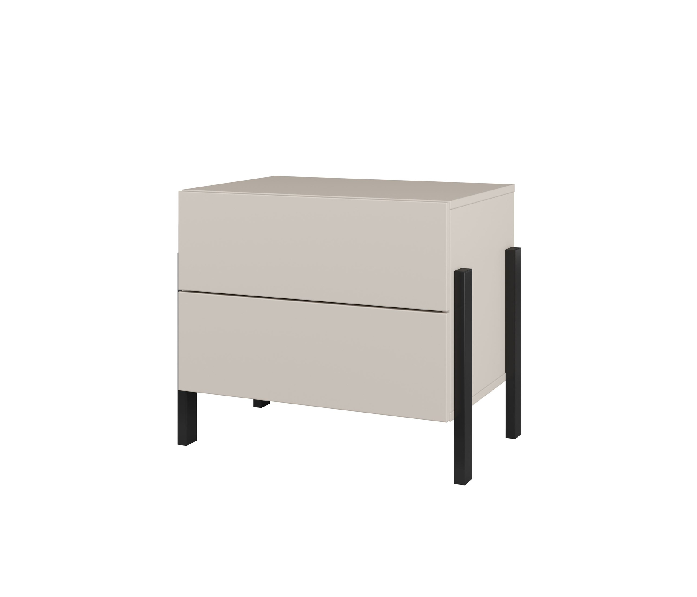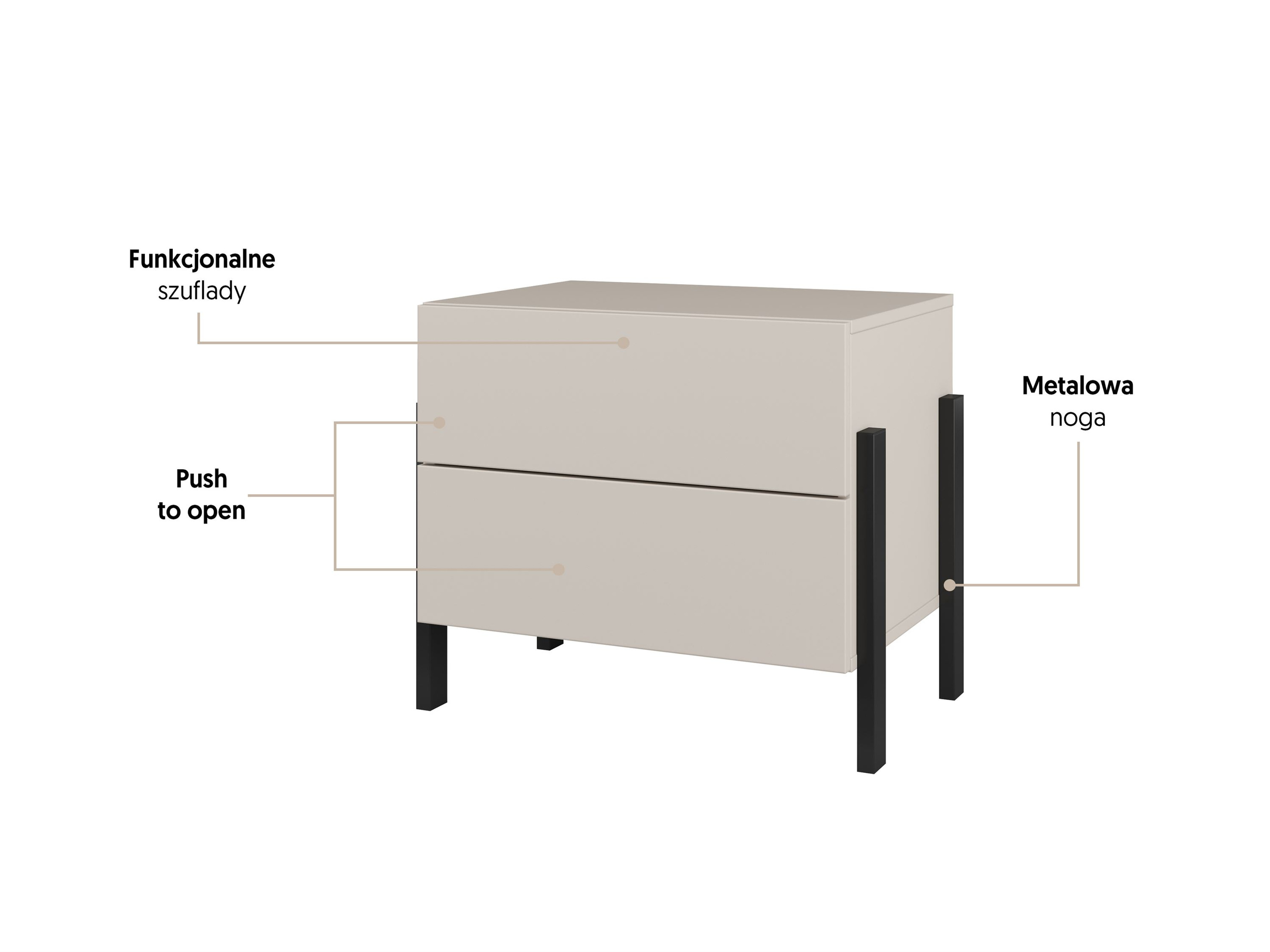 Elegancka szafka nocna Jukon S w kolorze kaszmiru to idealne uzupełnienie Twojej sypialni. Posiada 2 pojemne szuflady i nowoczesne czarne metalowe nogi. Otwieranie typu push to open zapewnia wygodę, a minimalistyczny design wprowadza harmonię do wnętrza.