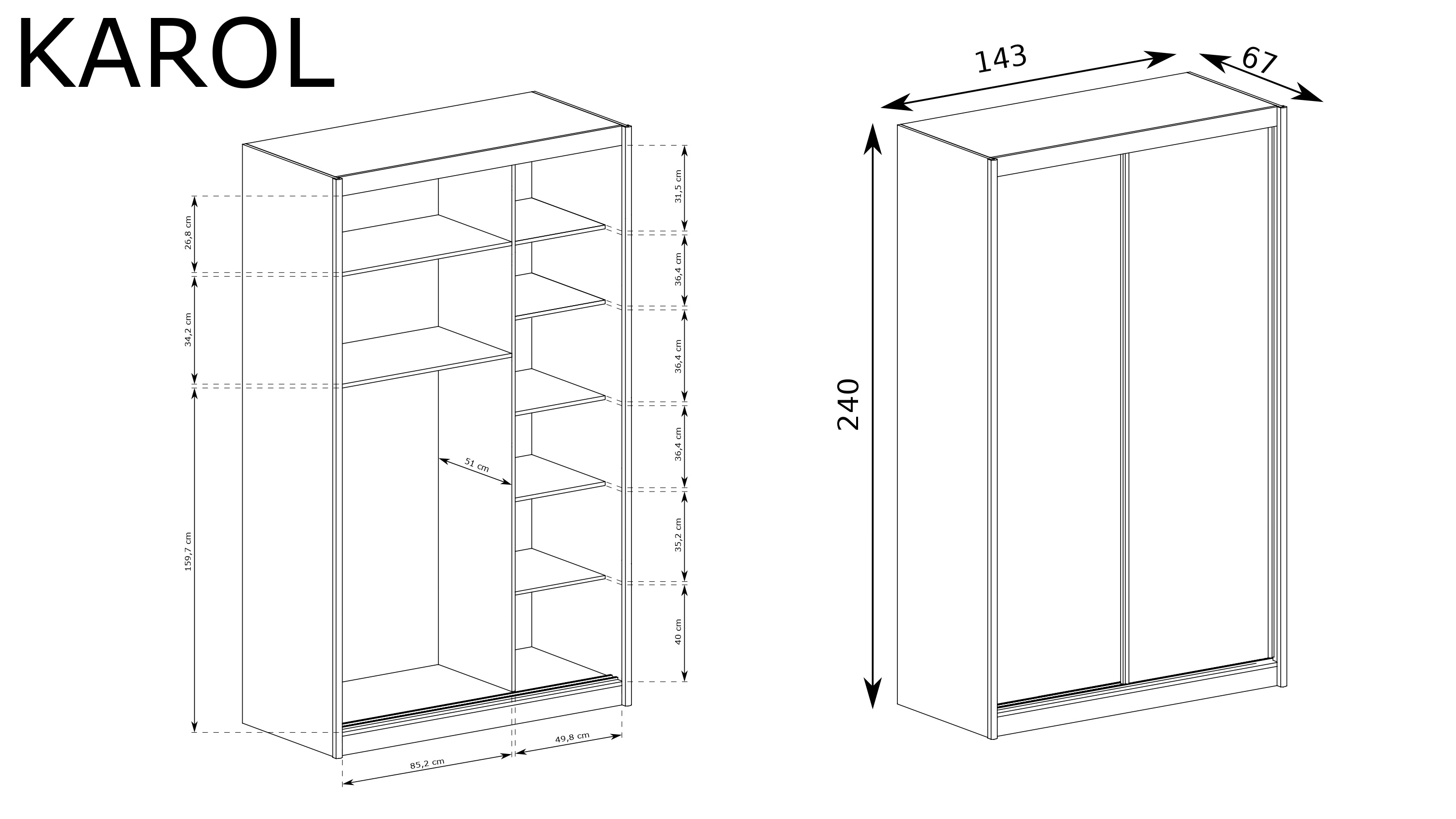 - KAROL to szafa 2D2S z drzwiami przesuwnymi w eleganckim dębie Sonoma. Jej funkcjonalny design optymalizuje przestrzeń, a możliwość wyboru kolorów sprawia, że idealnie wtapia się w każde wnętrze. Wytrzymałe materiały i metalowe prowadnice gwarancji.