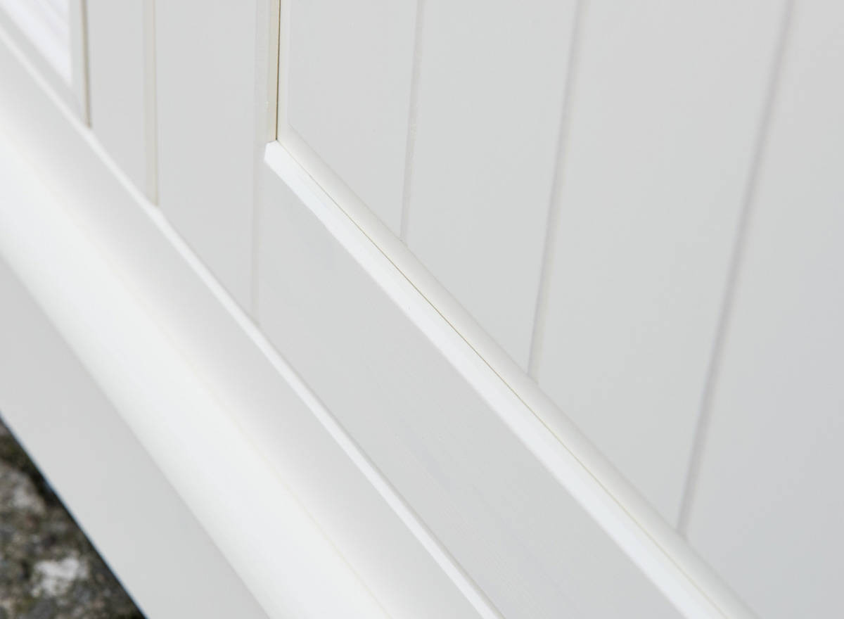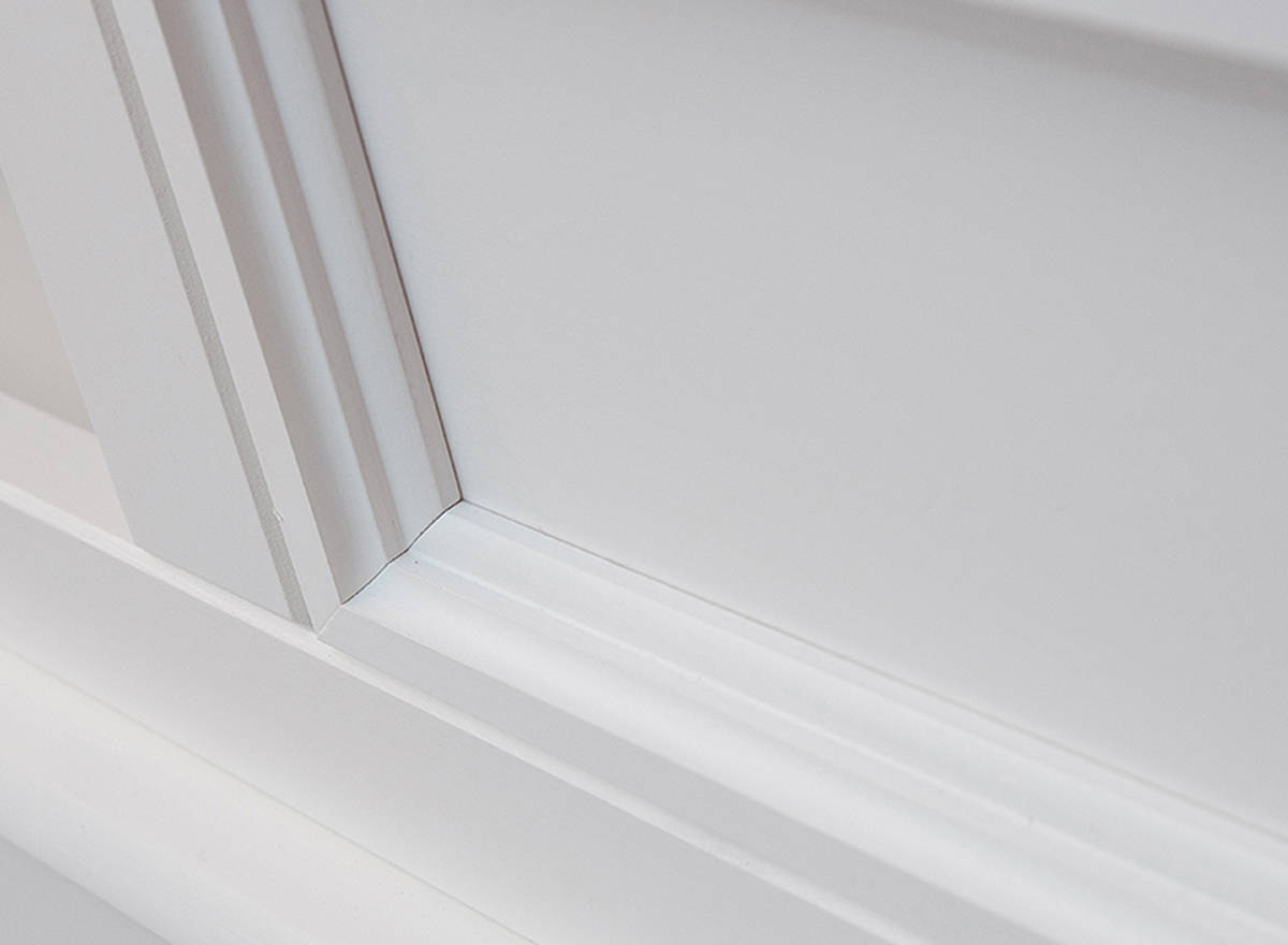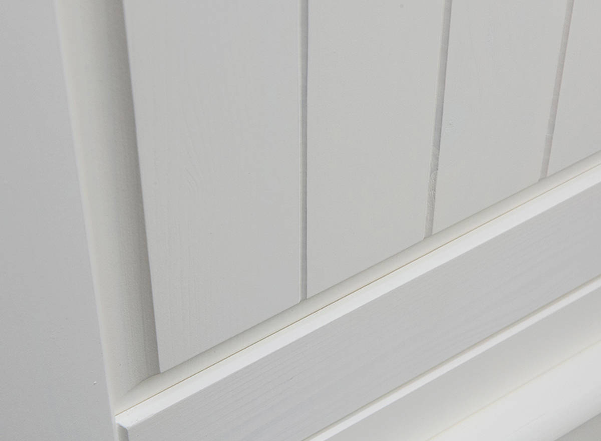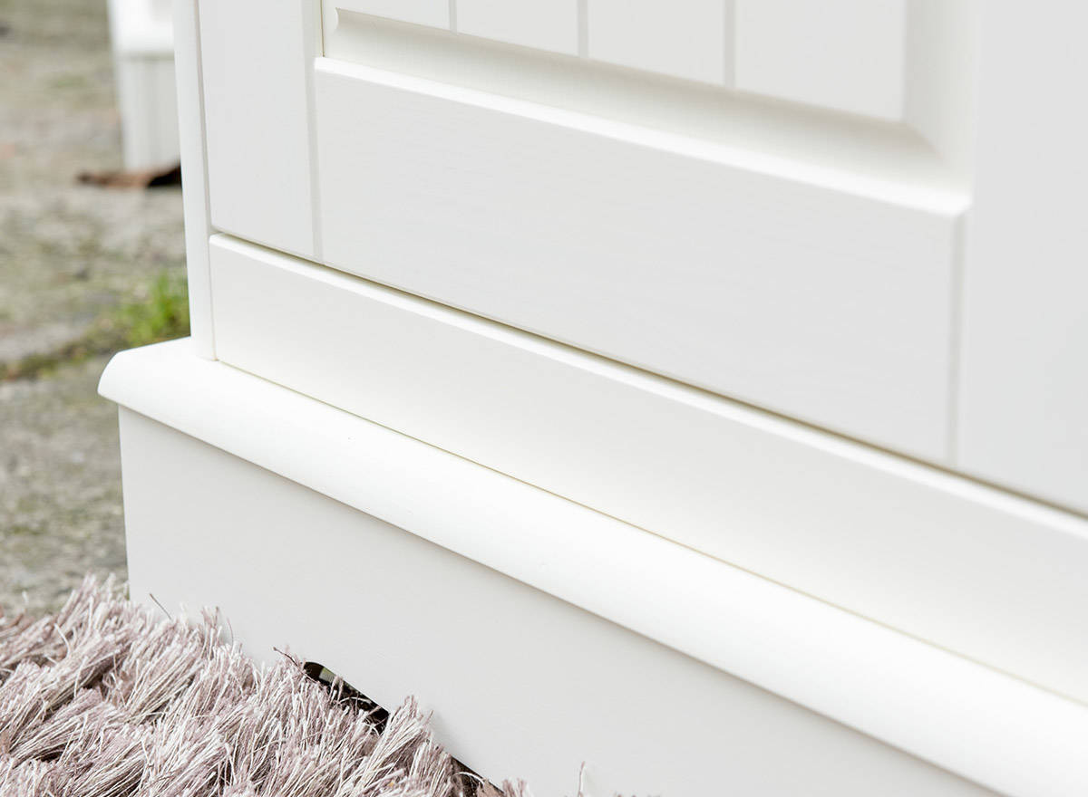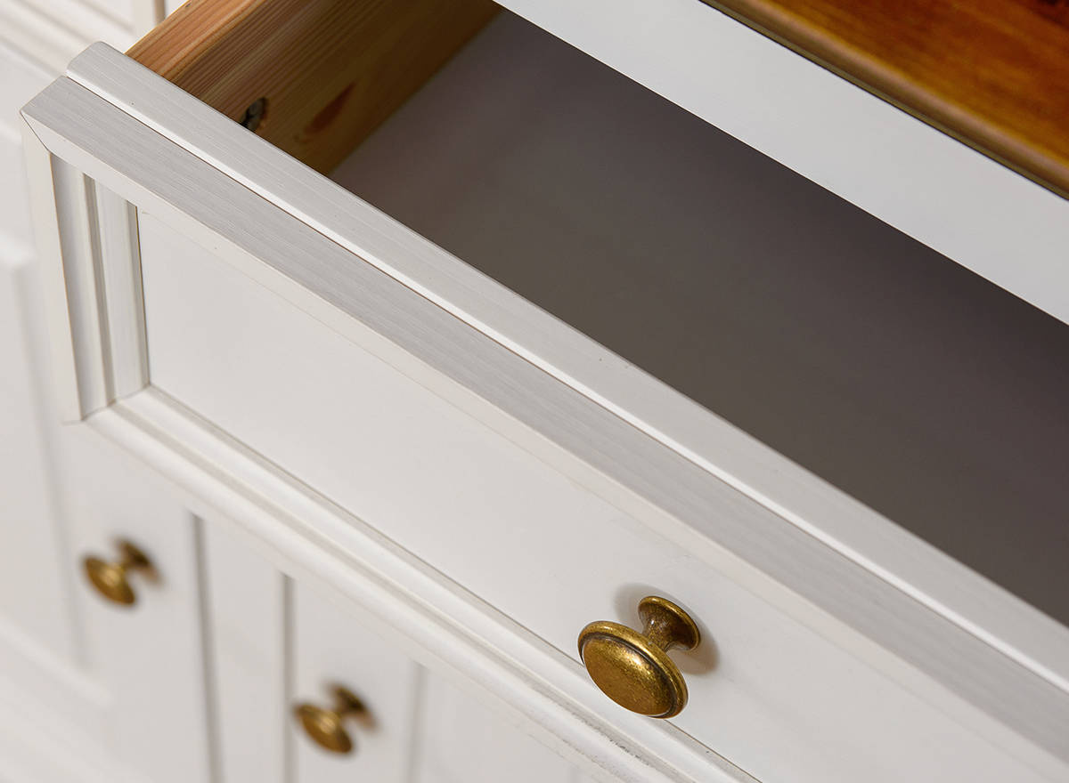 - Komoda trzydrzwiowa z trzema półkami i trzema szufladami z naturalnego drewna dębowego w kolorze białym z blatem w kolorze dębowym.