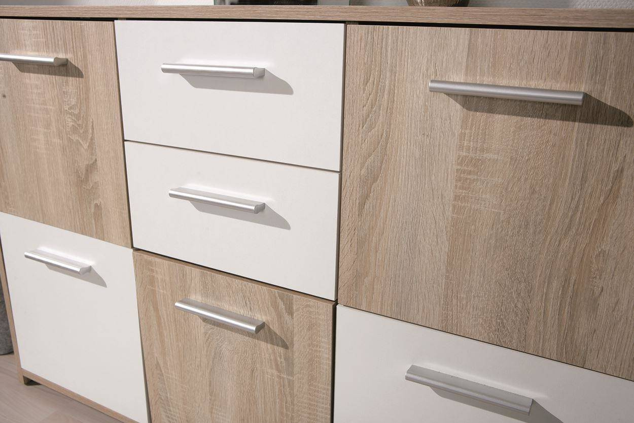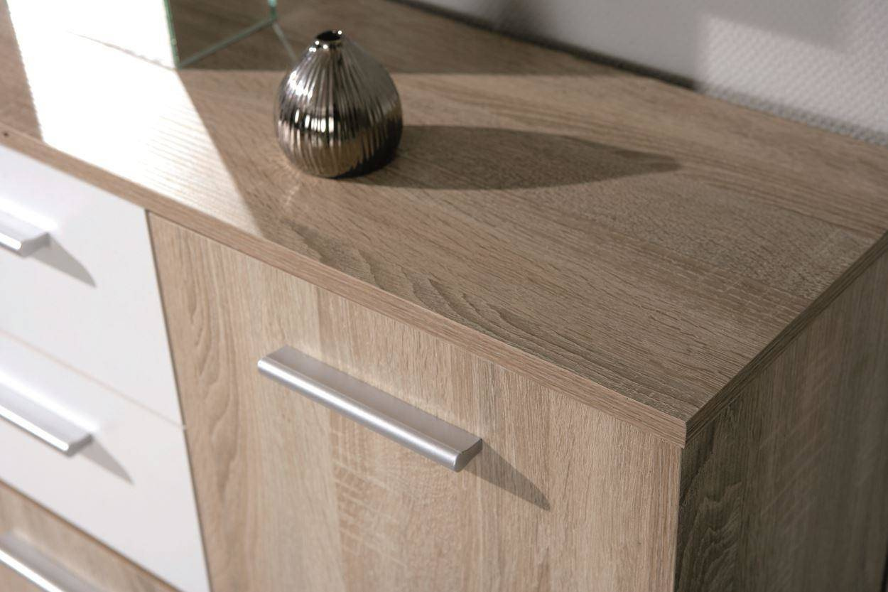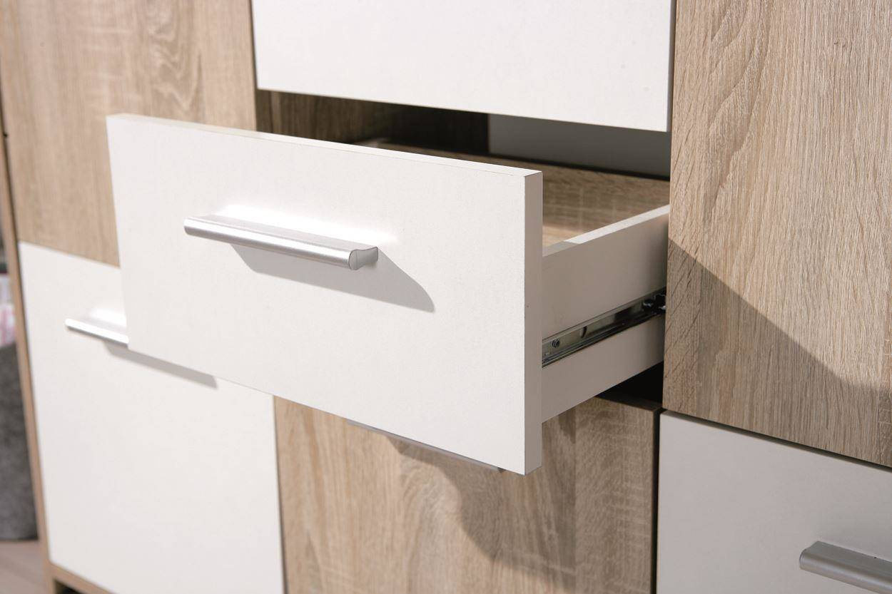 - Komoda o szerokości 115 cm z pięciorgiem drzwiczek i dwiema szufladami, ze srebrnymi uchwytami wykonana z drewna w kolorystyce bieli i dębu sonoma. Komoda wodoodporna i łatwa w czyszczeniu.