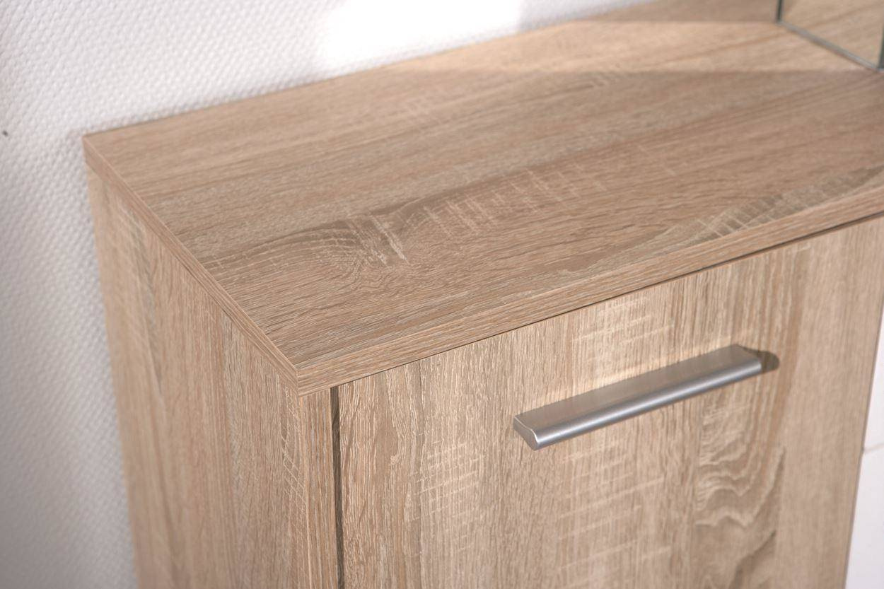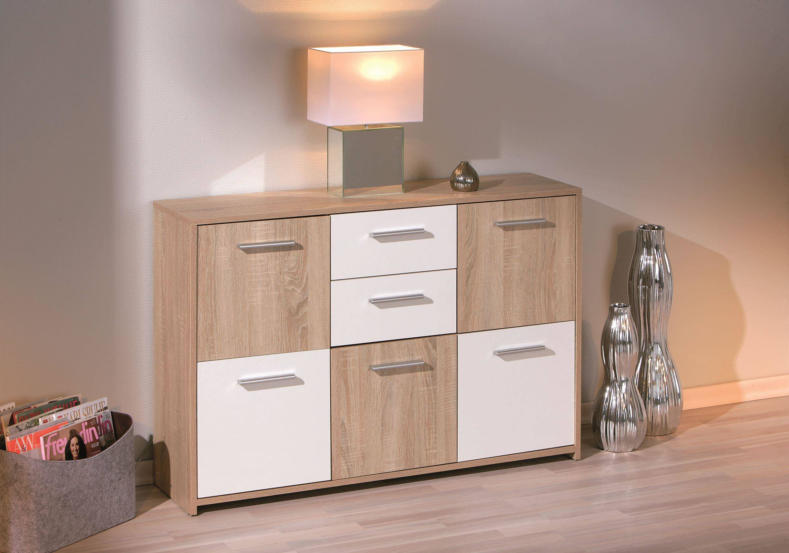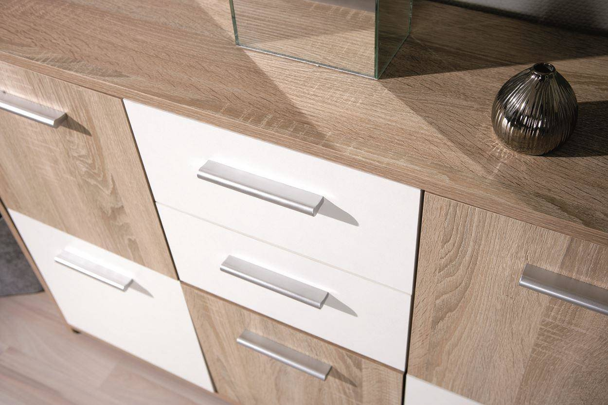 - Komoda o szerokości 115 cm z pięciorgiem drzwiczek i dwiema szufladami, ze srebrnymi uchwytami wykonana z drewna w kolorystyce bieli i dębu sonoma. Komoda wodoodporna i łatwa w czyszczeniu.