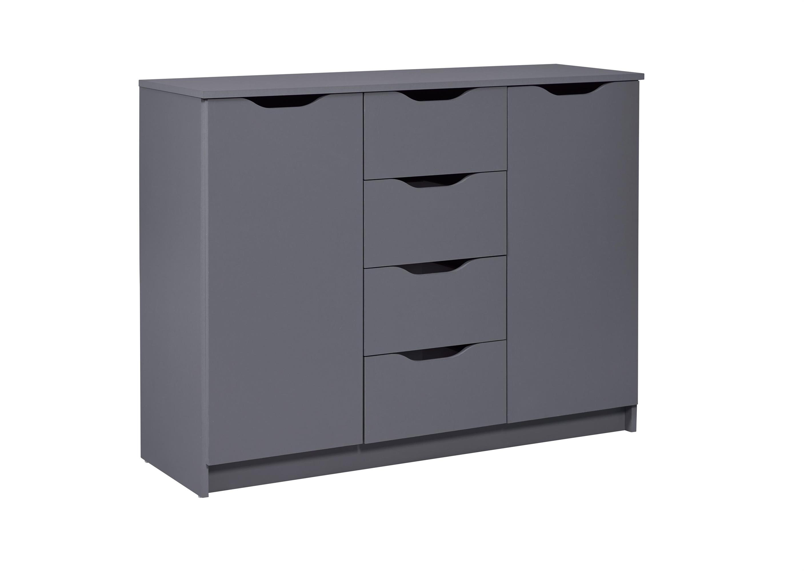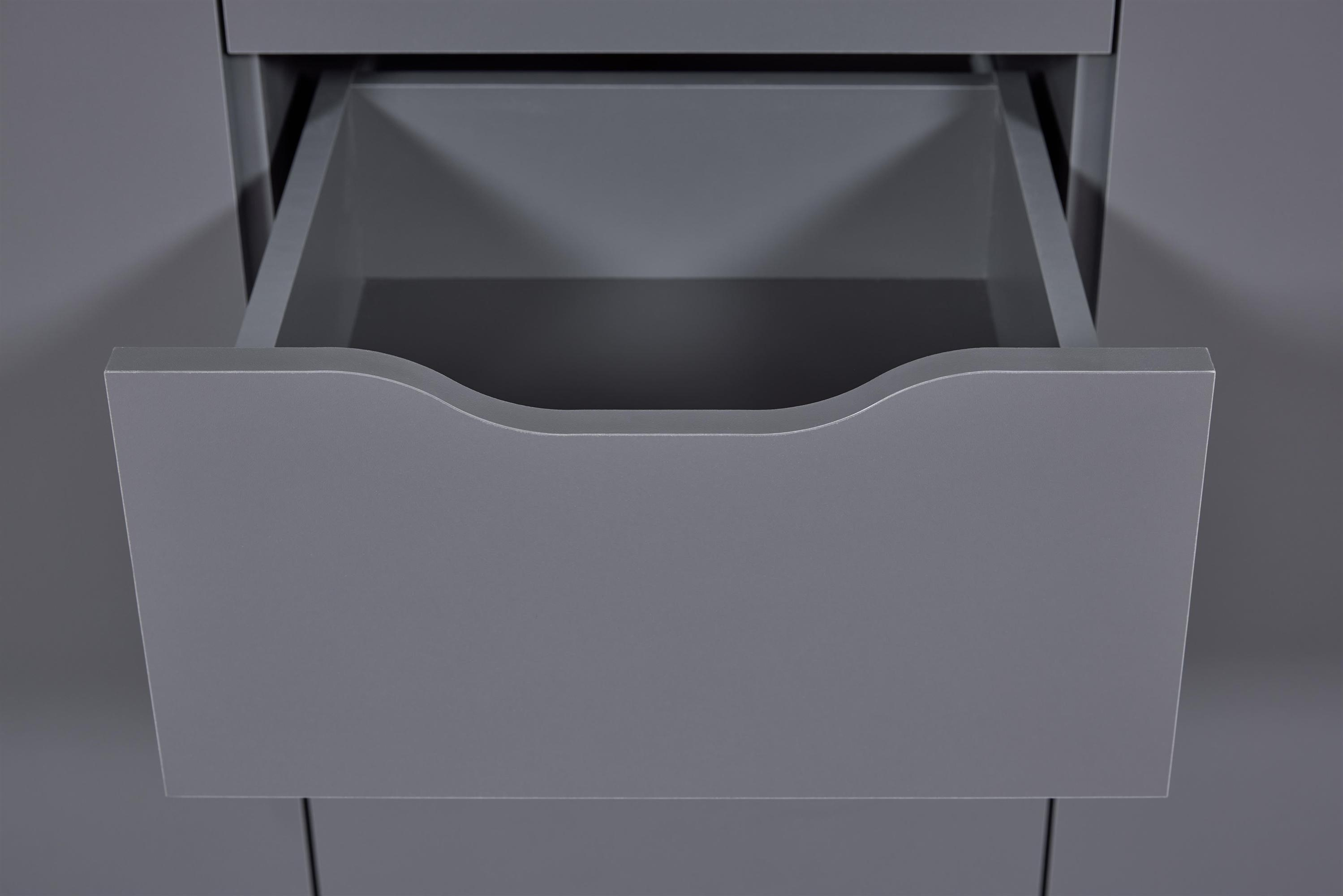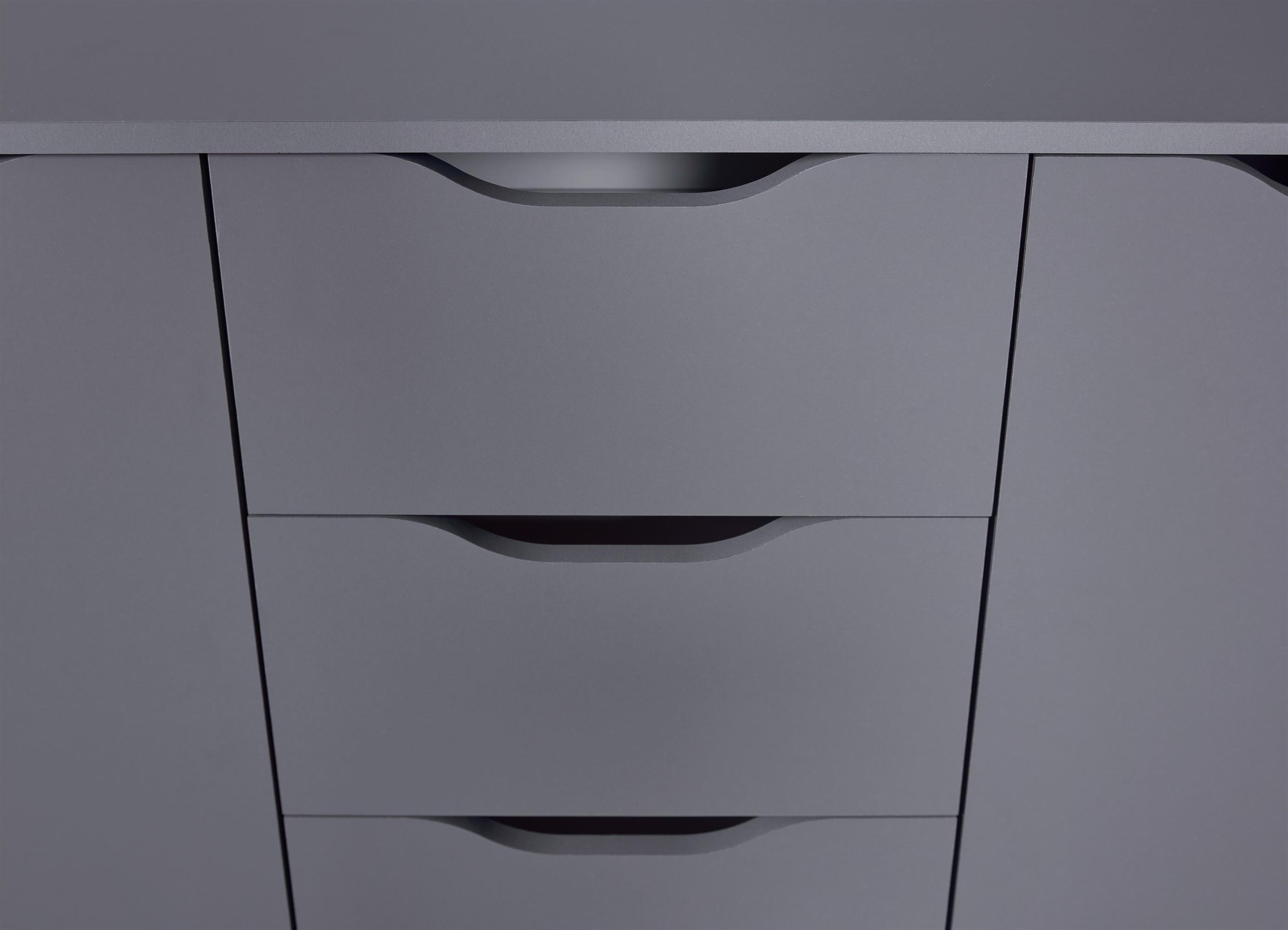- Komoda o szerokości 122 cm z 6 szufladami na łatwych do prowadzenia metalowych prowadnicach wykonana z drewna w kolorze ciemnoszarym. Otwieranie szuflad ułatwiają praktyczne uchwyty wpuszczone w ich przednią część.