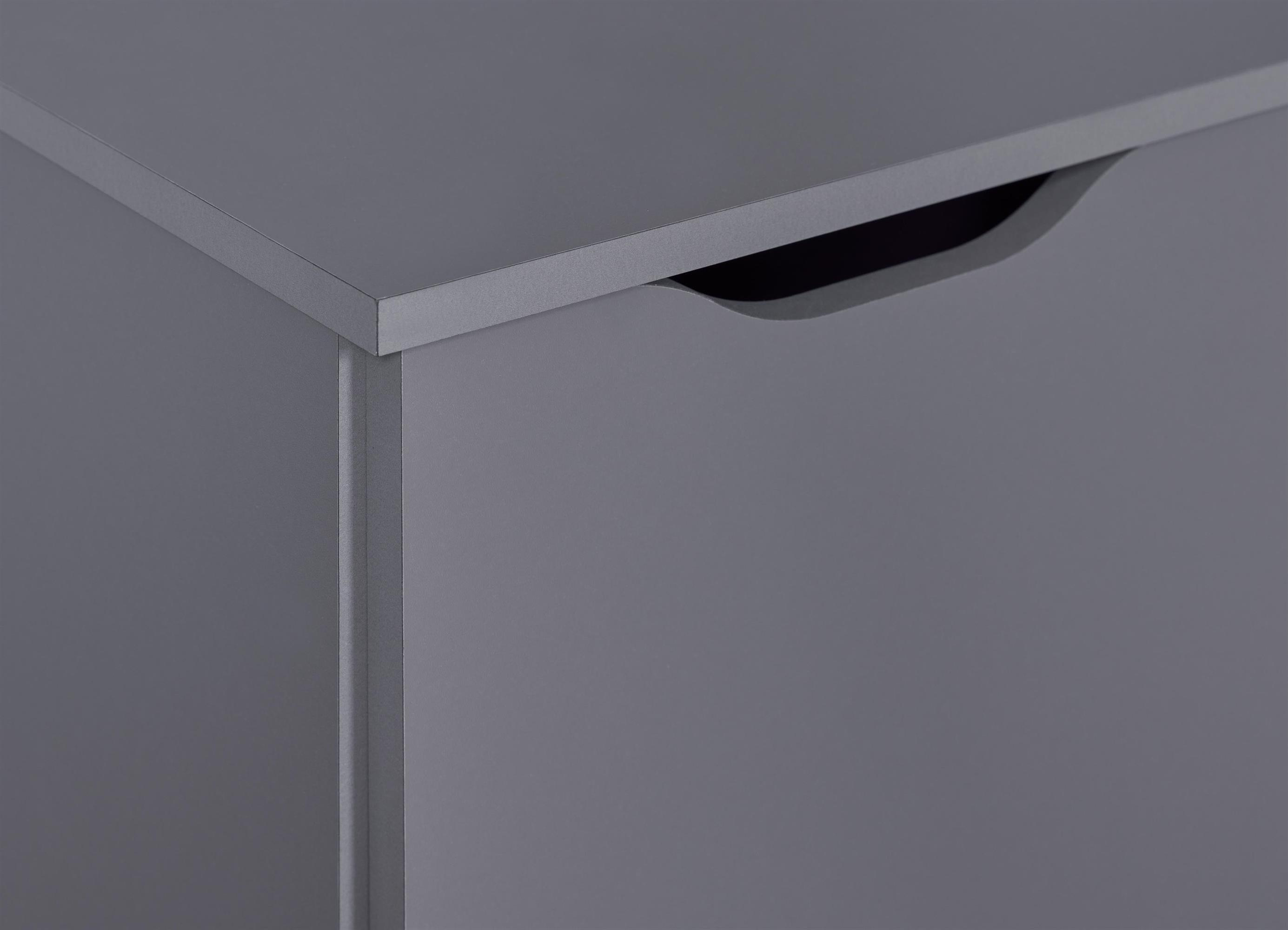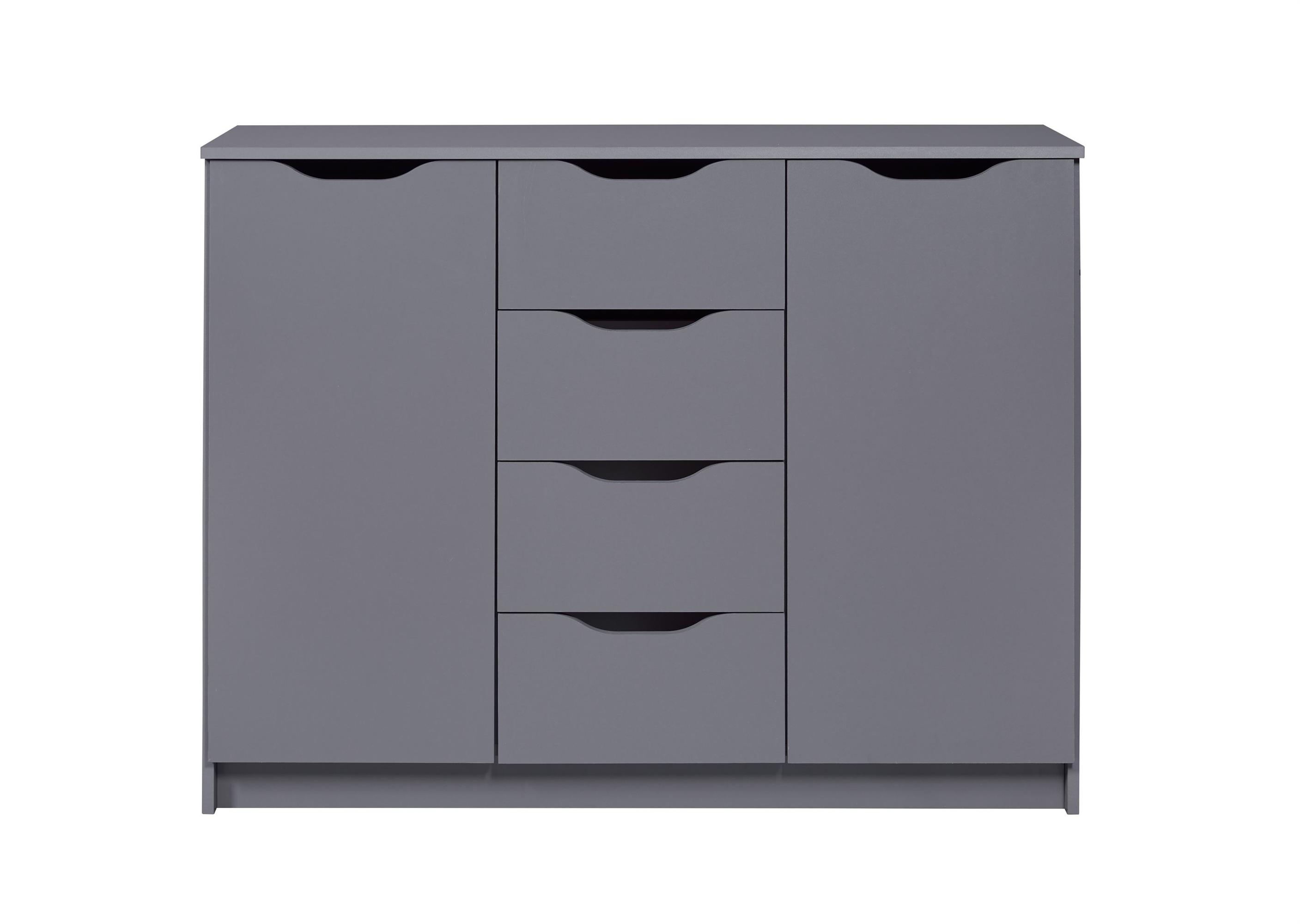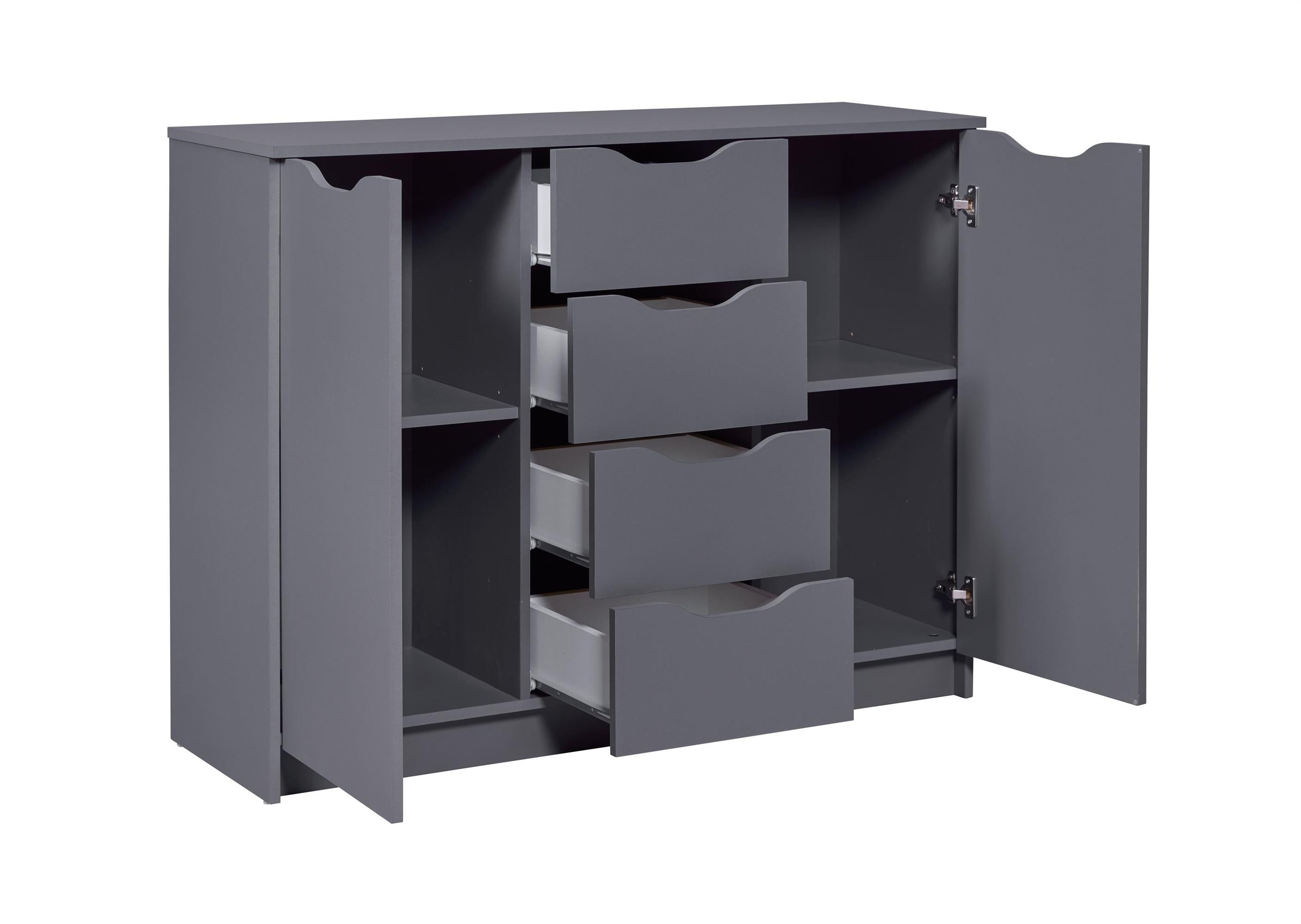 - Komoda o szerokości 122 cm z 6 szufladami na łatwych do prowadzenia metalowych prowadnicach wykonana z drewna w kolorze ciemnoszarym. Otwieranie szuflad ułatwiają praktyczne uchwyty wpuszczone w ich przednią część.