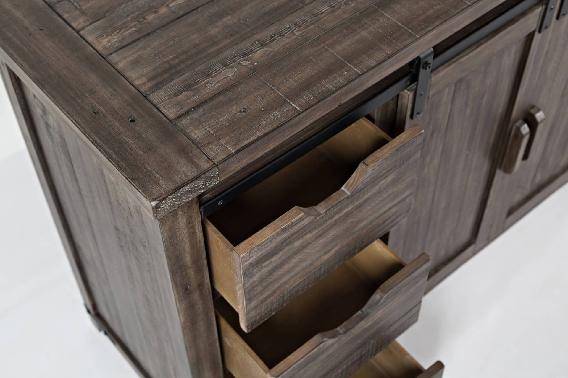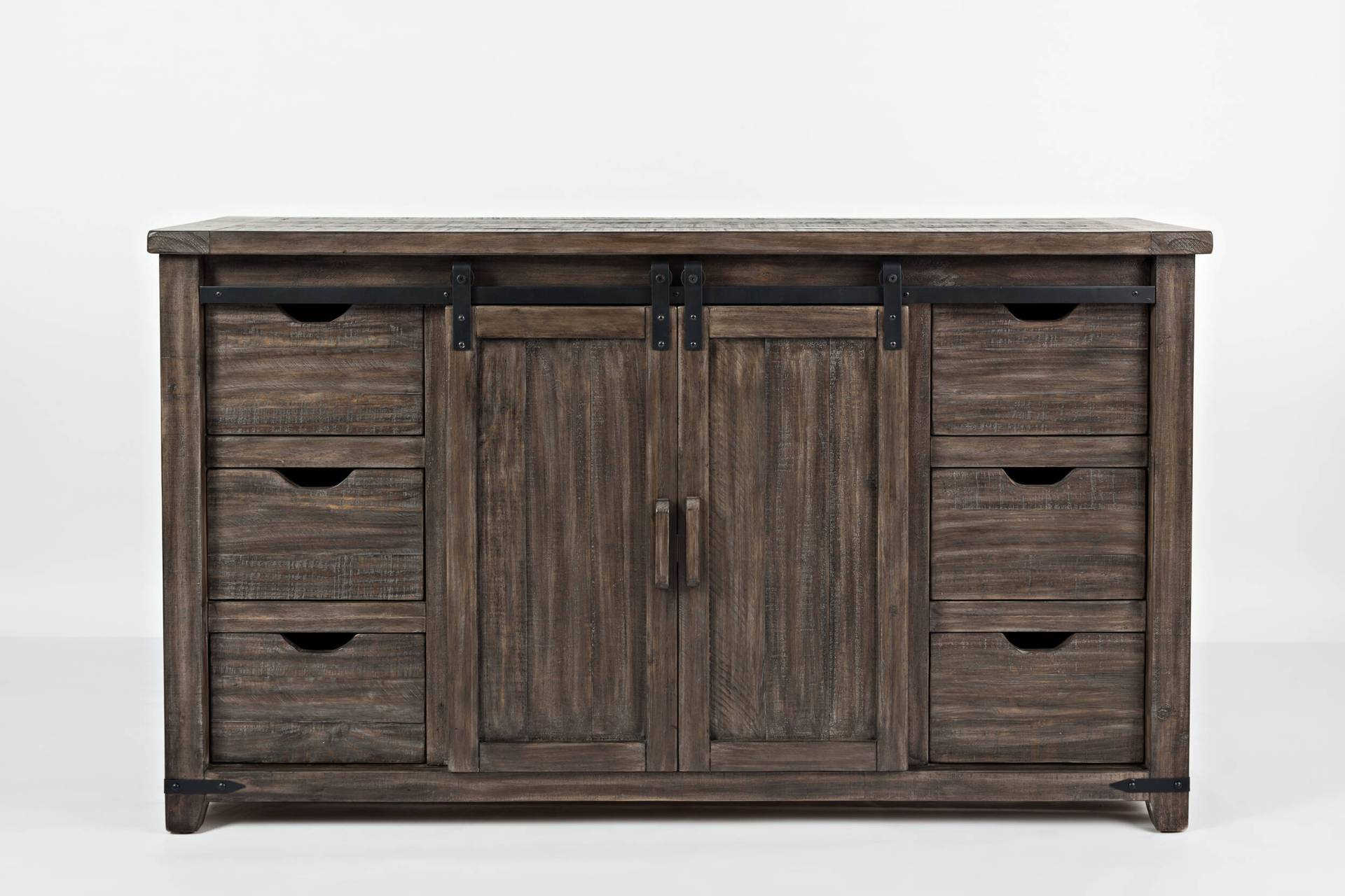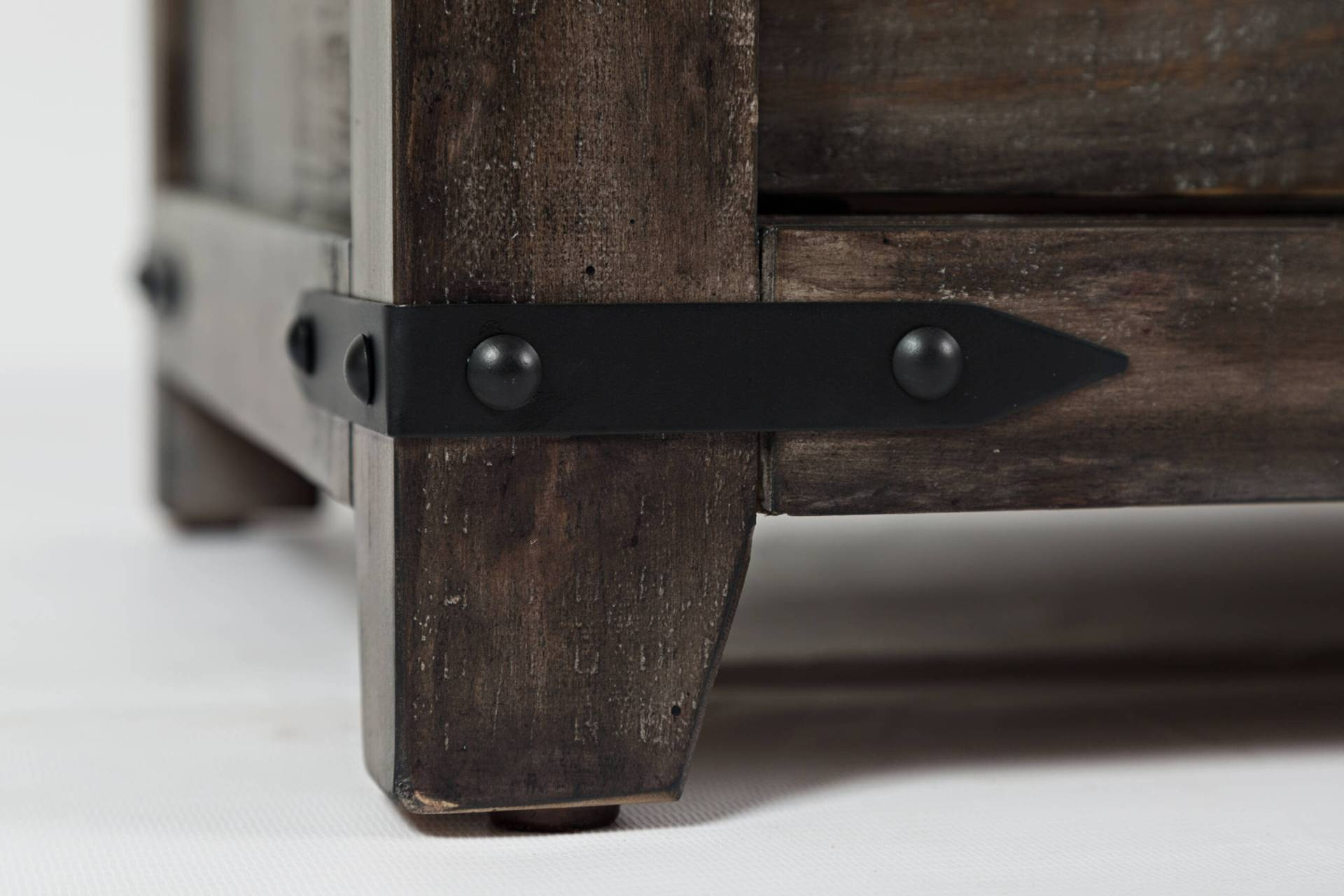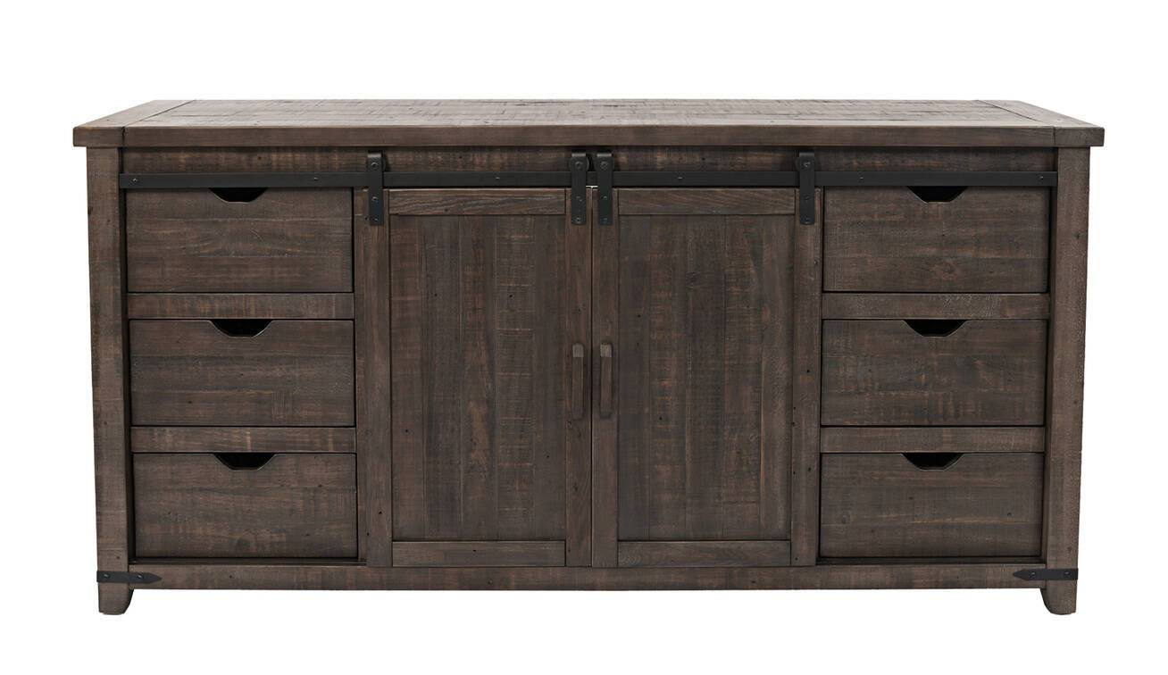 - Komoda o szerokości 178 cm z dwojgiem drzwi, sześcioma szufladami i jedną półką. Wykonana z drewna sosnowego z recyklingu w kolorze ciemnobrązowym w stylu rustykalnym.